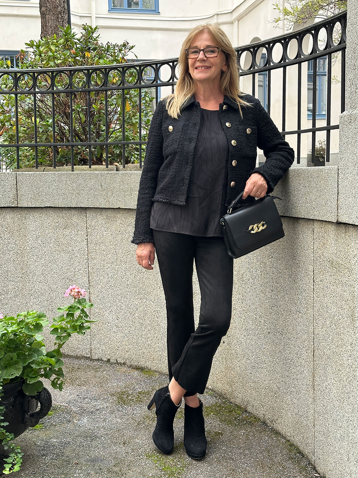Stretchig "dra-på-byxa" från Joseph Ribkoff i en snygg mockaimitation. Byxan är hellång med hög midja och rakt ben.