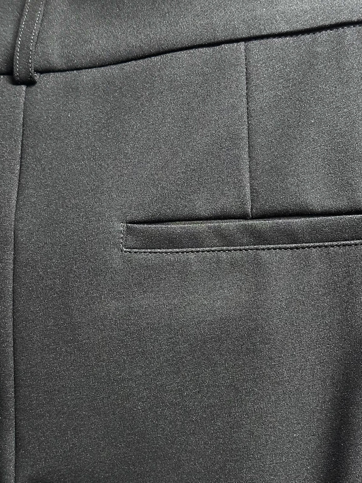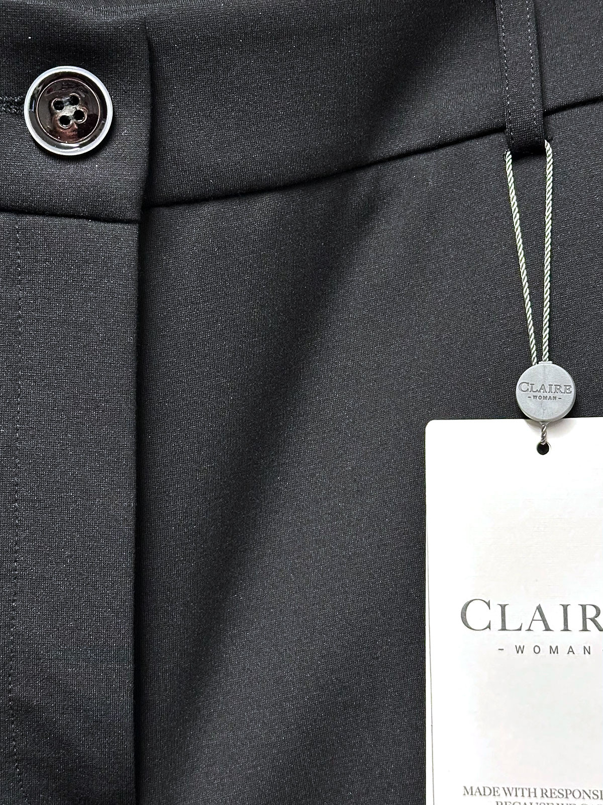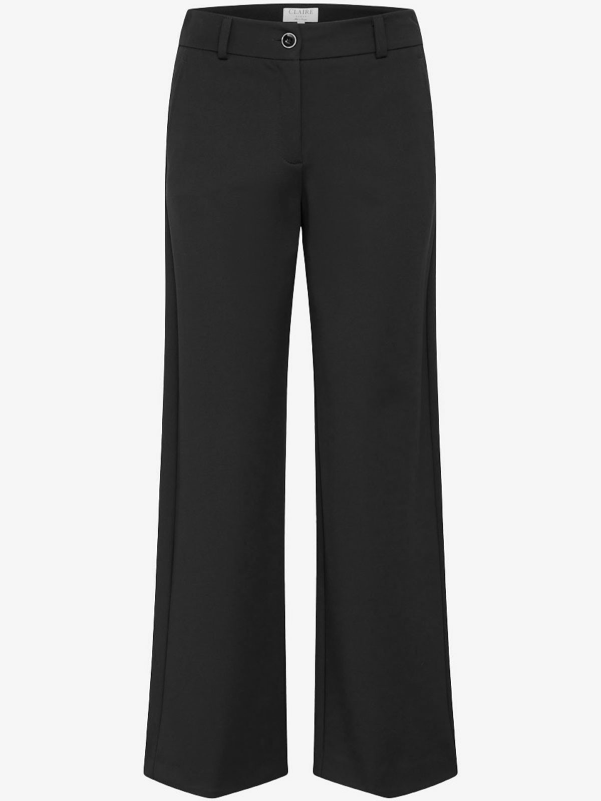 Snygg trikåbyxa från Claire med djup svärta och stretchigt, skrynkelfritt tyg. Modellen är rak och har fast linning med hällor, knapp och gylf. Snedställda fickor på sidorna och en passpoalficka på höger baksida. En perfekt kombination av snygg kostymbyxa i superskön trikå.