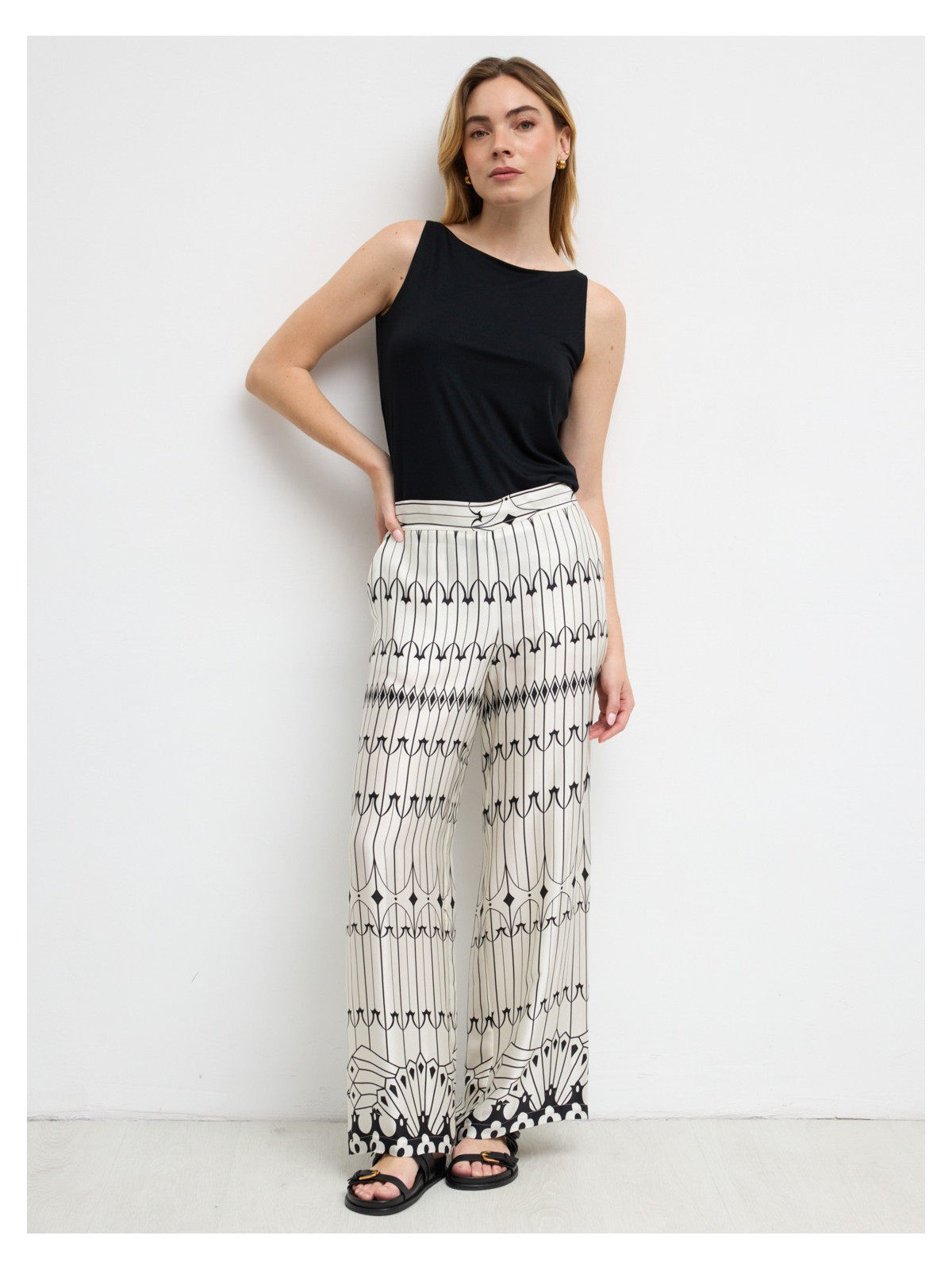 Dessa byxor från Tinta Style kombinerar komfort med ett grafiskt och elegant uttryck. De är designade med vida ben och ett mjukt fall som skapar en smickrande silhuett och ger en avslappnad men stilfull känsla. Det dekorativa mönstret i svart på ljus botten ger byxorna karaktär och ett modernt, sofistikerat uttryck.
