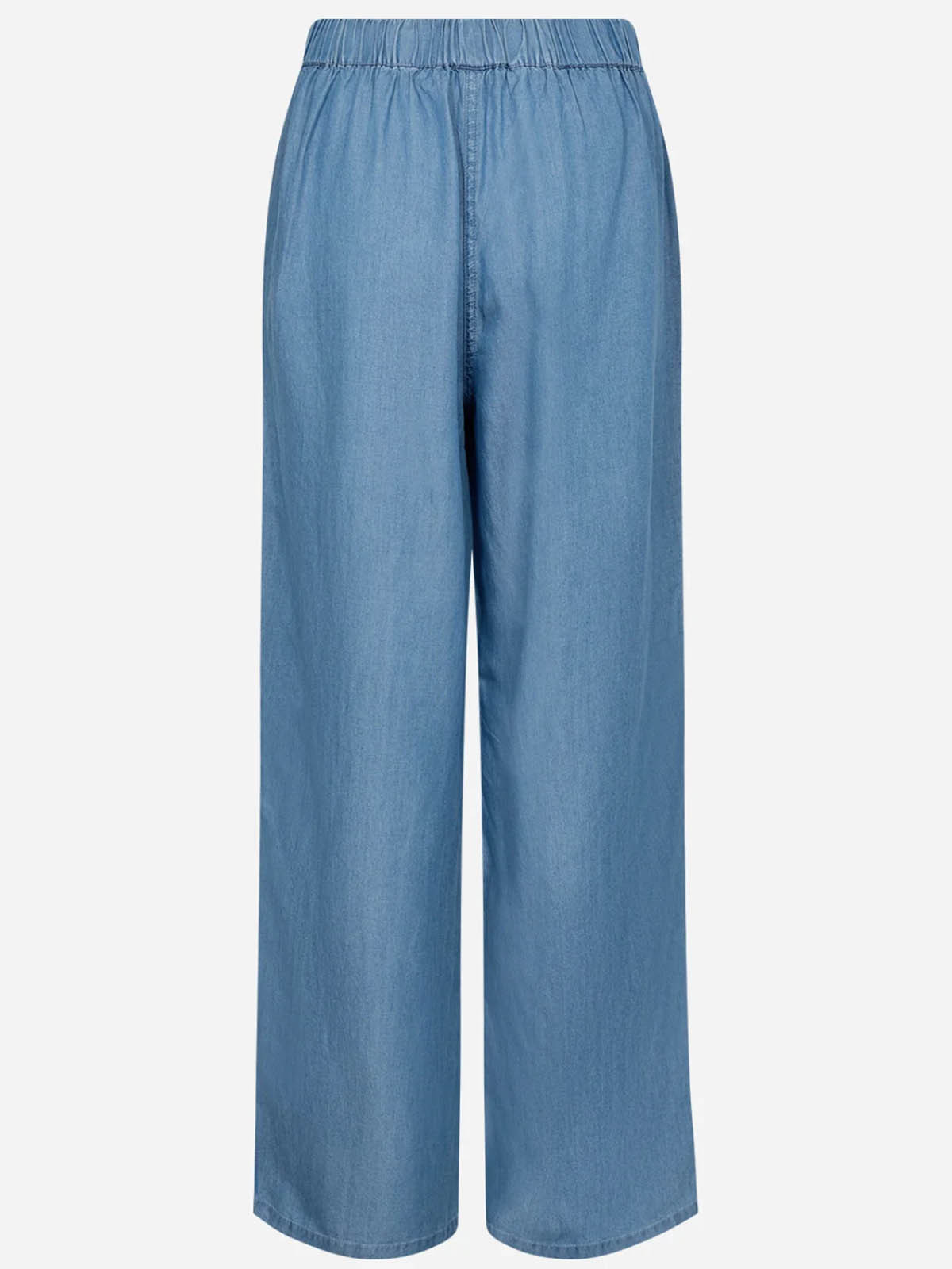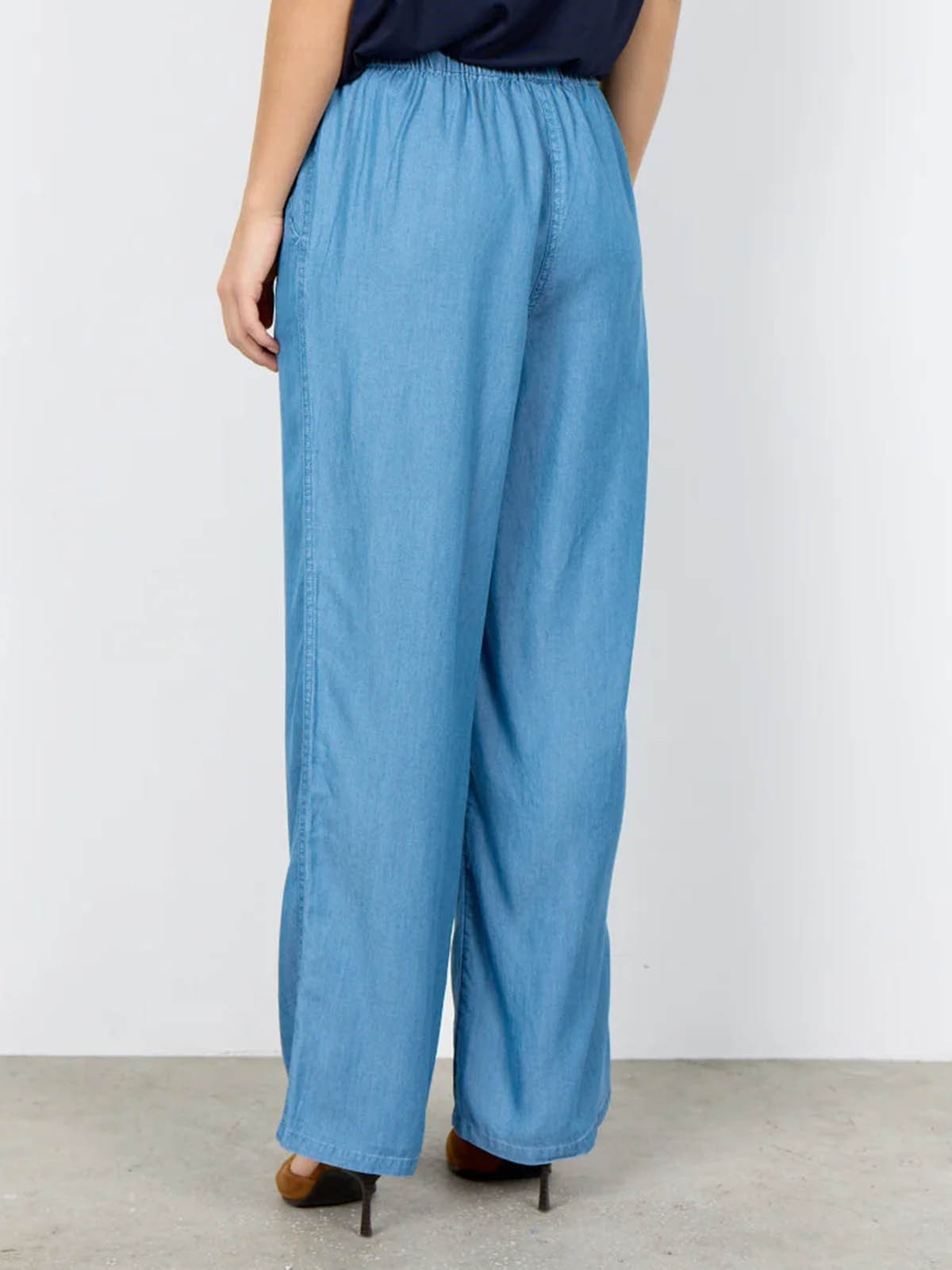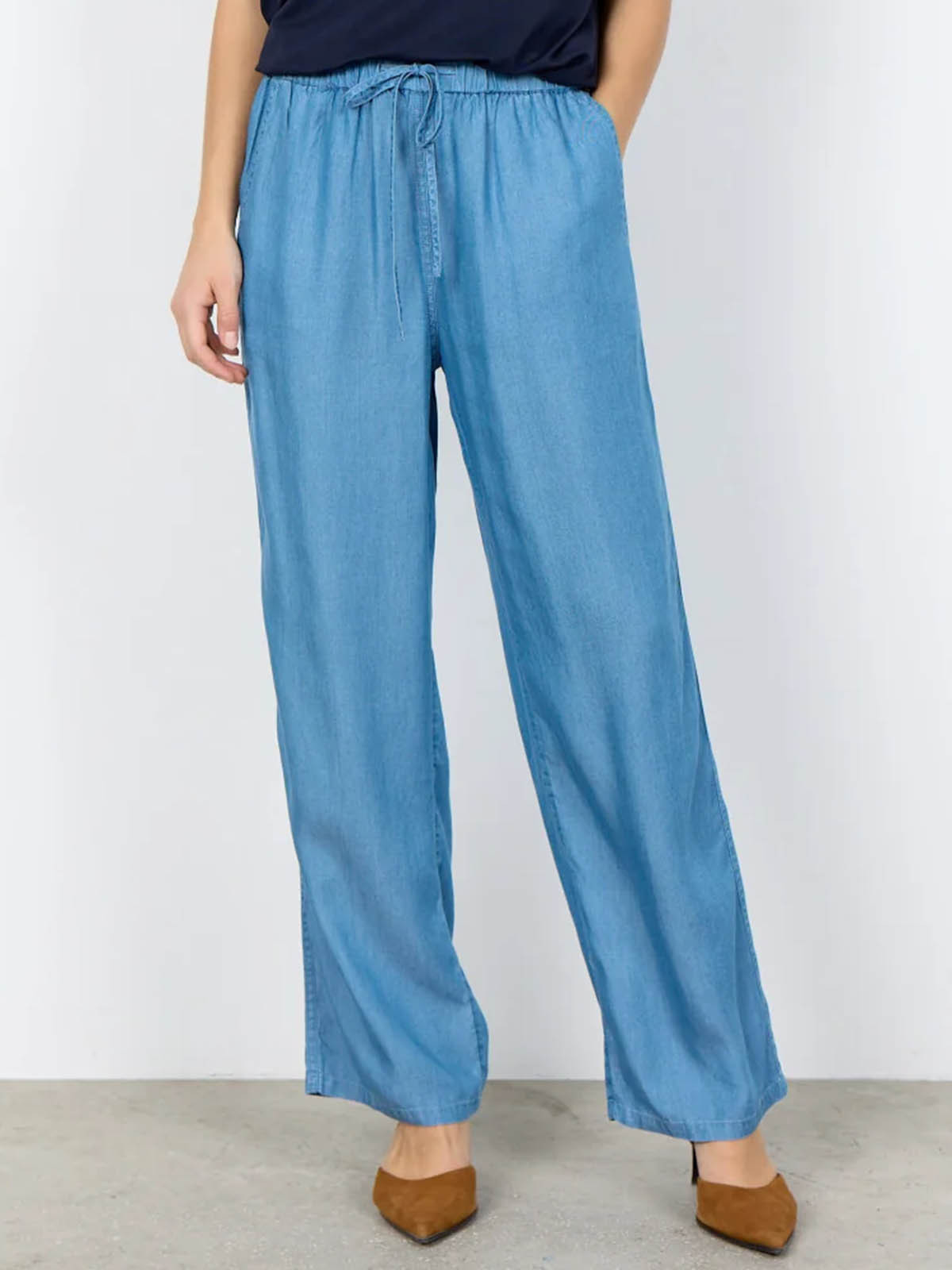 Härlig byxa från SoyaConcept i 100% lyocell. Modellen är vid med raka ben och bred resår med dragsko i midjan. På sidorna finns snedställda fickor. Inga fickor bak.