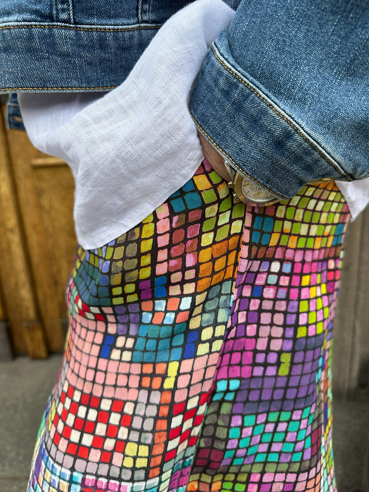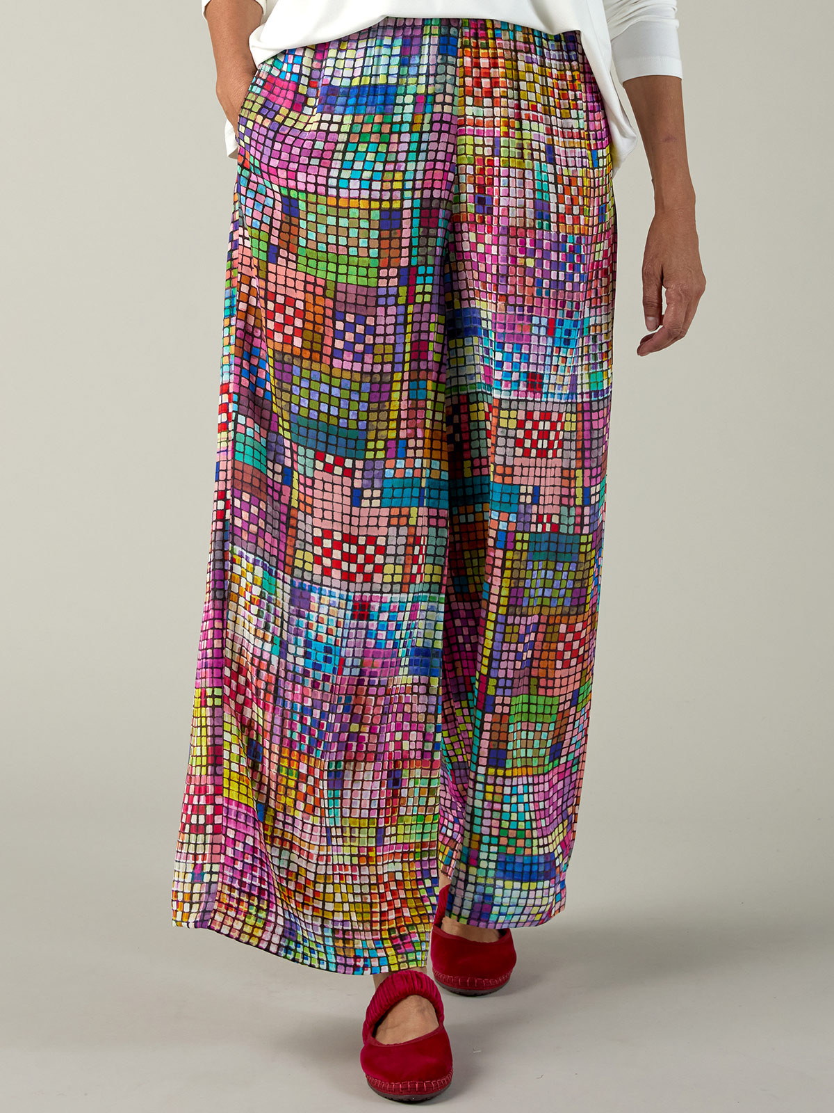 Vid och rak viskosbyxa från Sahara i ett färgstarkt rutmönster. Modellen har vidd och är en dra-på-byxa med bred resår i midjan. I sidsömmarna döljer sig fickor.