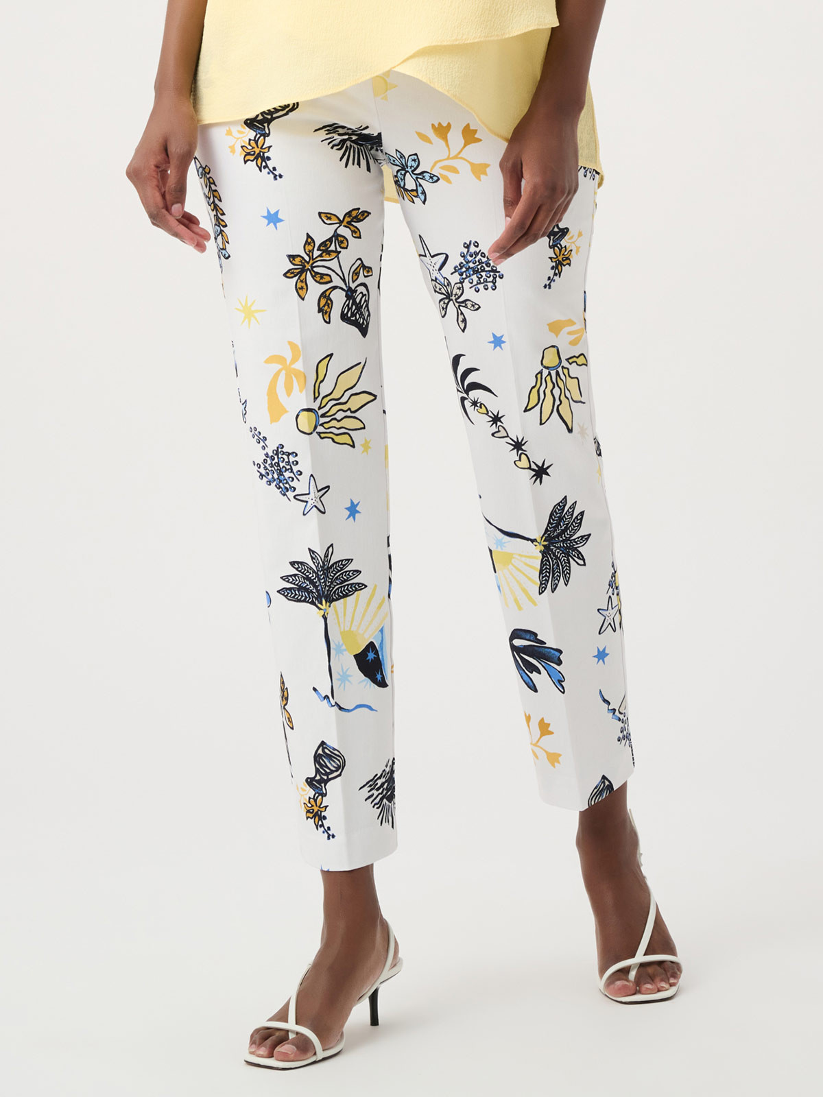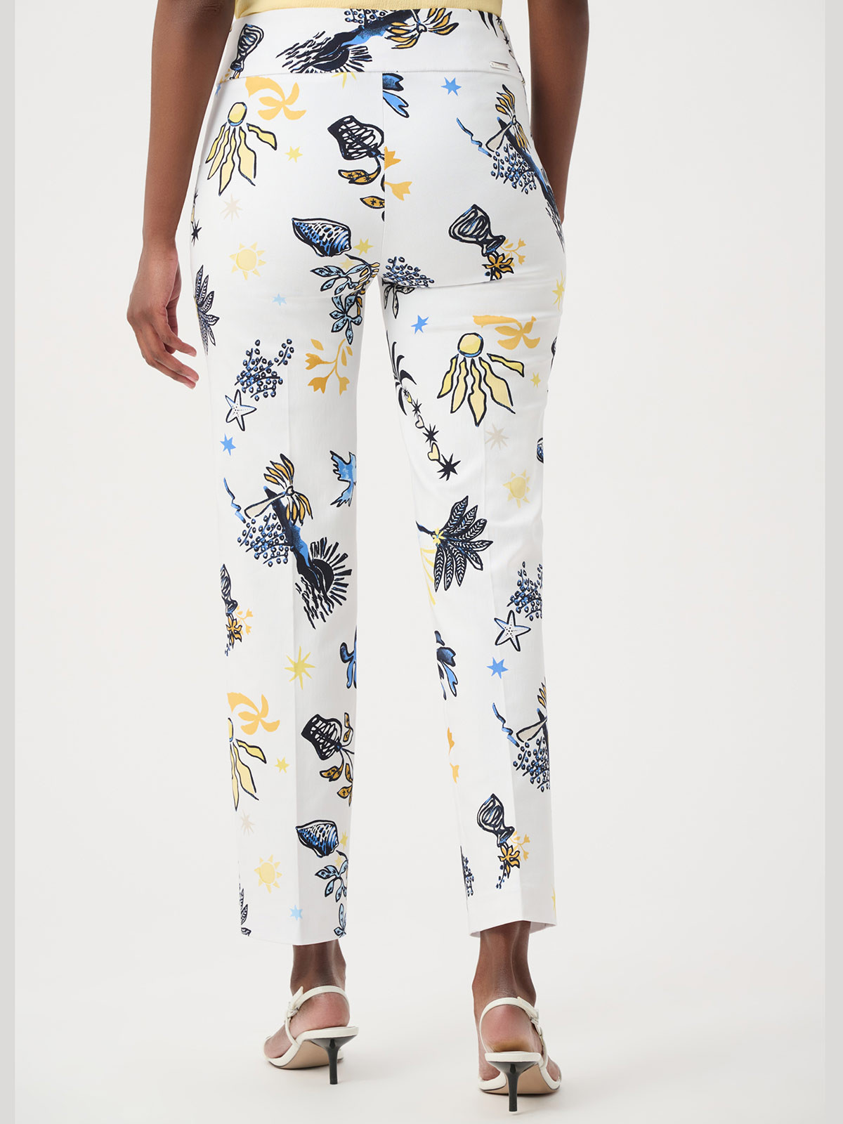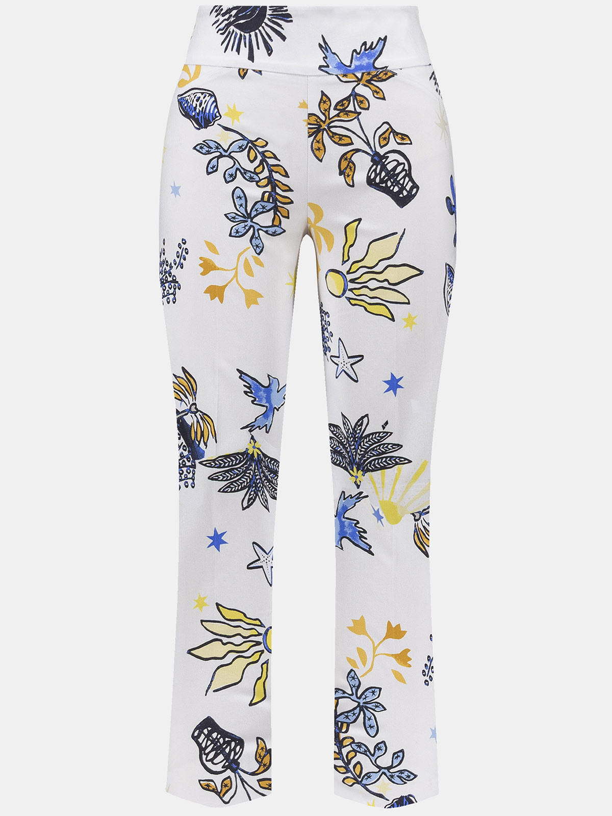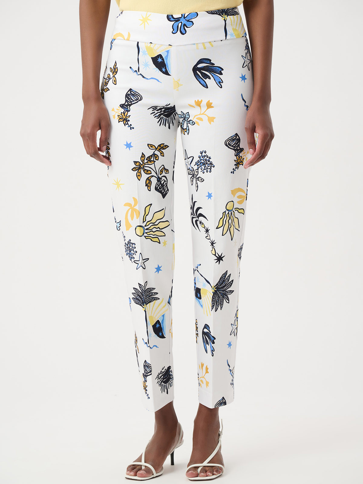 En elegant och stretchig snyggbyxa från Joseph Ribkoff. Modellen är rak och av stretchig dra-på-modell med bred dold resår. Utan fickor. Härligt mönster som går i havets tema.