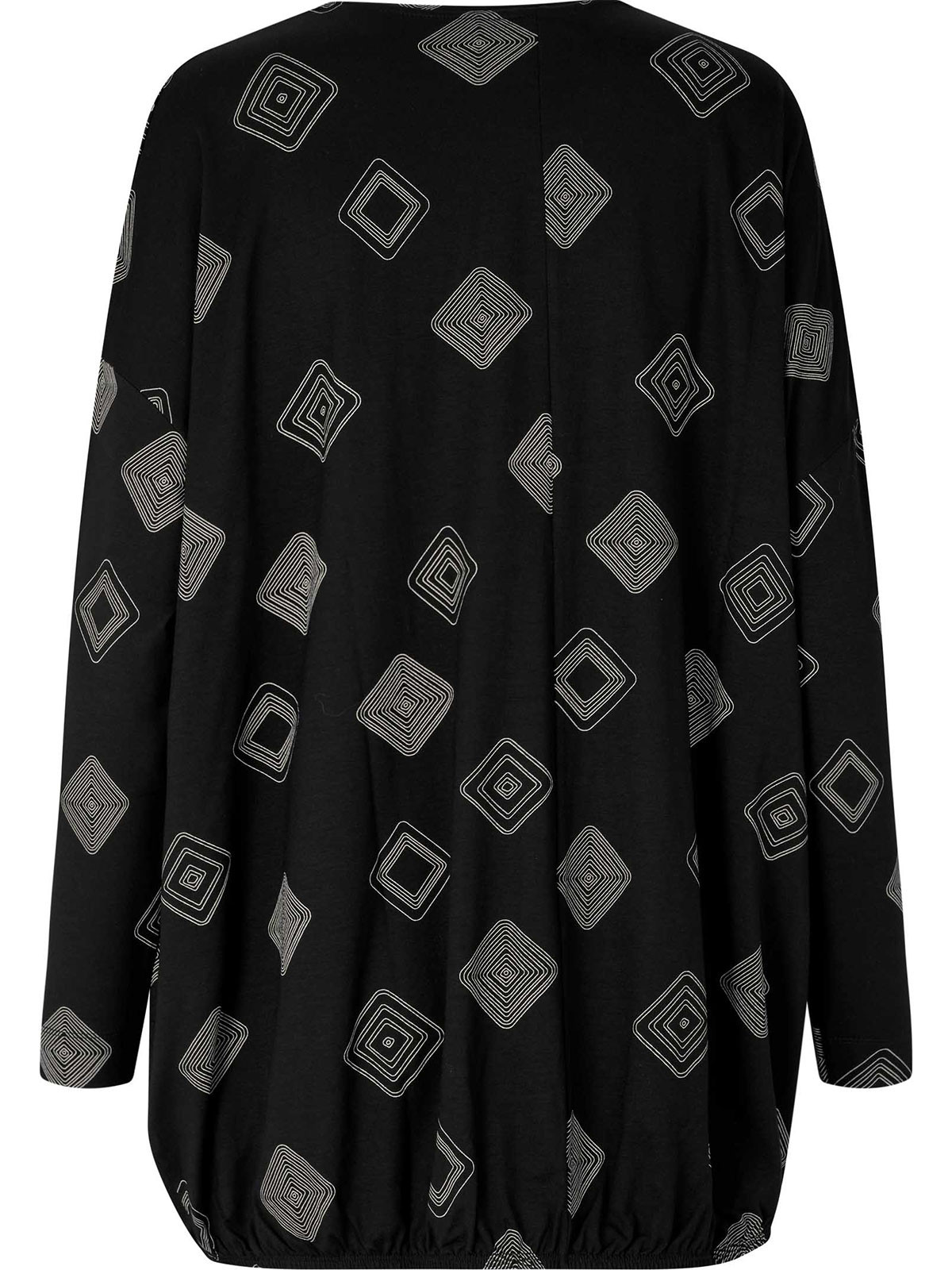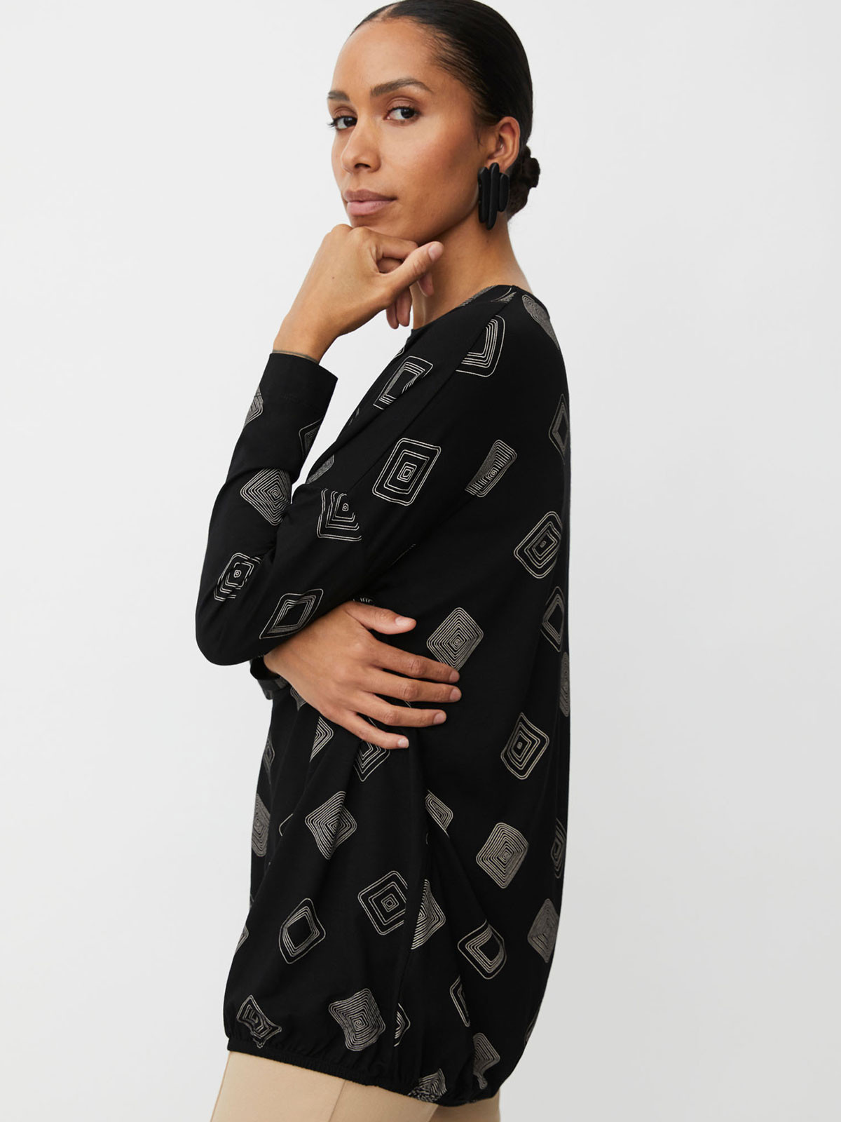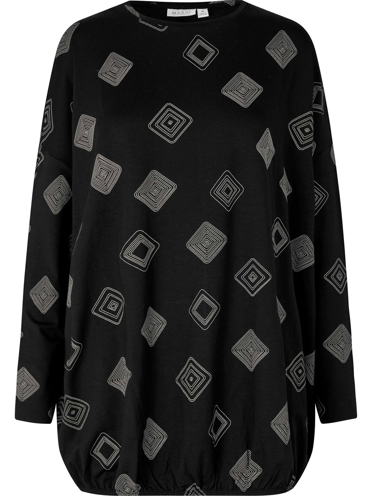 En snyggt grafiskt mönstrad trikåtunika från danska Masai. Modellen Baggy är vid och generös och har en sammandragande resårkant nertill. Halsen är rundringad och ärmen smal. Tygkvaliteten är i mjuk och skön viskos.