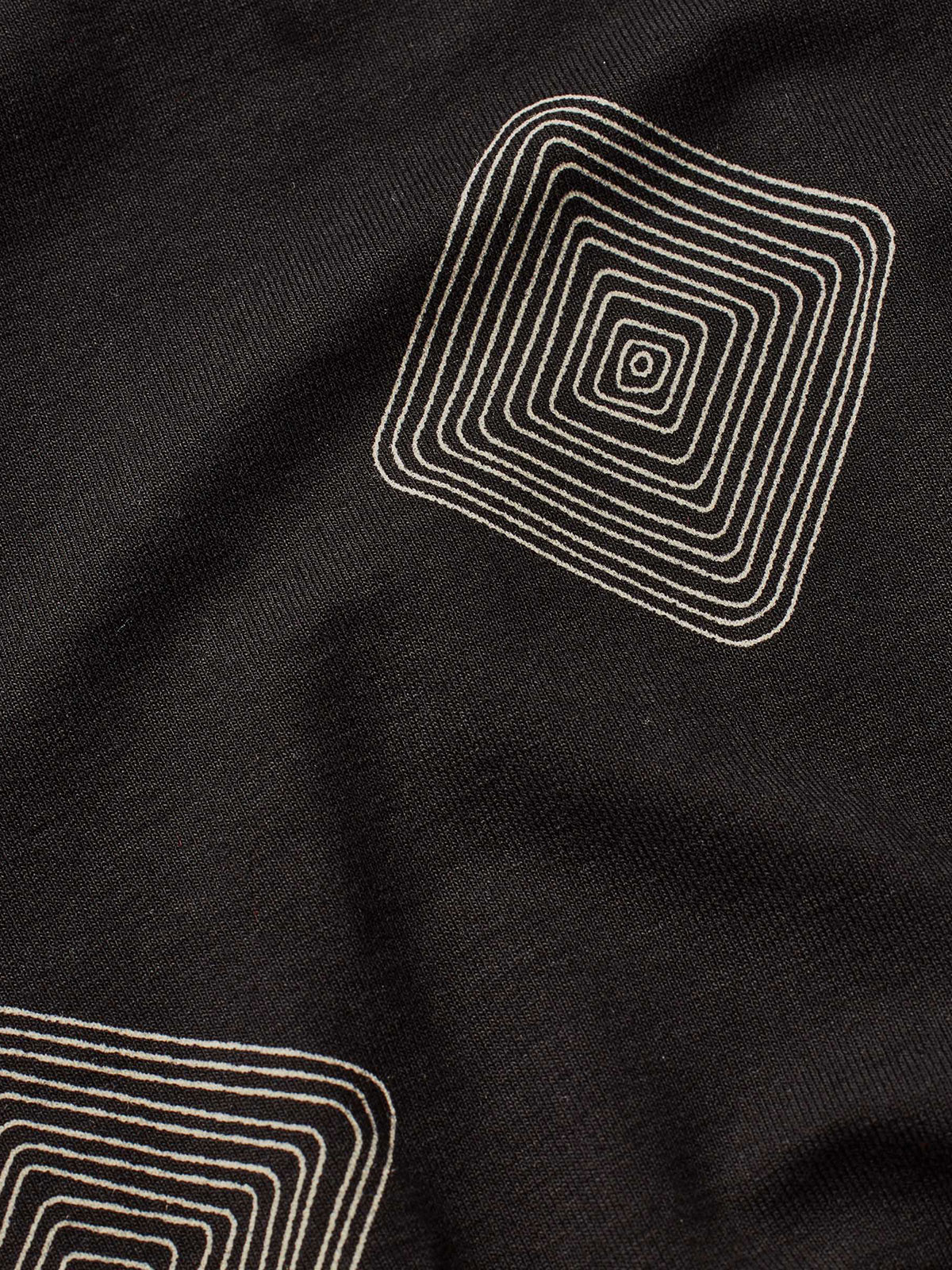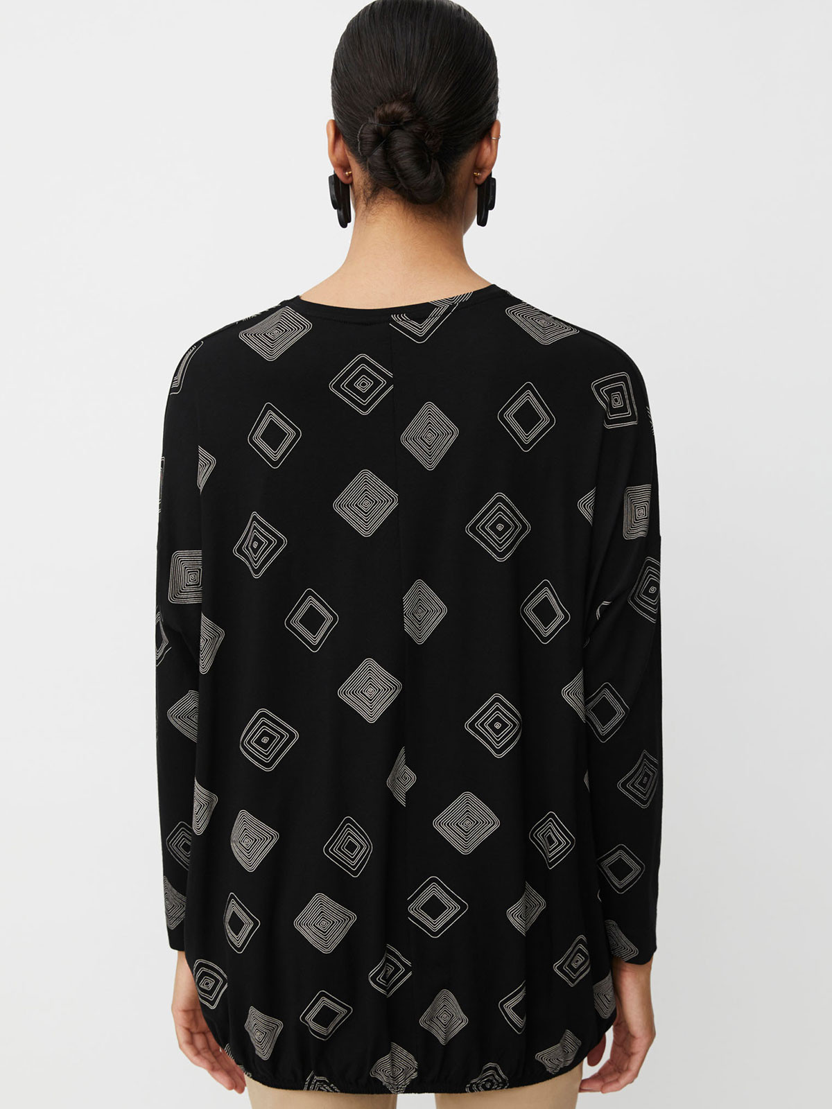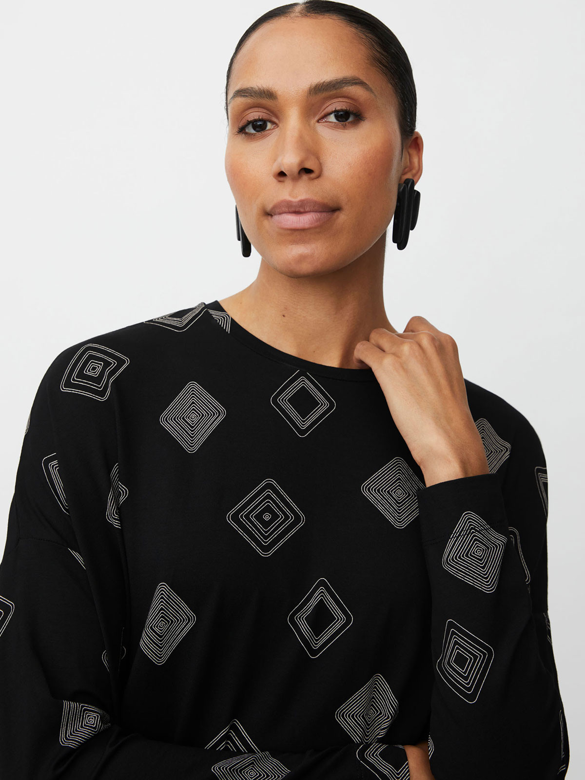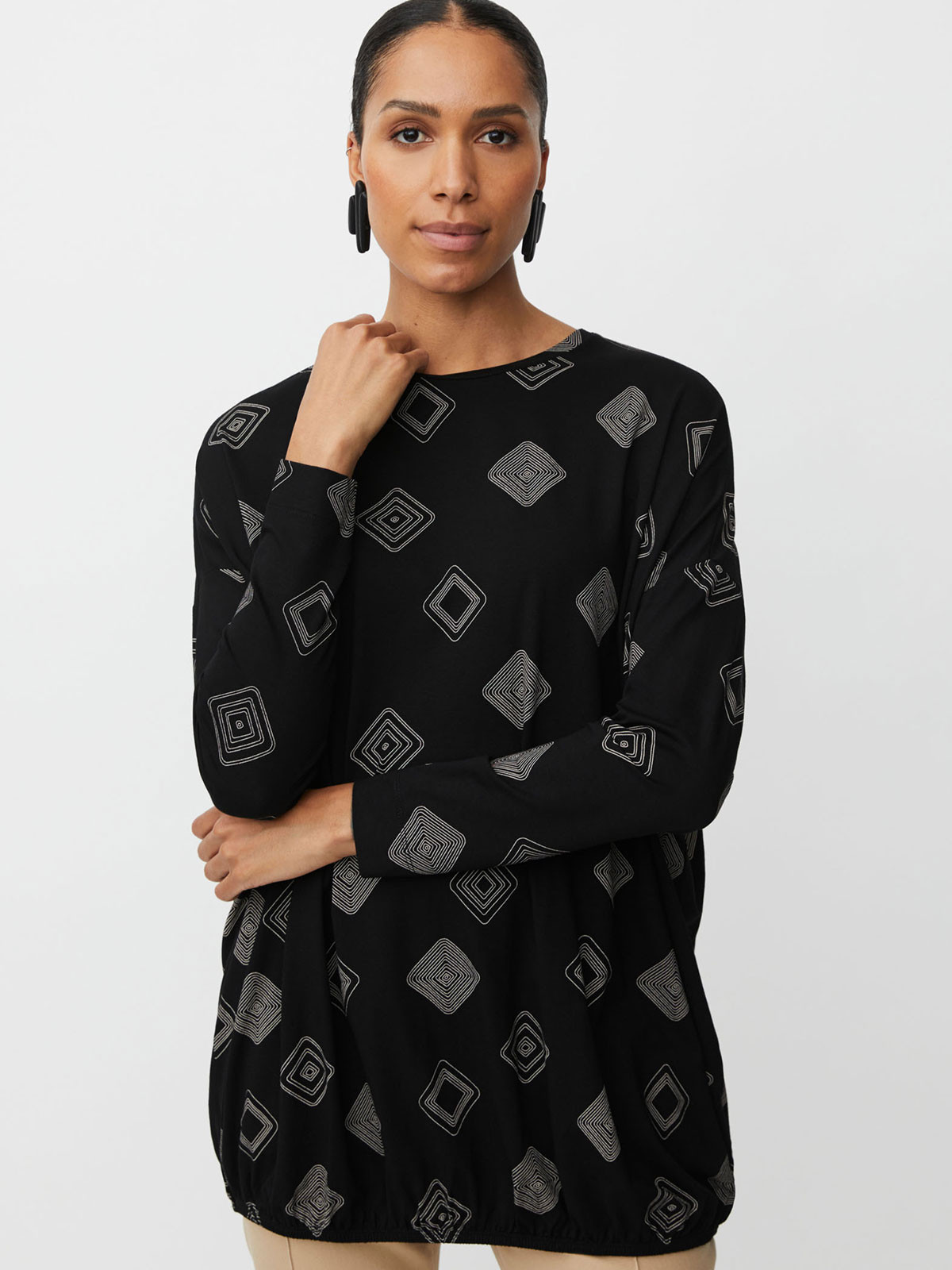 En snyggt grafiskt mönstrad trikåtunika från danska Masai. Modellen Baggy är vid och generös och har en sammandragande resårkant nertill. Halsen är rundringad och ärmen smal. Tygkvaliteten är i mjuk och skön viskos.