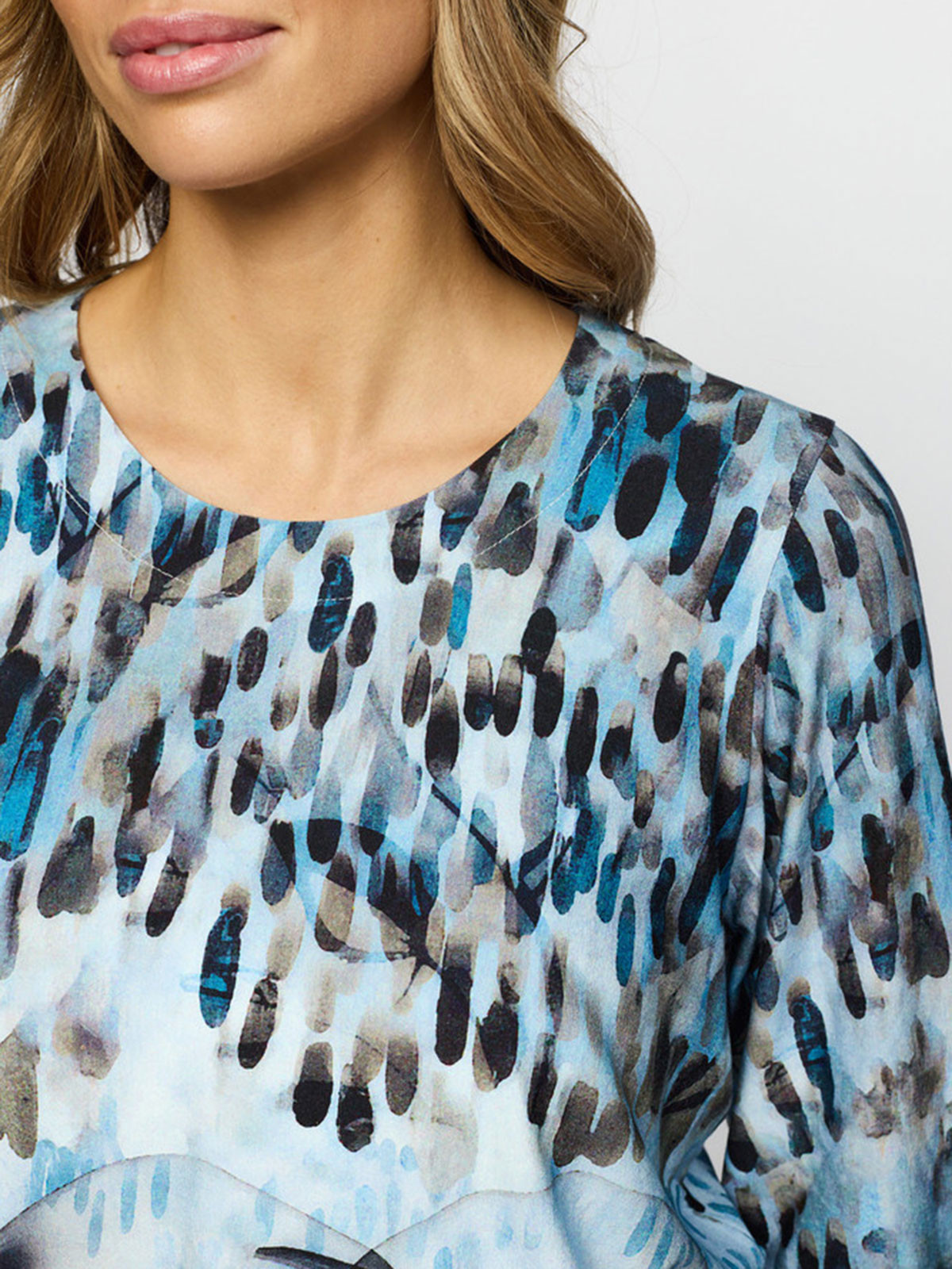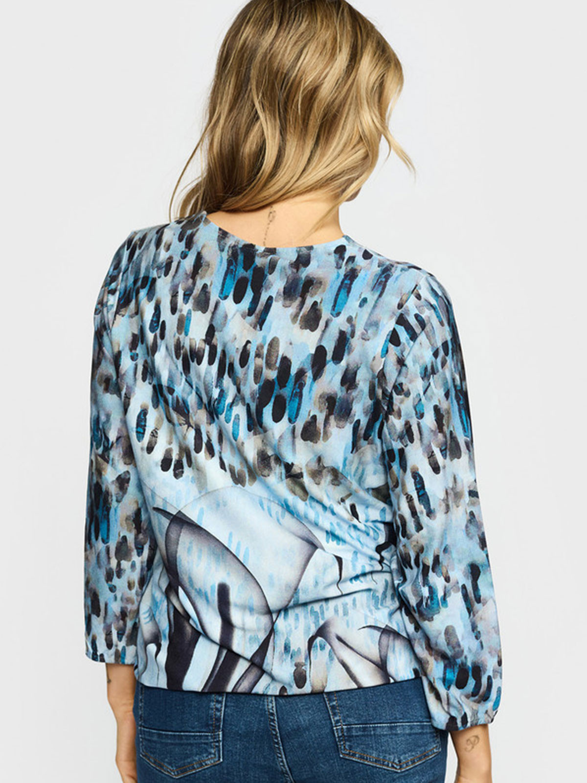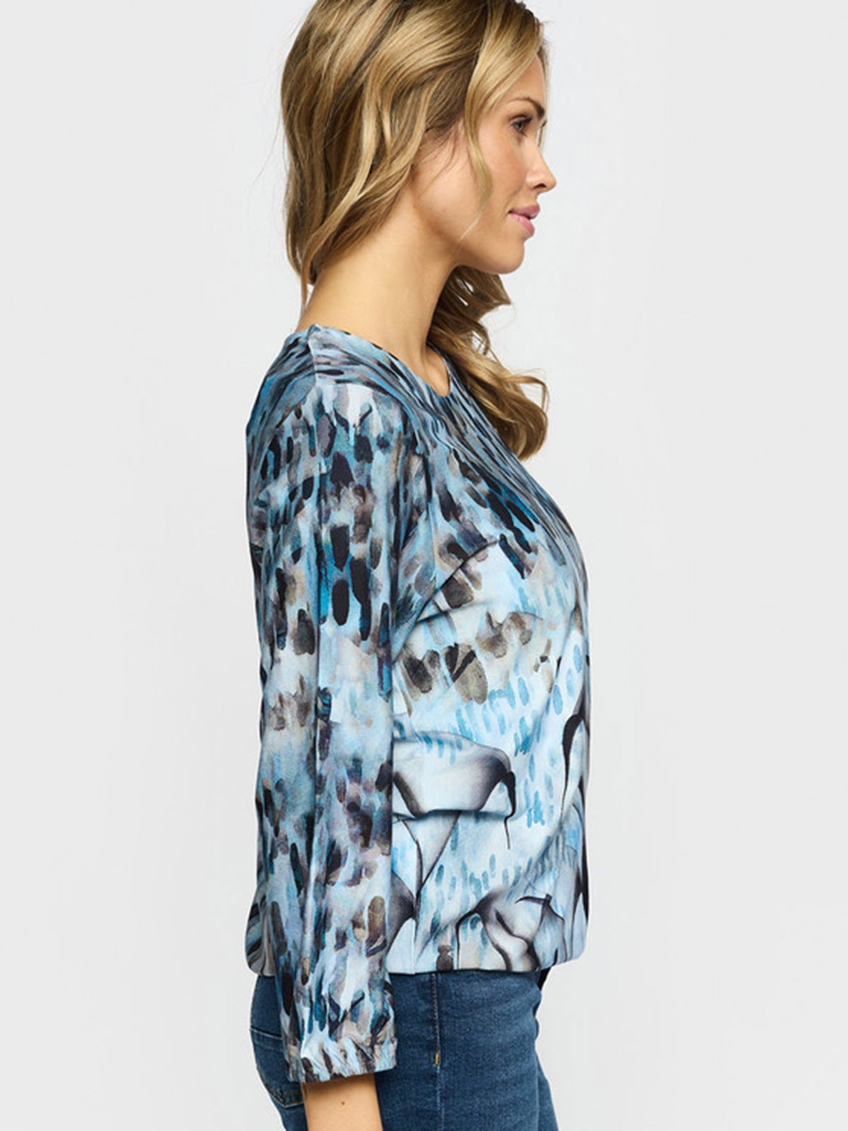 Härlig trikåtopp från 2-BIZ! Modellen har resår i nederkant som gör att den blusar sig fint. Ärmen har trekvartslängd och avslutas med resår.