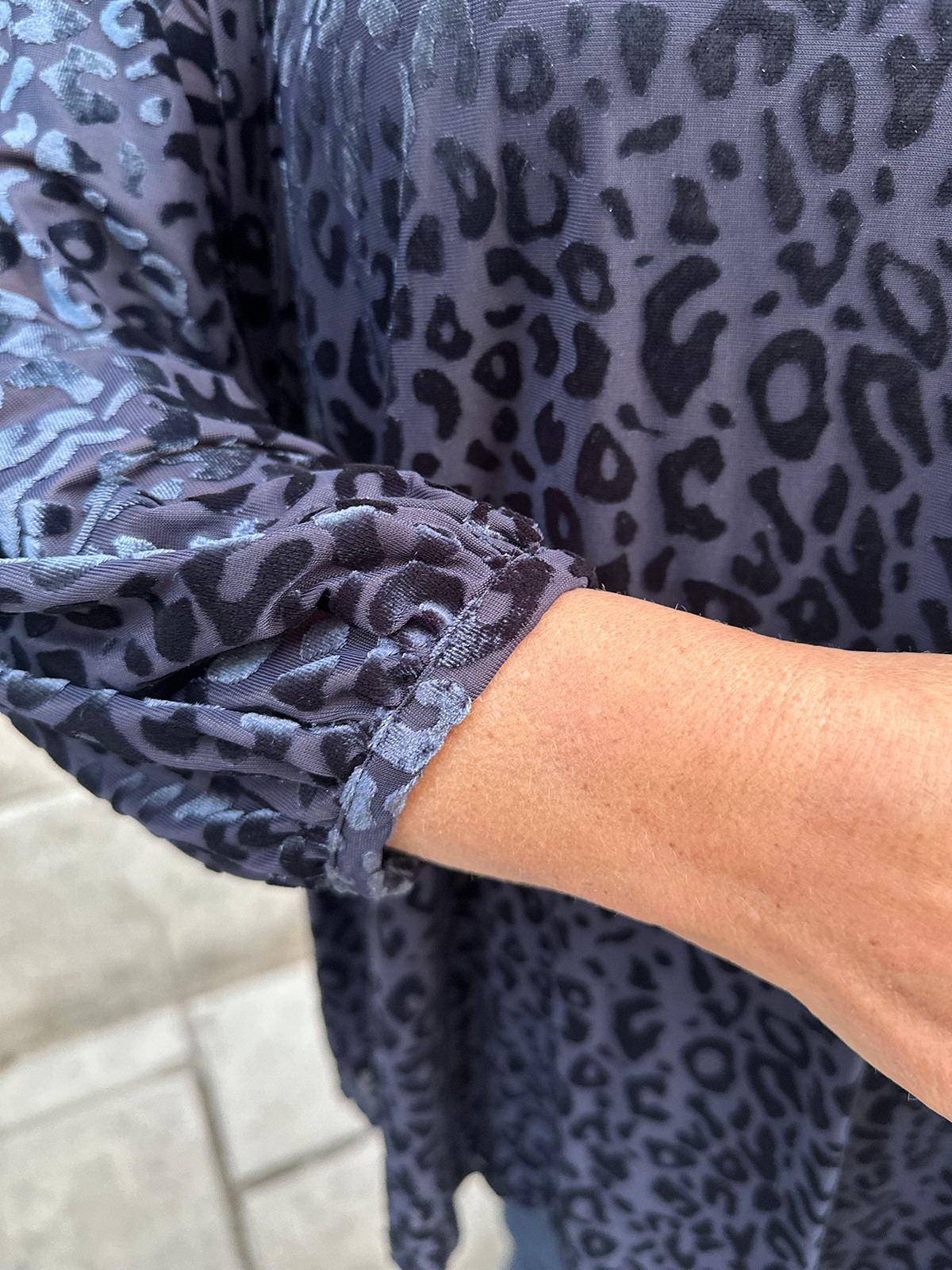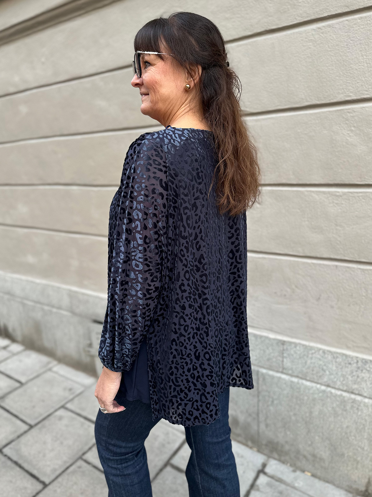 Elegant topp från Allison med leomönster i sammet på ett stretchigt chiffongtyg med genomlys. Modellen är vid och ledig, har rundad hals och trekvartslång ärm med resår i nederkant. Den är fodrad med ett trikålinne som hindrar att din BH syns igenom. Slitsar i sidorna.