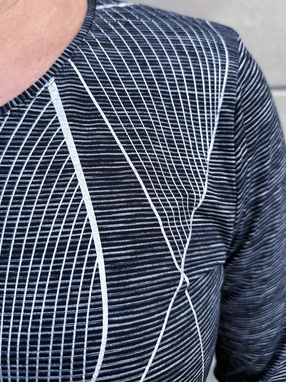 En klassisk bastopp från Gabriella K i en skön viskostrikå med silverdekor.