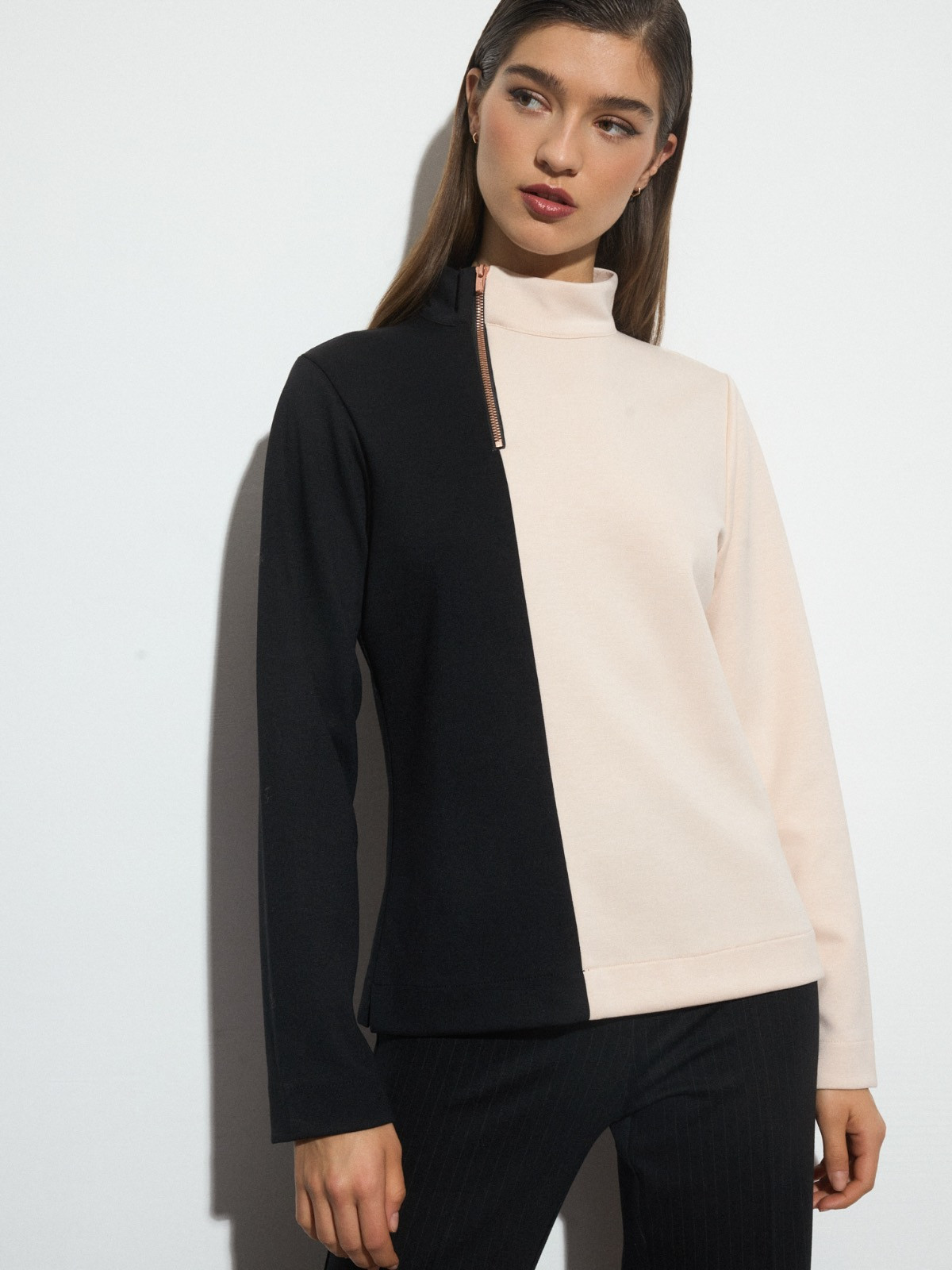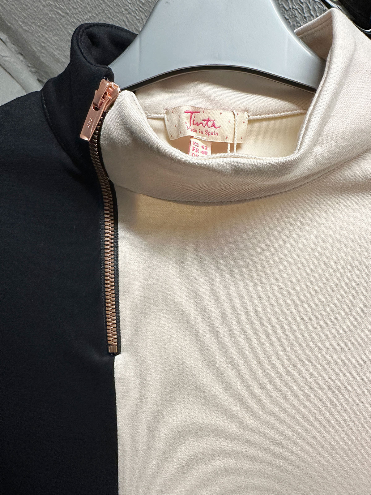 Läcker trikåtröja från Tinta Style i tudelad färgställning. Modellen är lätt figursydd och den högra halsen kan justeras med en dekorativ dragkedja. Hellång ärm och rak nedekant.