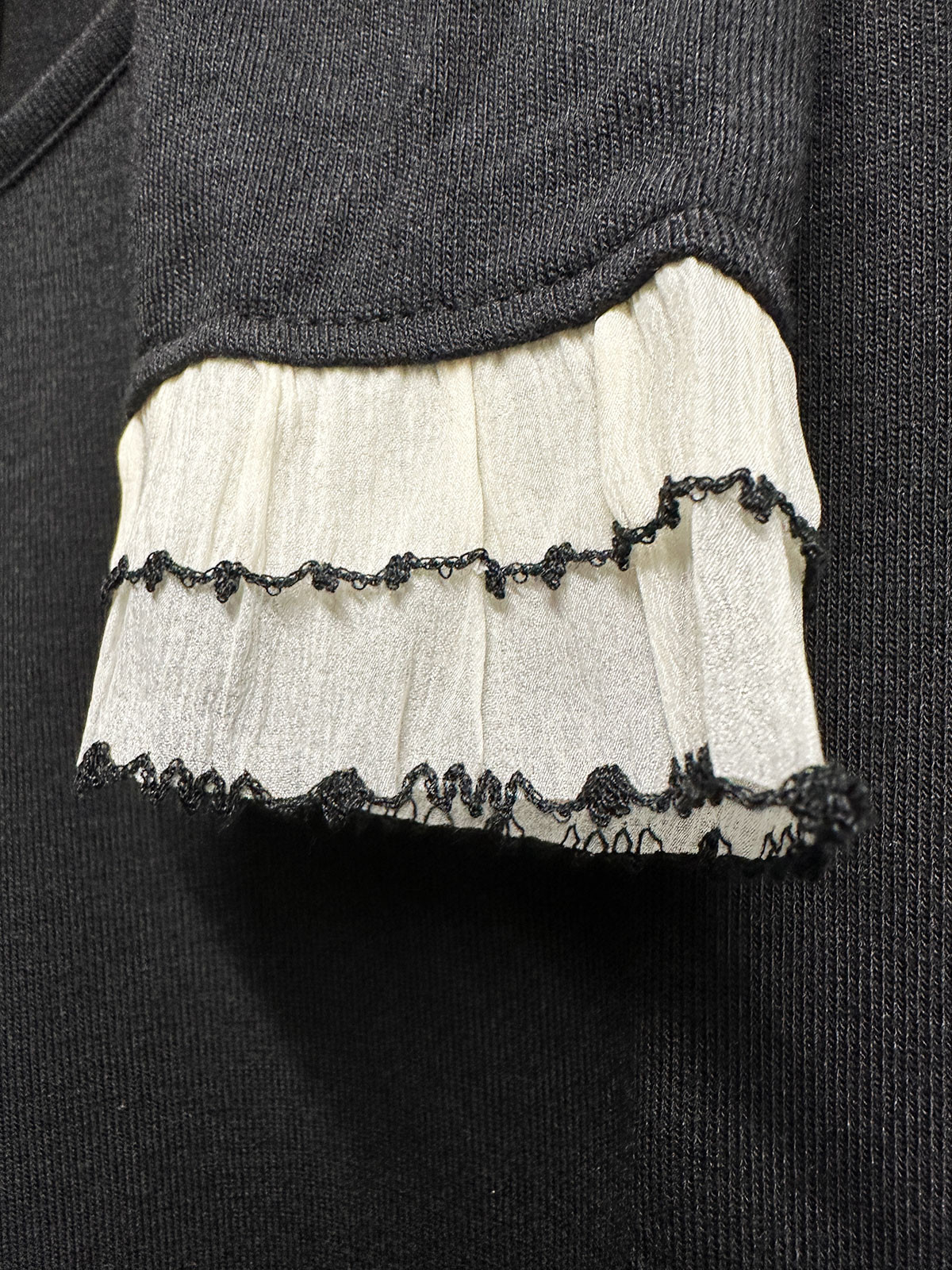 Söt finstickad trikåtopp från Bariloche med en läcker blomapplikation på. Modellen rak med rak nederkant och har en mjukt V-ringad hals. Vid ärmslut finns en superfin volangkant i kontrasterande dubbla rader.