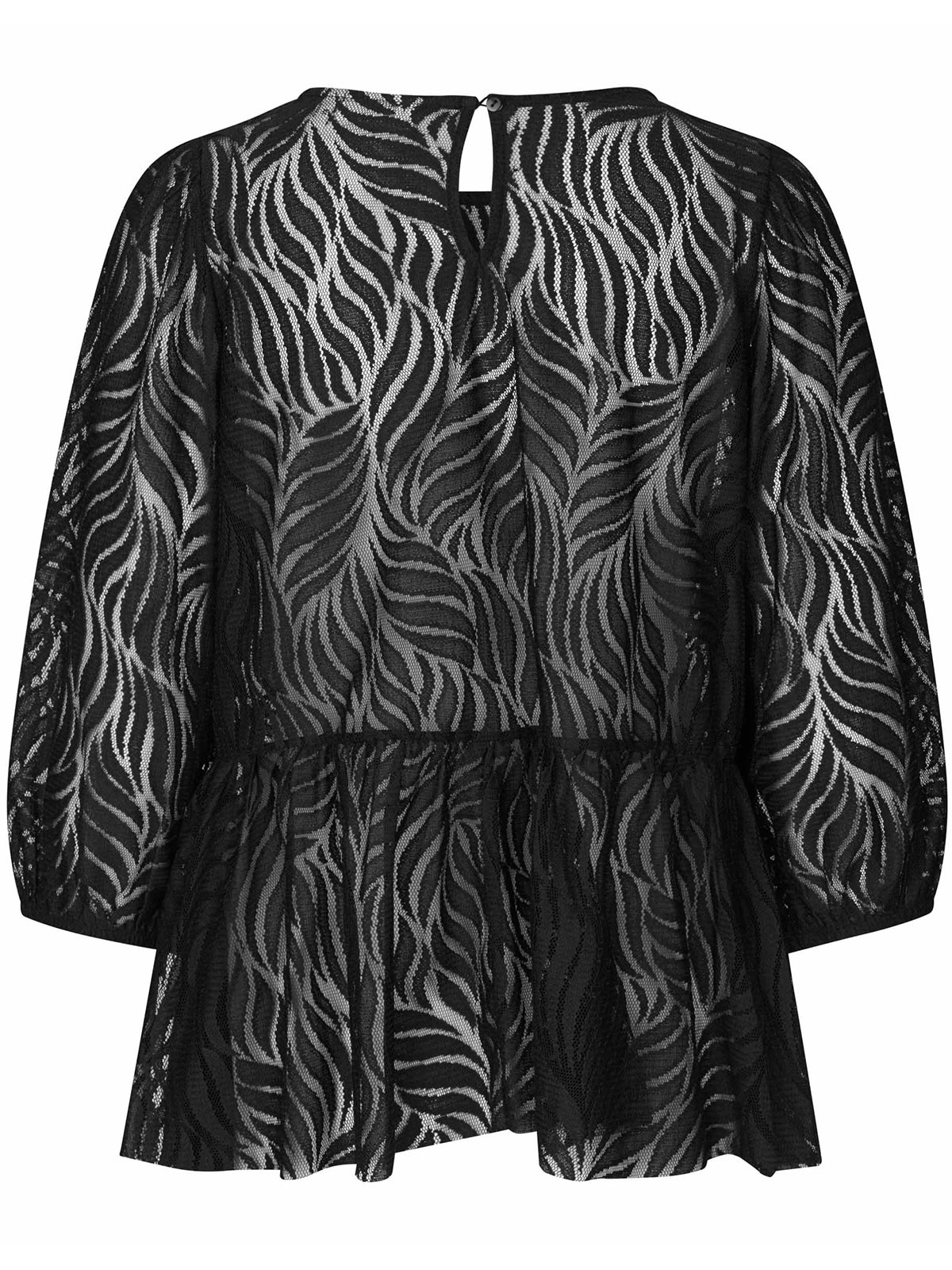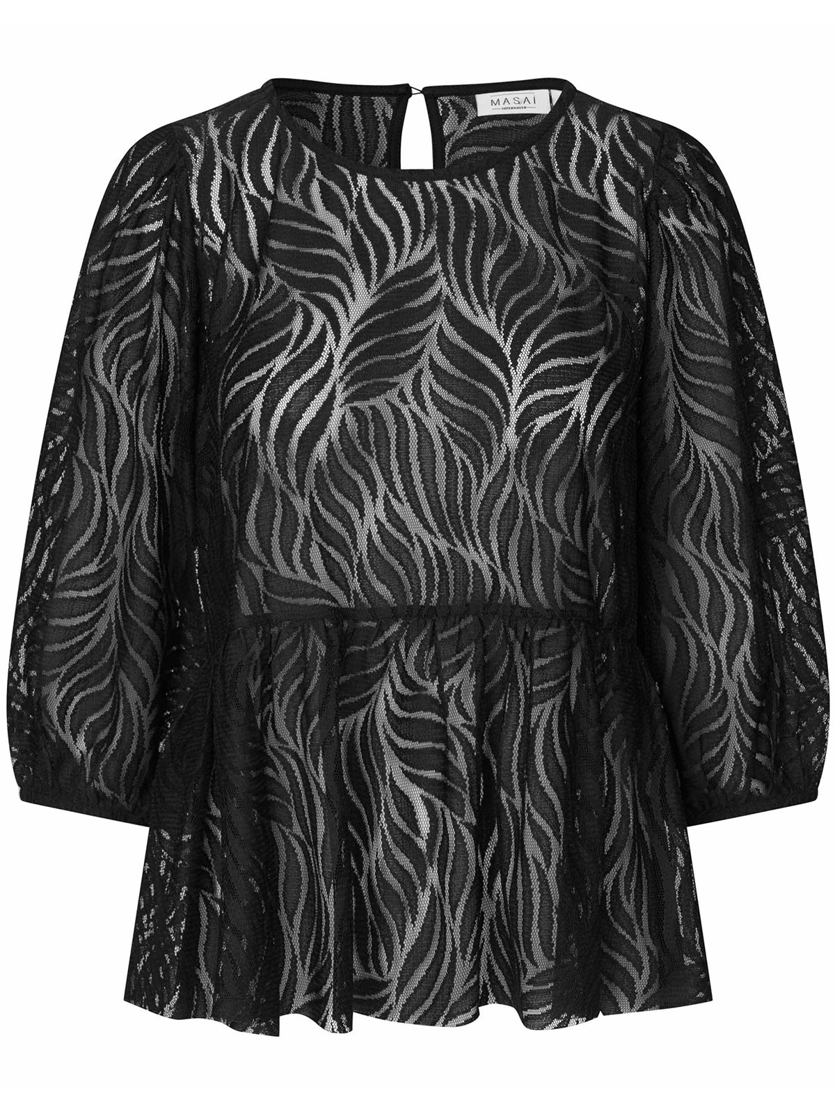 Elegant peplumtopp från Masai i svart spets. Modellen har rundringad hals och knäppning i nacken. Hellång puffärm med resår i nederkant. Toppen är rak och har en volangkant (peplum) från midjan och neråt. Tyget har genomlys så använd ett linne under om du inte vill att din BH ska synas.