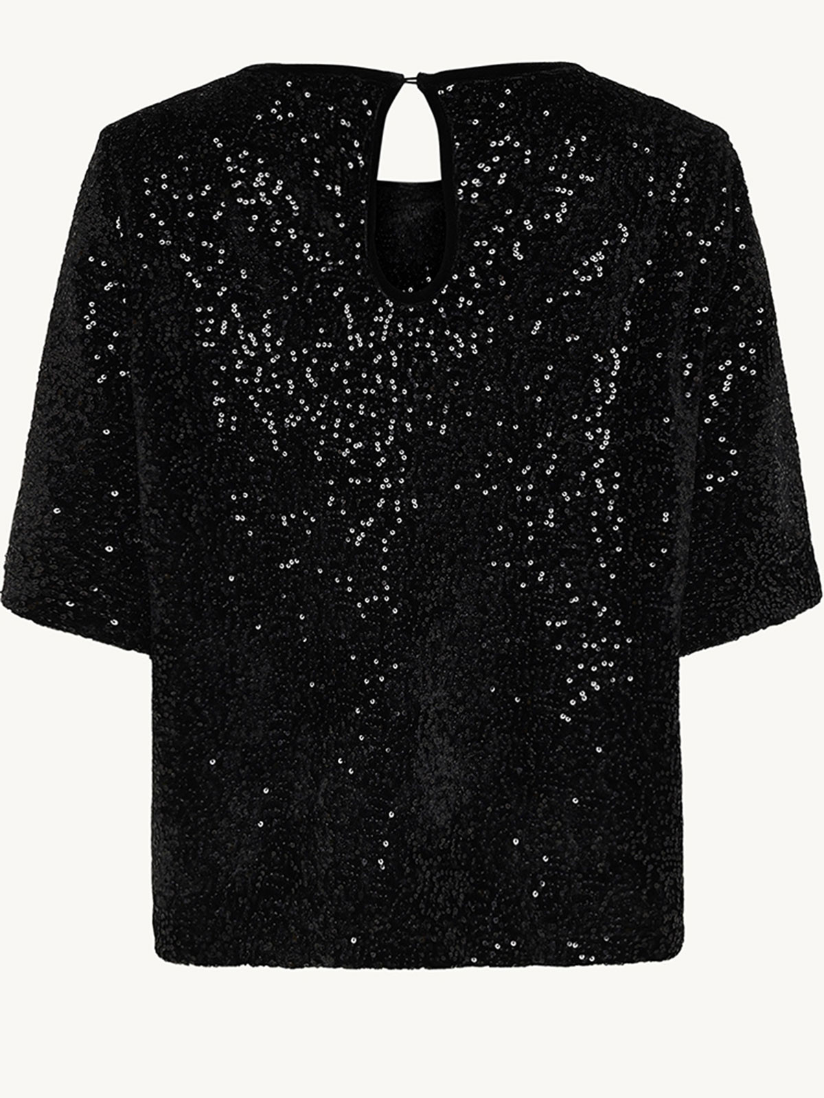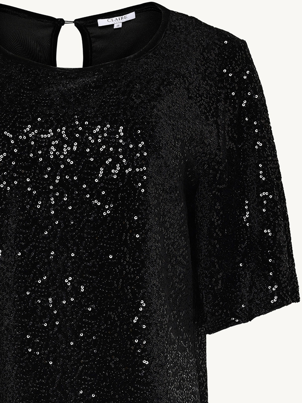Superfin paljettopp från Claire Woman i ett skönt stretchigt tyg. Modellen är som en oversize T-shirt med en rundad öppning i ryggen som stängs med en knapp. Ärmen är klockad och vid och nederkanten rakt avskuren. Helfodrad med mjuk undertröja.