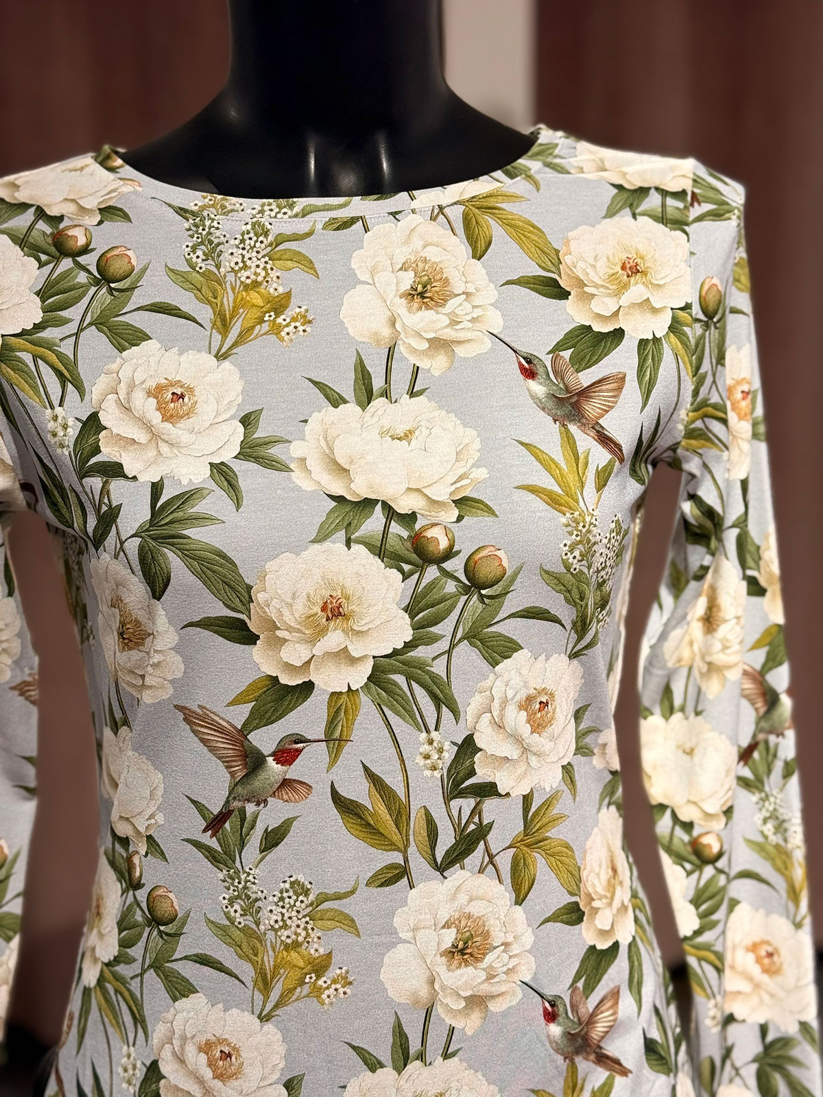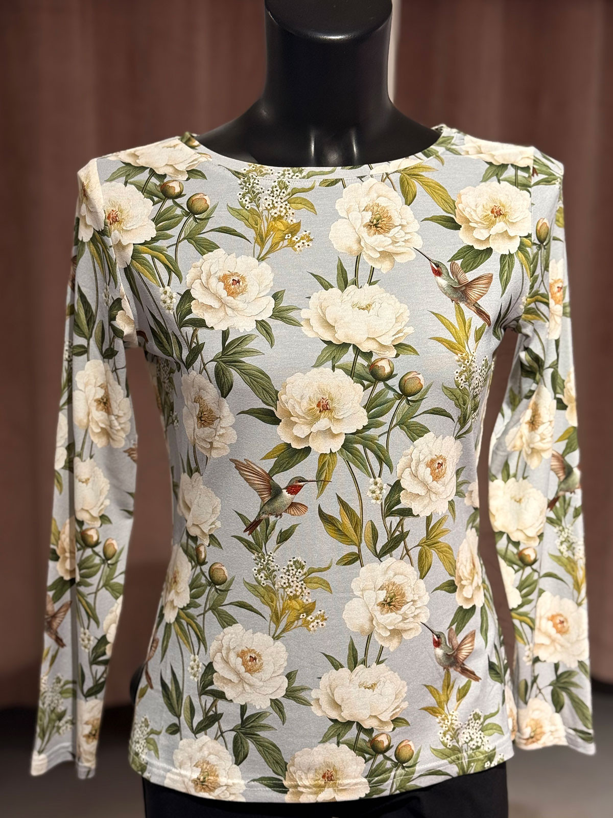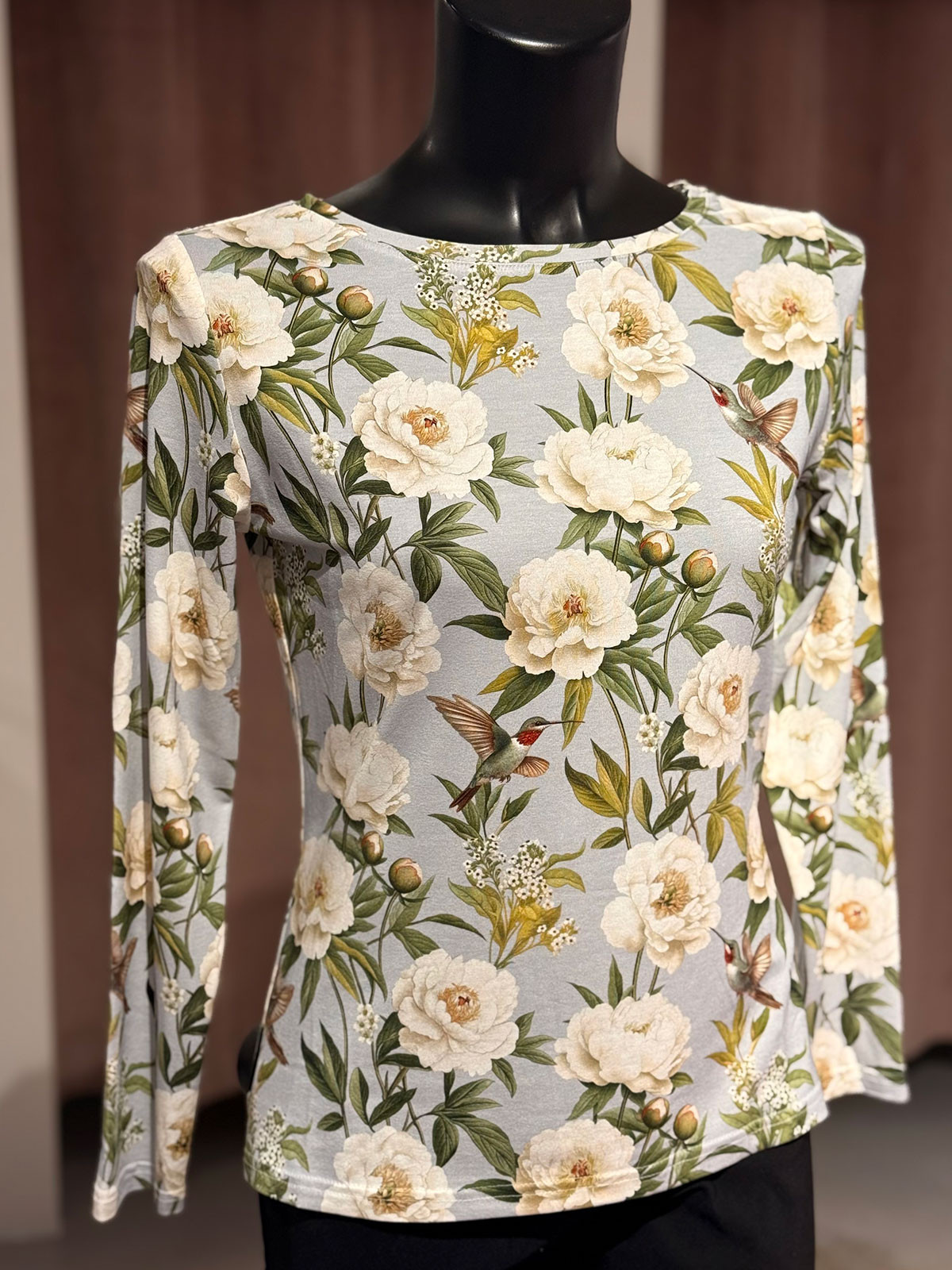 Modellen Bella är en omtyckt överdel från Camilla Thulin, här med ett vackert pionmönster! Den har klassisk skärning med en båtringad hals och lång ärm, den är lite insvängd i midjan.