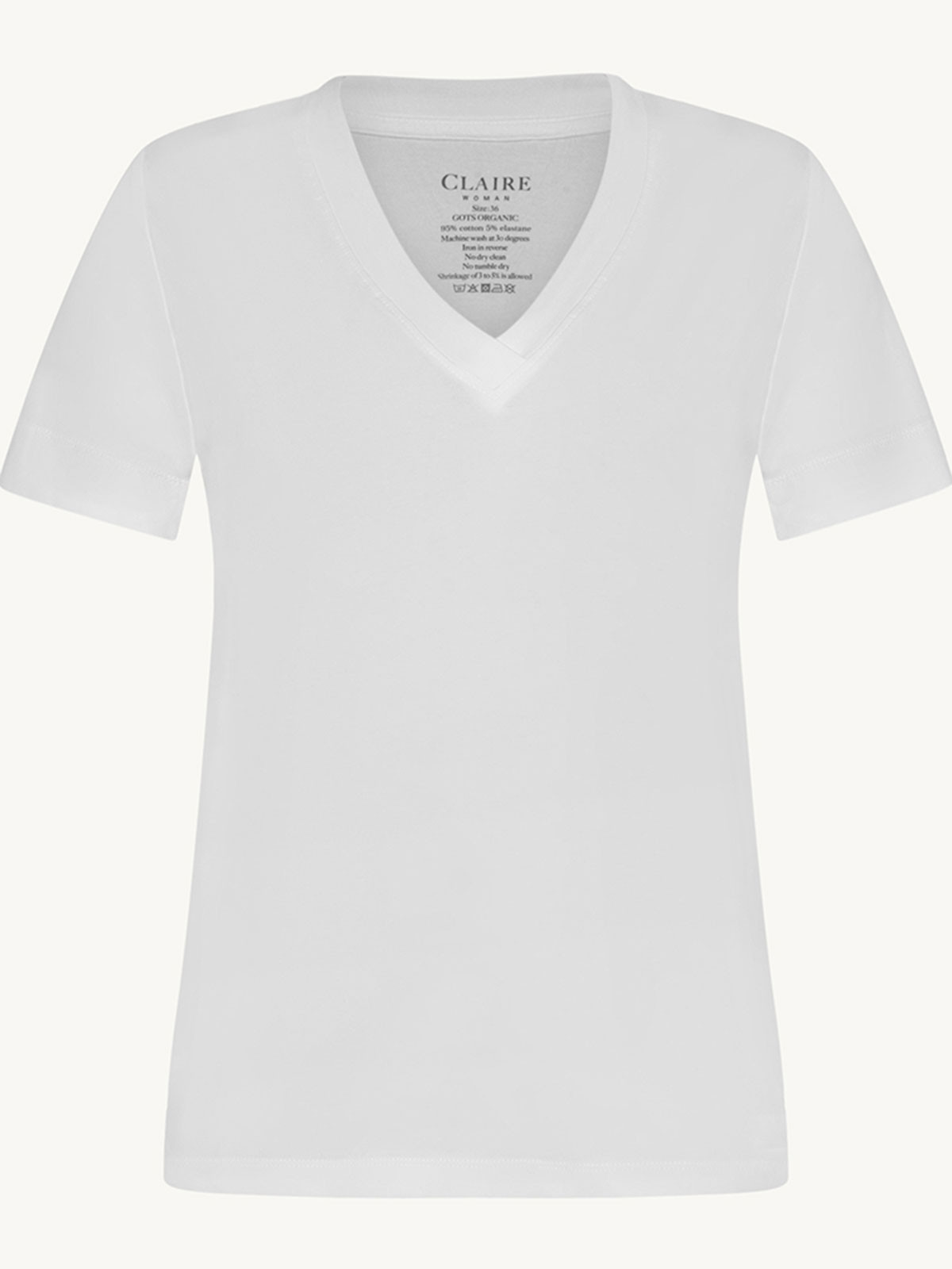 Superskön bastopp från Claire Woman i ekologisk bomull. Modellen är rak och klassisk med V-ringad hals, kort ärm och rak nederkant.