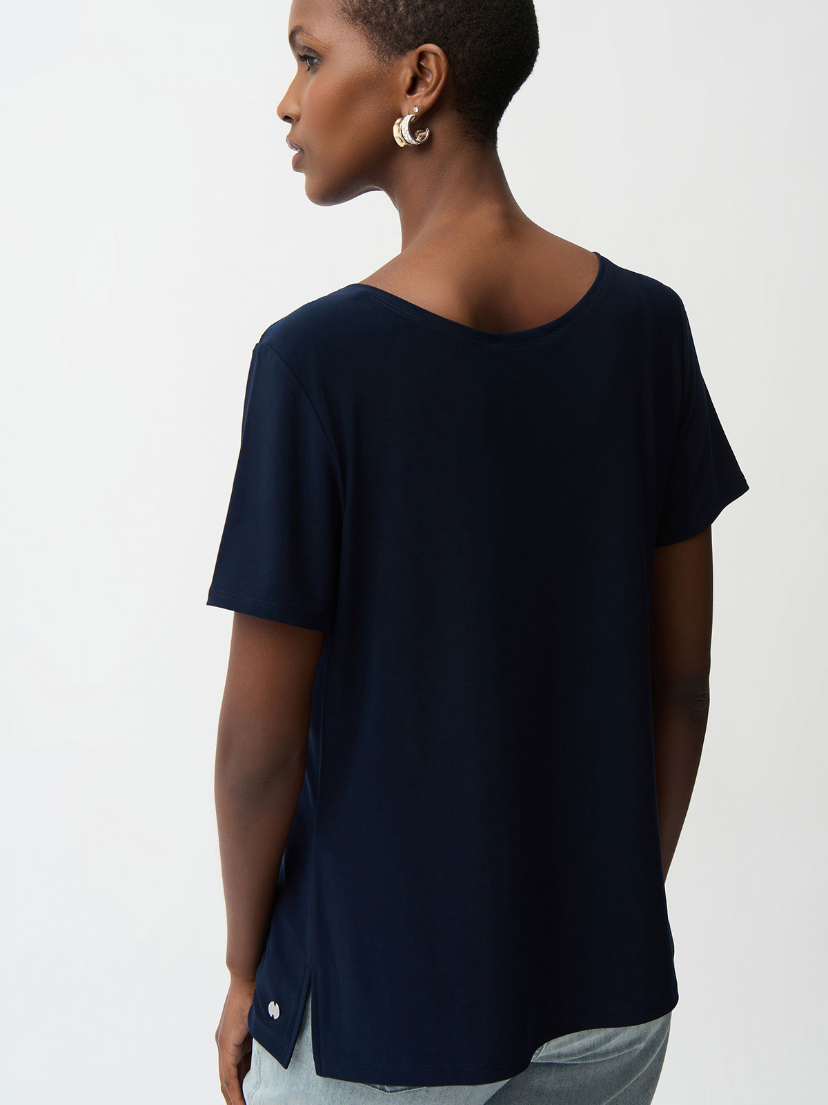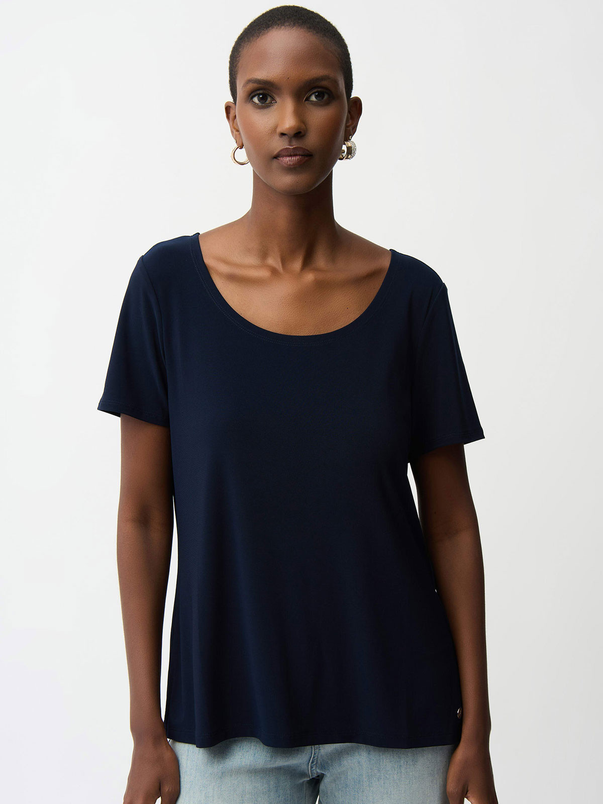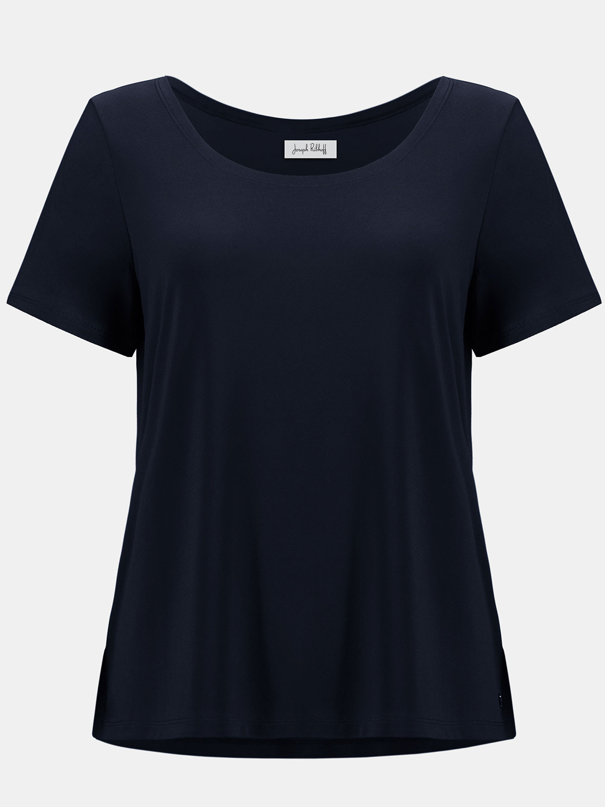 Elegant trikåtopp från Joseph Ribkoff med rundringad hals och trekvartslång ärm. Modellen är rak och ledig. Vacker lyster i tyget.
