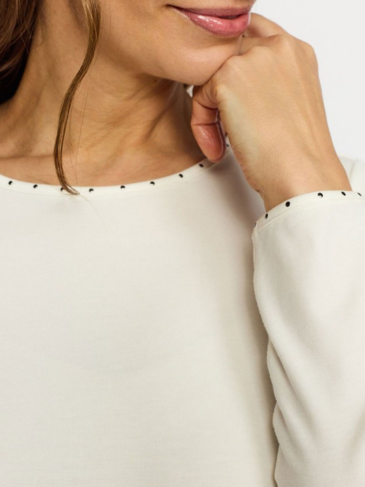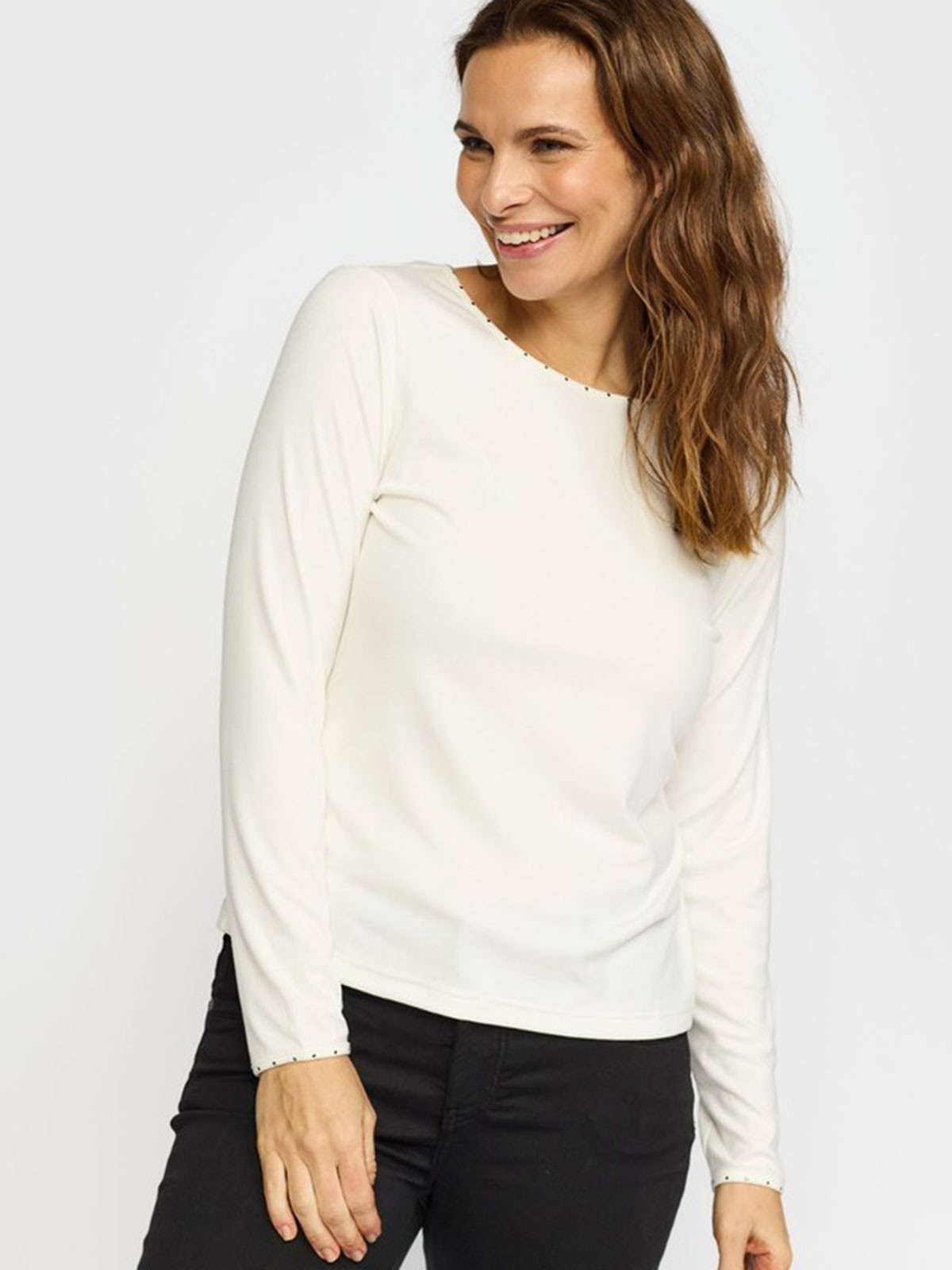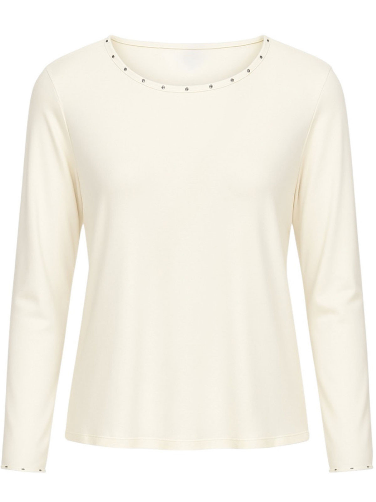 Superskön trikåtopp från 2-BIZ med fin nitdetalj på kragen. Modellen är figurnära utan att vara tight. Halsen rundad och ärmen hellång.