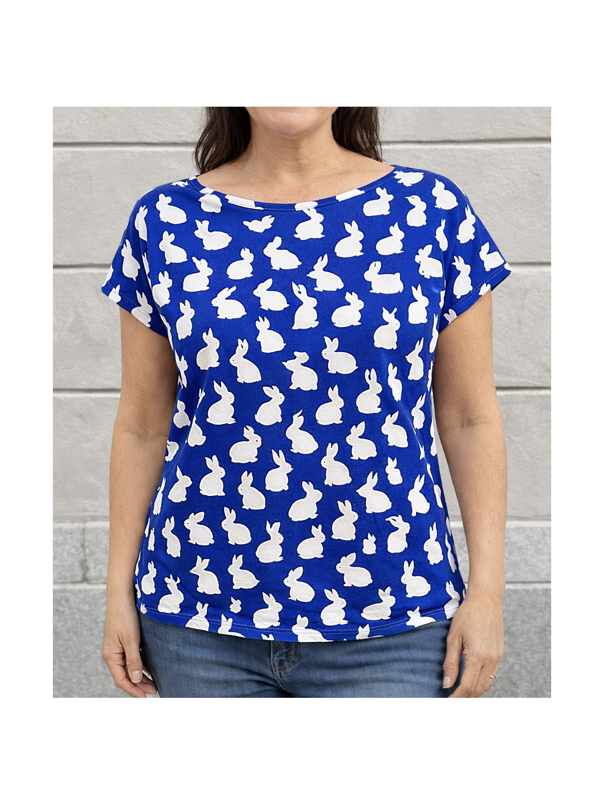 Toppen Alta från Camilla Thulin är en klassiker som återkommer varje säsong i nya härliga mönster och färger. Denna är härligt flaggblå med vita kaniner på!