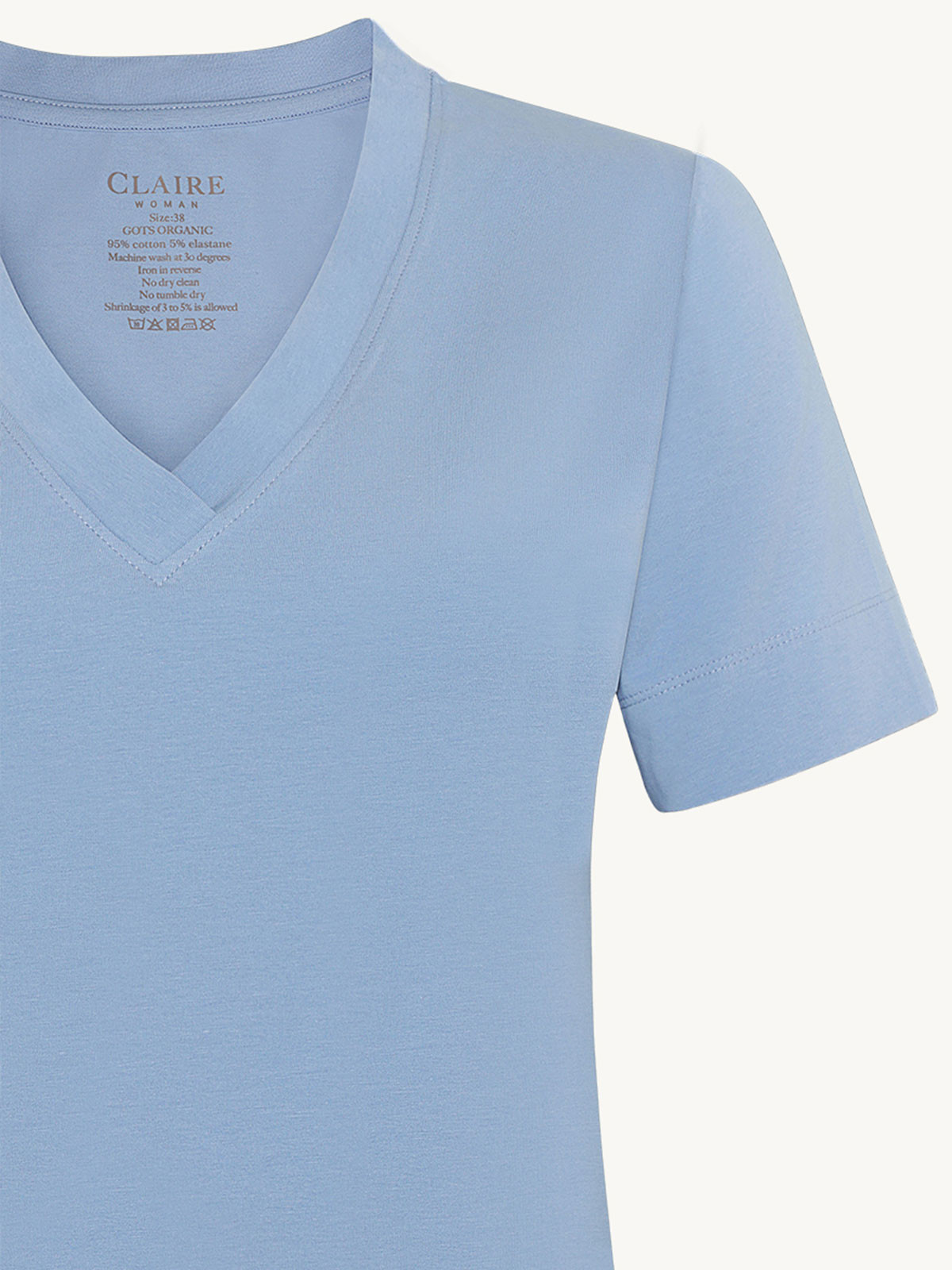 Superskön bastopp från Claire Woman i ekologisk bomull. Modellen är rak och klassisk med V-ringad hals, kort ärm och rak nederkant.