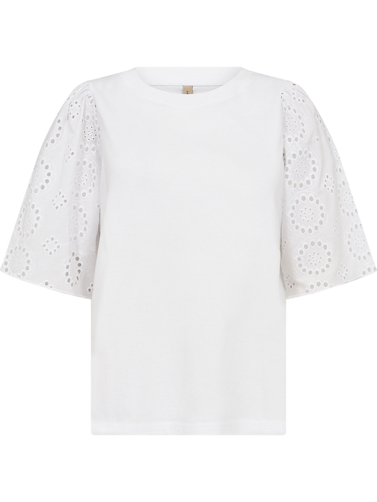 Feminin topp från SoyaConcept av T-shirtmodell med kontrasterande ärmar. Den halvlånga ärmen har puff och hålmönster i ett cirkelmönster.