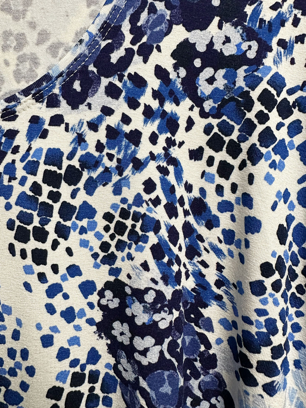 Enkel och användbar trikåtopp från Marinello. Kortärmad med rundad halsringning. Klassisk modell. Grafiskt lemönster i blå toner på vit botten.