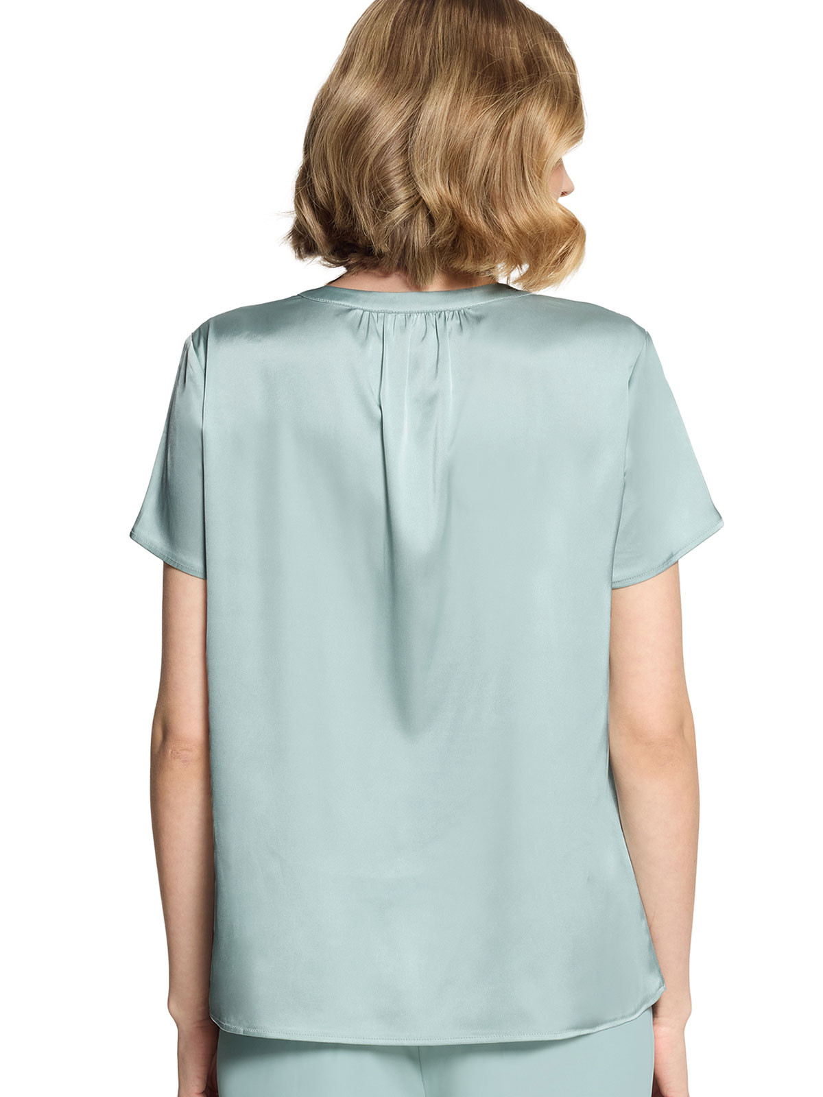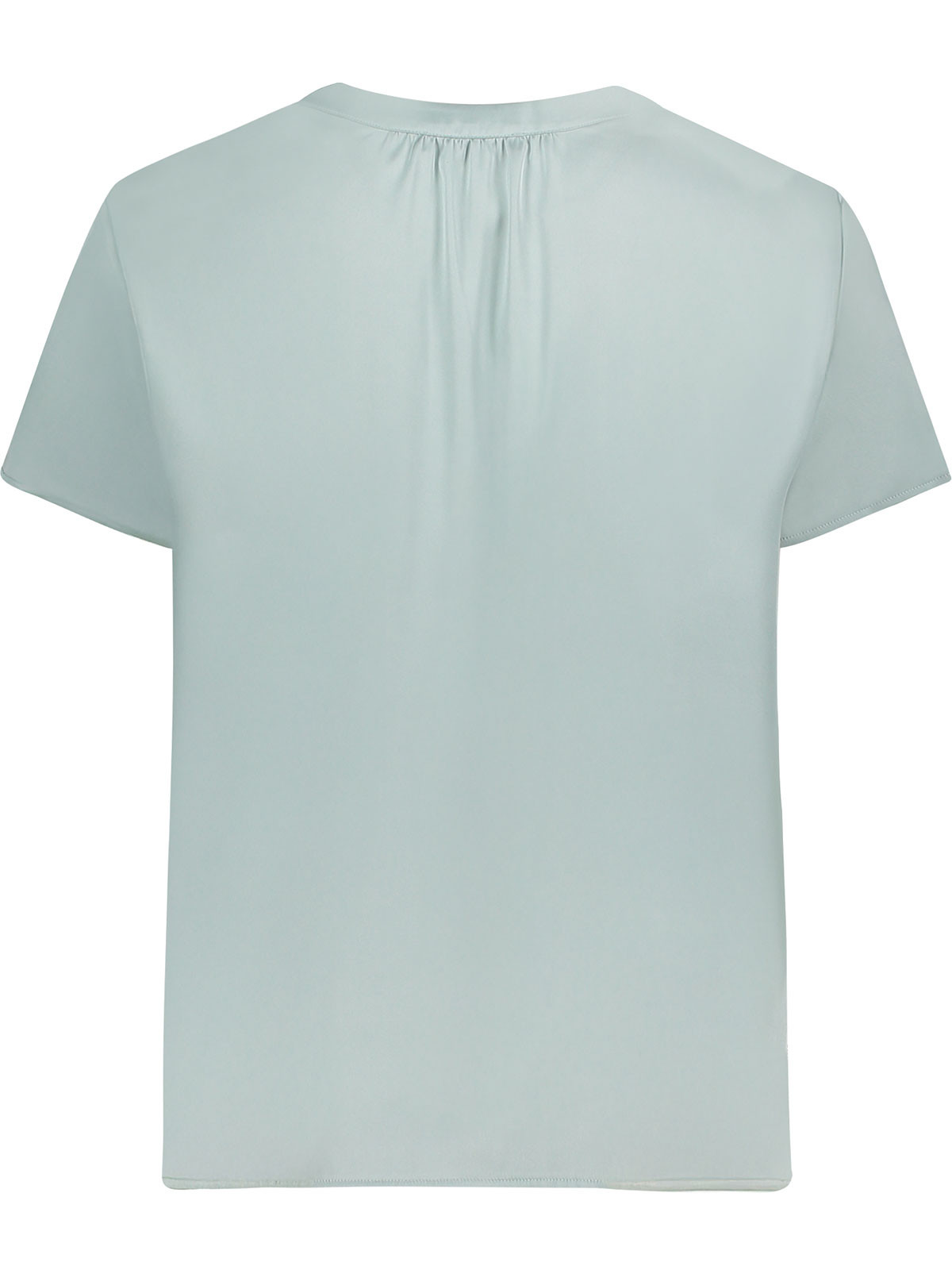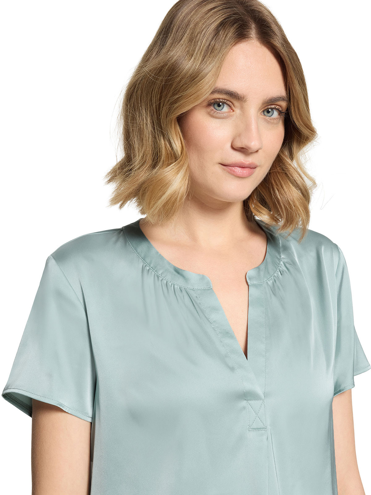 Supersöt satintopp från Betty Barclay. Modellen har rundad hals med rynksöm och en V-formad öppning fram. Ärmen är kort och toppen är vid och rak så den hänger löst på höften.