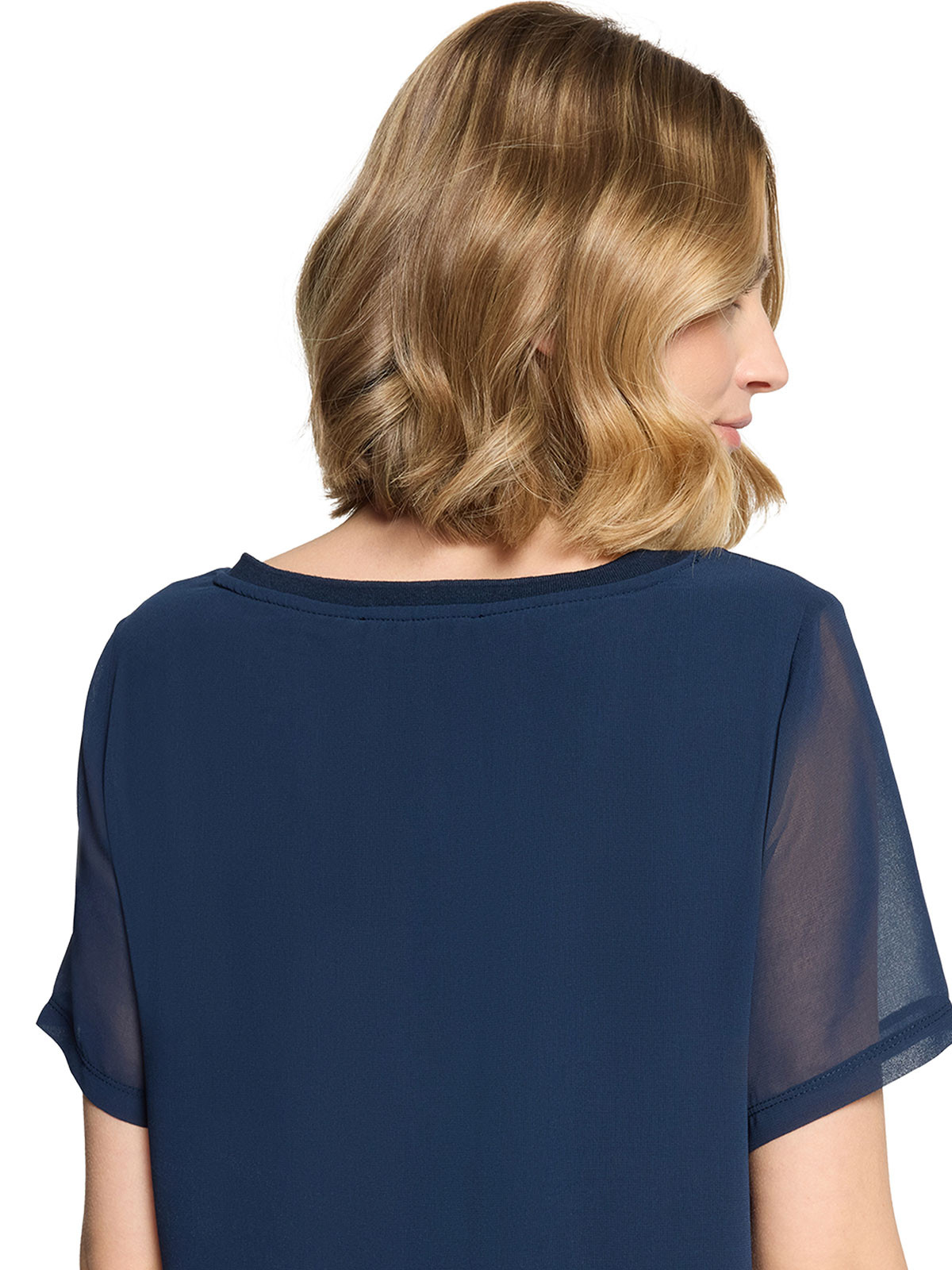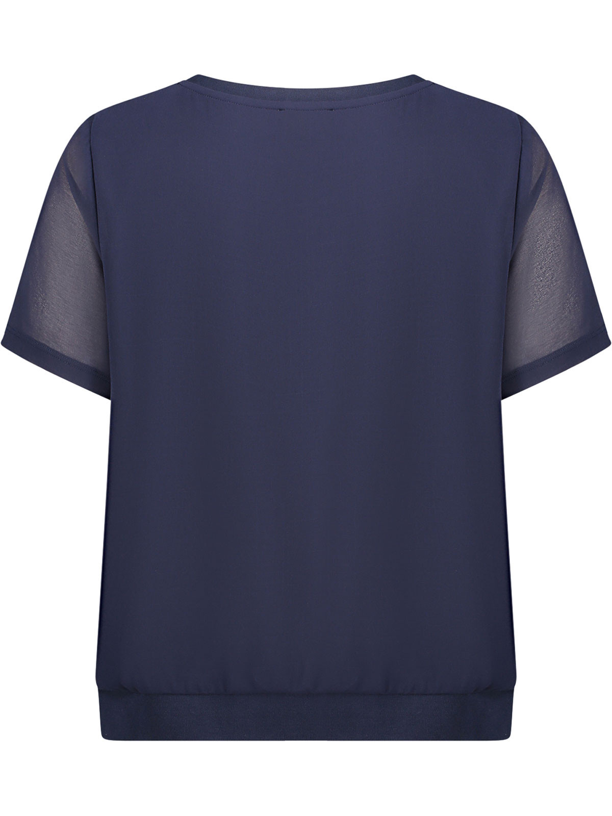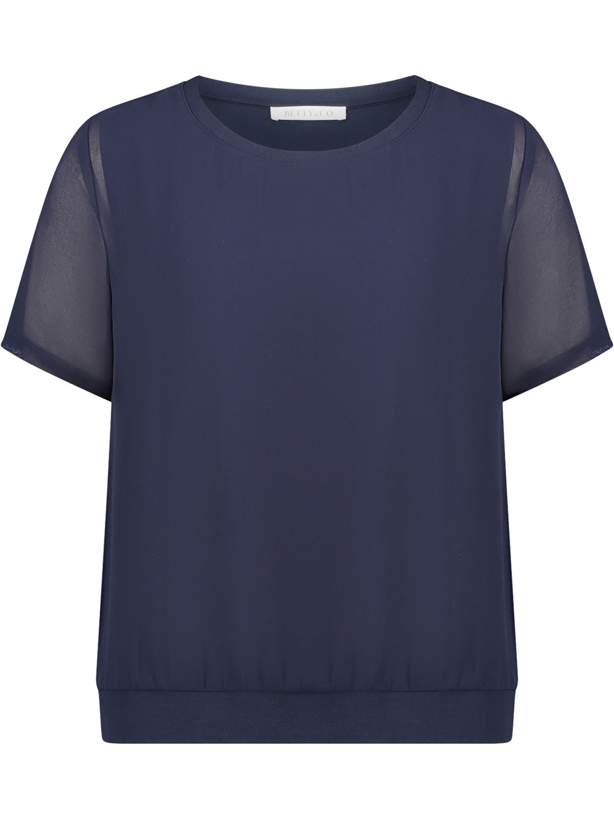 Supersöt topp från Betty & Co (en del av Betty Barclay) med ett chiffonglager över en stretchig trikåtopp. Modellen är vid med en avsmalnande mudd nertill, vid ärmslut och i den rundringade halsen. Den korta ärmen har ingen trikå under och har därför genomlys. Snyggt!