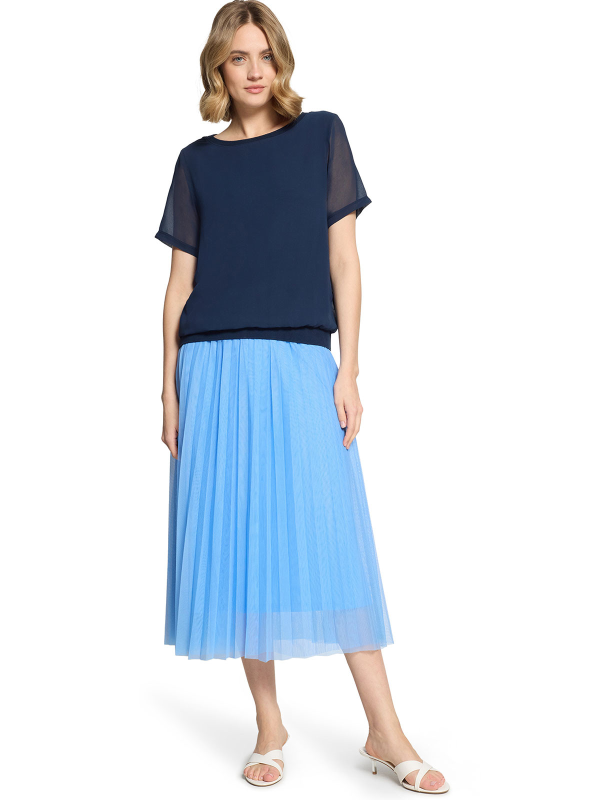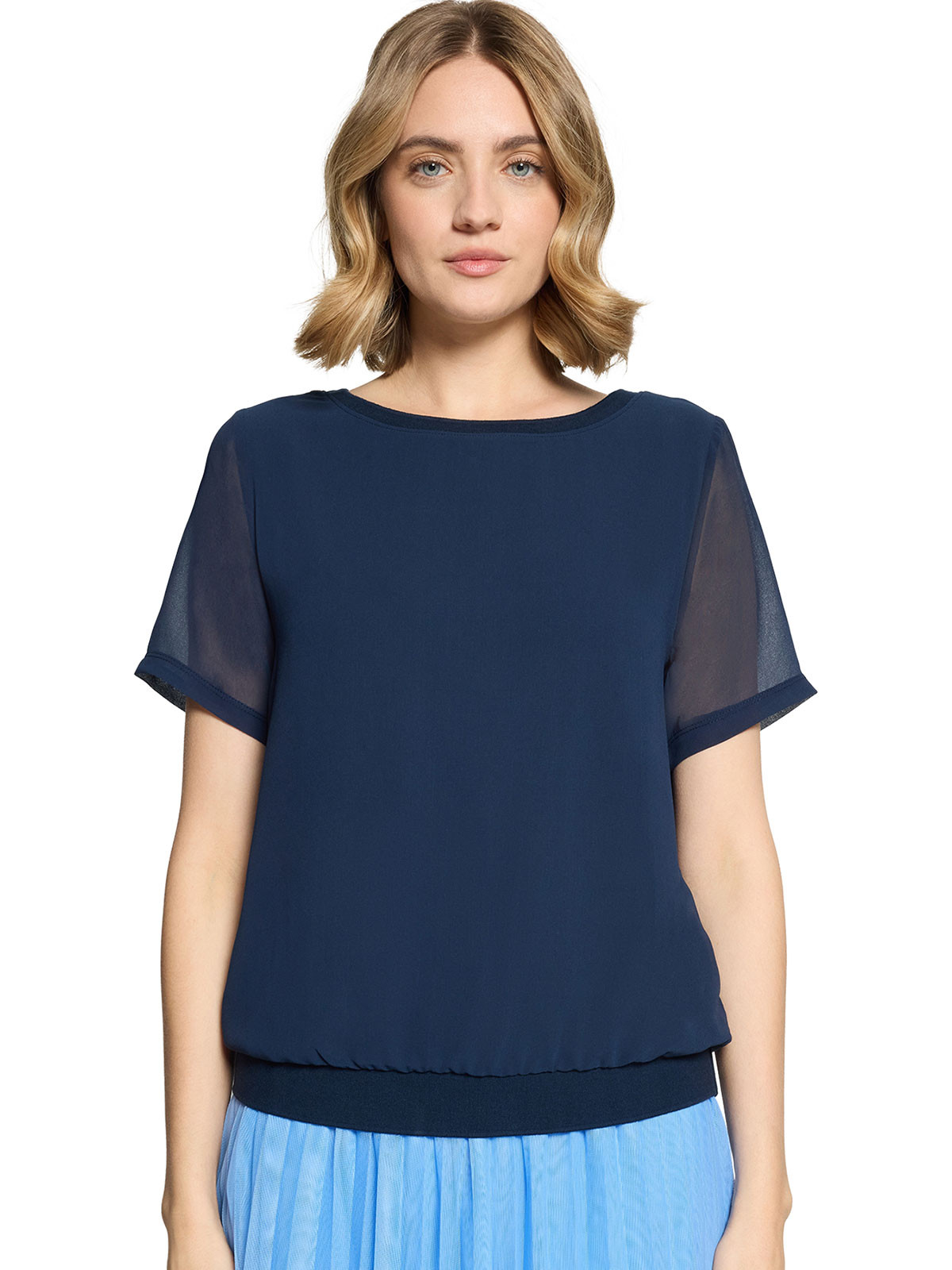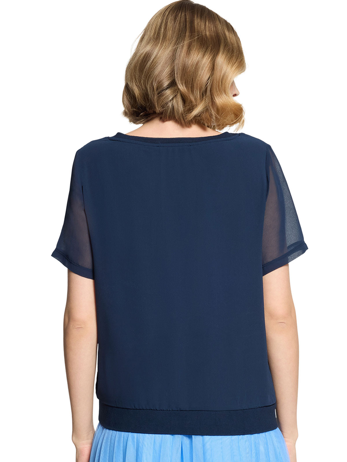 Supersöt topp från Betty & Co (en del av Betty Barclay) med ett chiffonglager över en stretchig trikåtopp. Modellen är vid med en avsmalnande mudd nertill, vid ärmslut och i den rundringade halsen. Den korta ärmen har ingen trikå under och har därför genomlys. Snyggt!