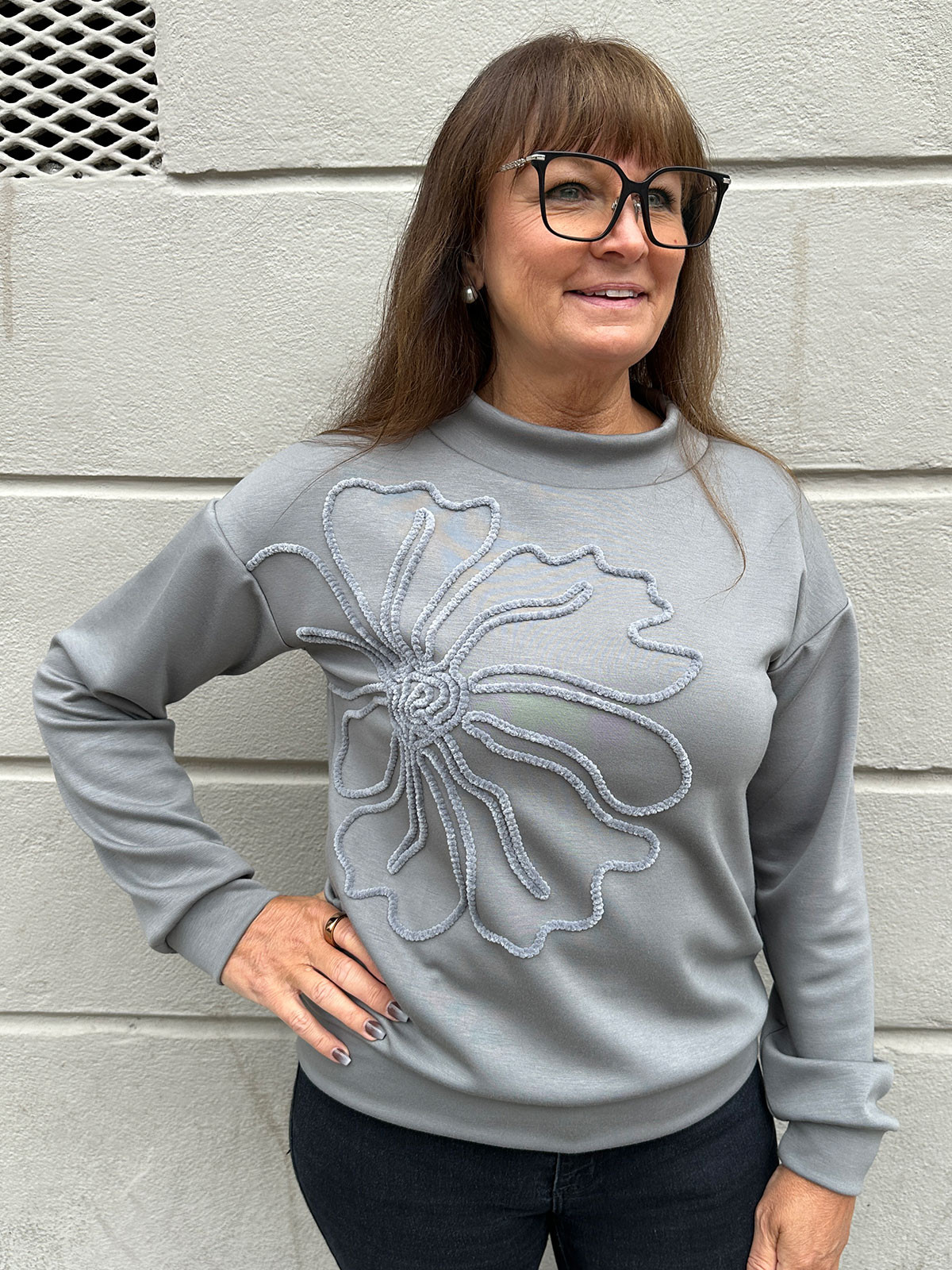 Tuff tröja från M.X.O. i en supermjuk kvalitet. Modellen har en bredare halslinning, lång ärm och nederkanter med mudd. På bröstet finns en elegant blomapplikation vilket gör den här tröjan speciell. Nyansen på tröjan uppfattas mellan grå och grön, beroende på ljus.