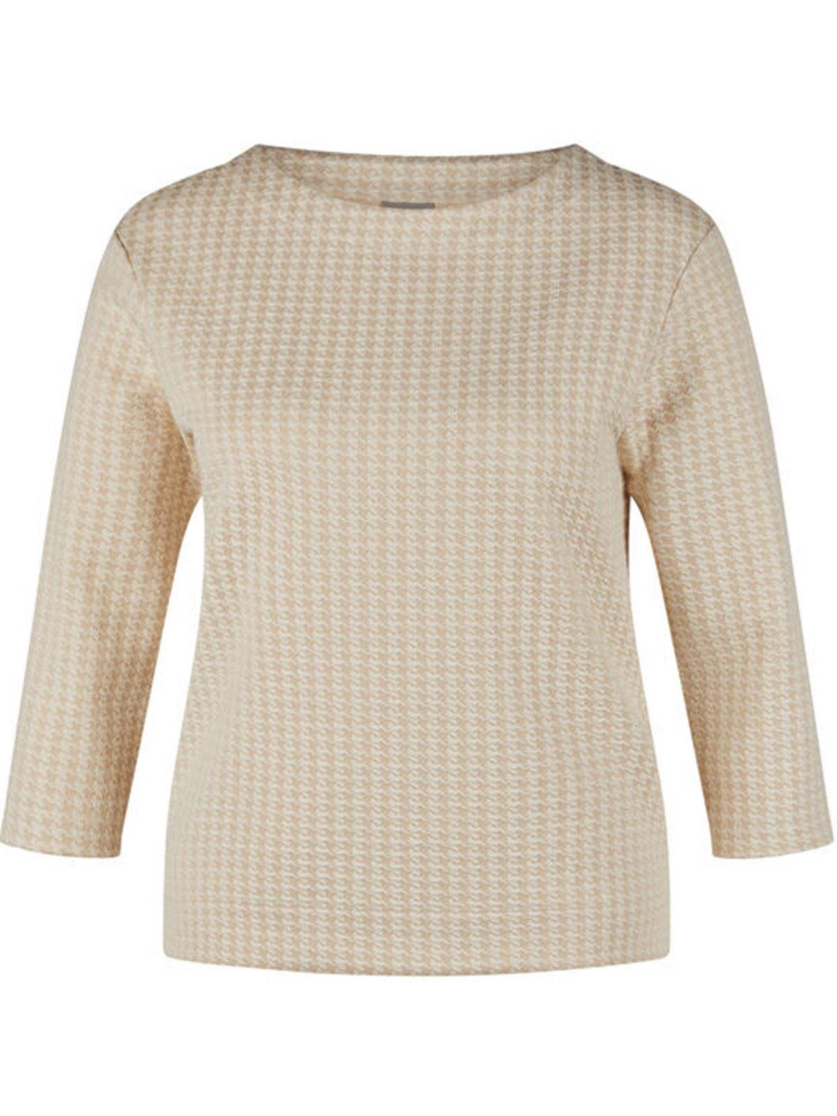 Topp i strukturstickad trikåkvalitet från Rabe. Modellen är klassiskt rak med rundad hals och trekvartslång ärm. Nederkanten är rak och på sida finns korta sprund.