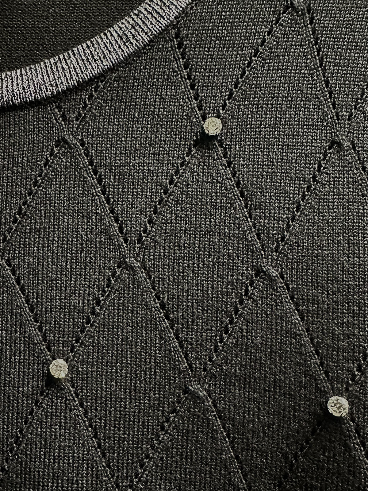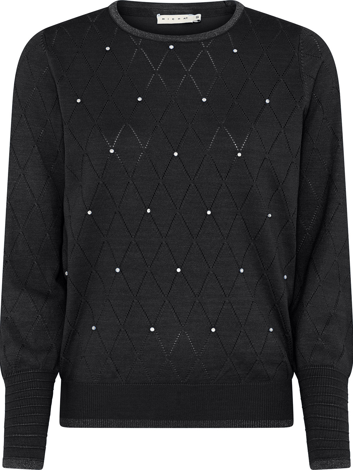 Elegant finstickad tröja från Micha med mönsterstickade romber och strasstenar. Modellen är klassiskt rak med muddar vid avslut. Den rundade halsen och nederkanten har silverfärgade lurextrådar instickade vilket ger en fin effekt. Baksidan är slätstickad utan stenar.