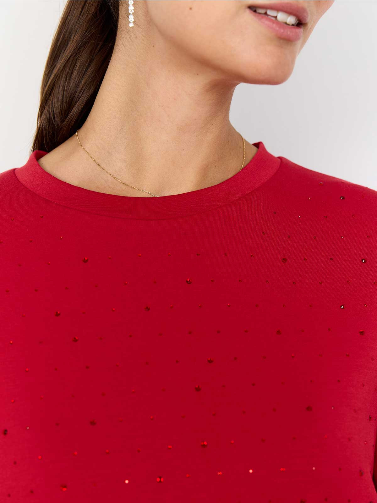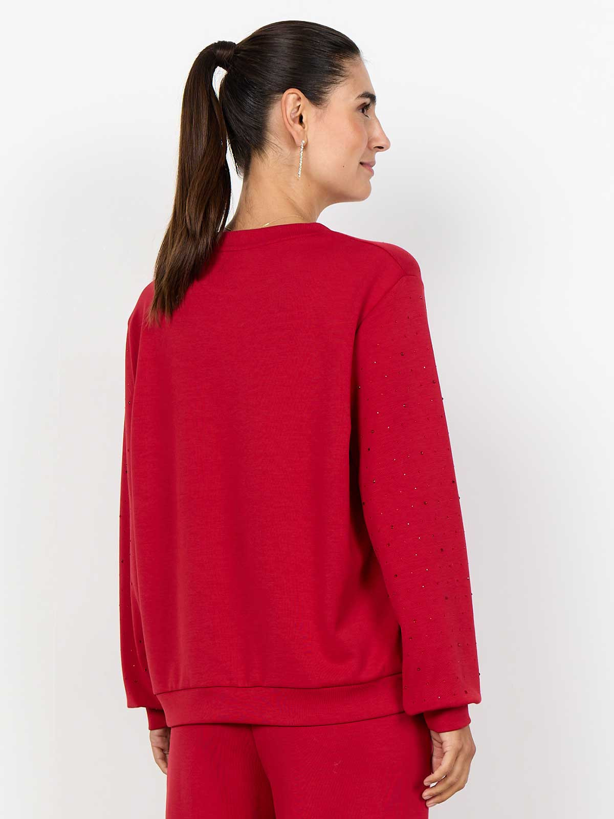 En elegant "collegetröja" från SoyaConcept med röda små gnistrande stenar strösslade på framsida och ärmar. Modellen är klassisk med rundad hals, hellång ärm med mudd och nederkant med mudd.