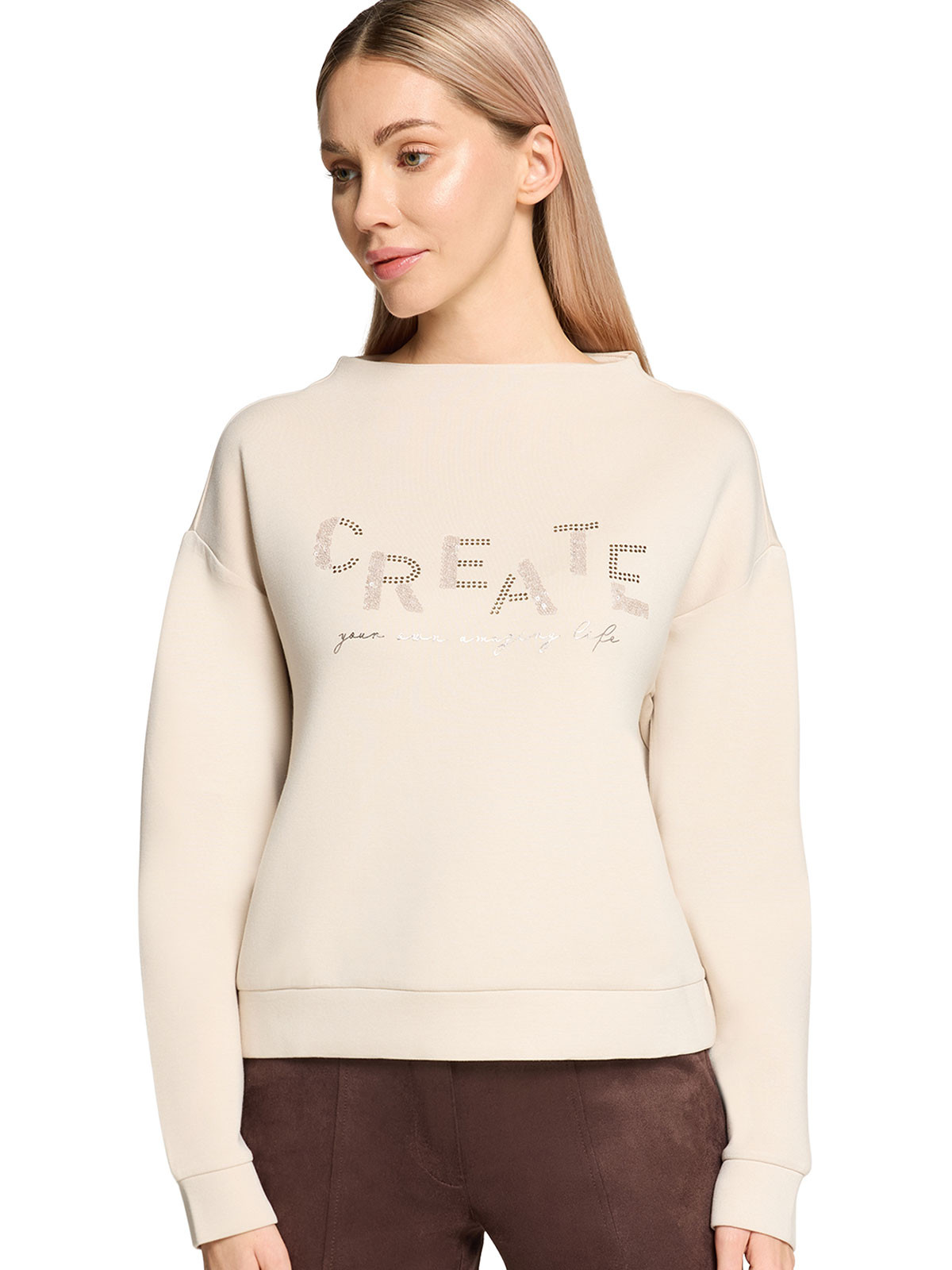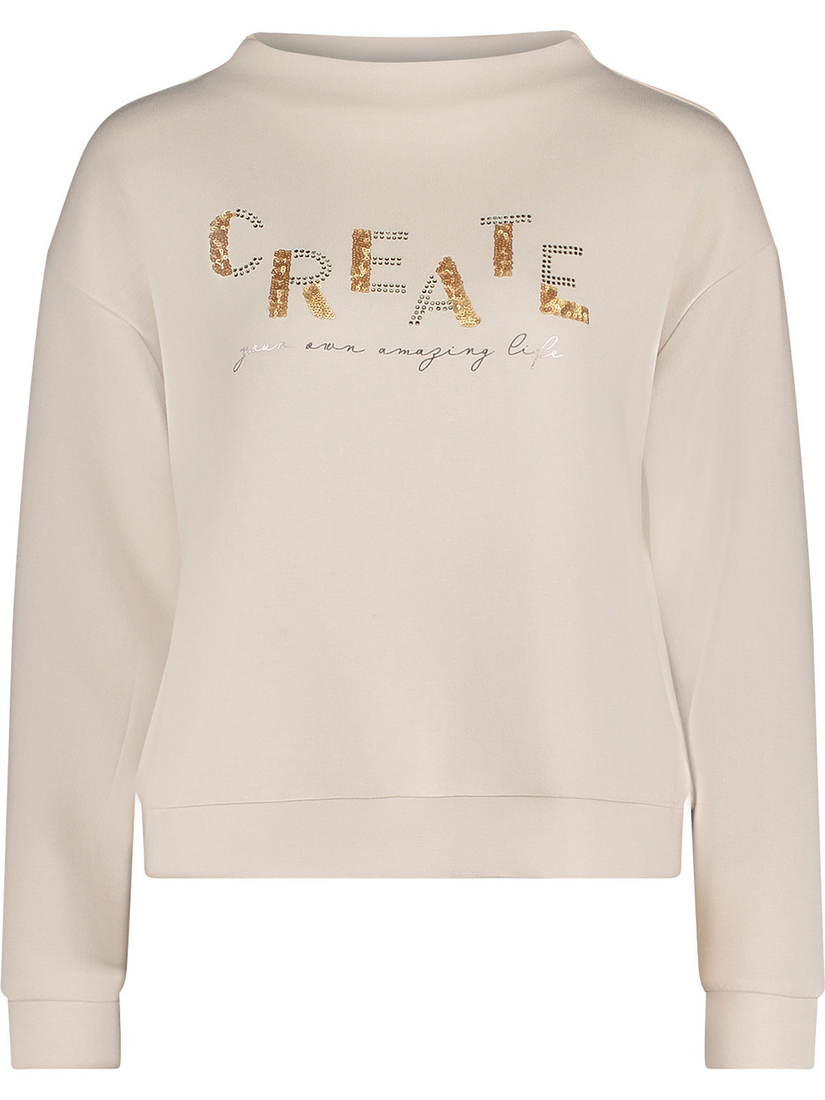 Mjuk och skön coallegtröja från Betty Barclay med strass- och paljettmönstrad text på bröstet. Modellen har en låg turtleneck och hellång ärm. Vid passform och rak nederkant.