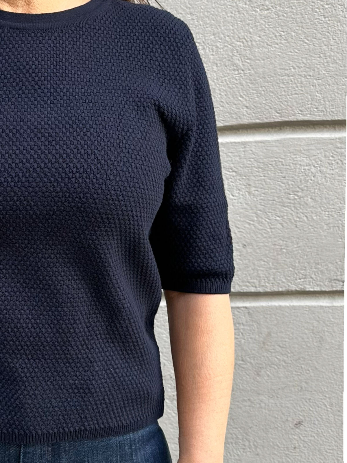 Fint mösterstickad topp från SibinLinnebjerg i en mörk marinblå färg. Modellen är klassisk topp/T-shirt med rundad hals och armbågslång ärm. Snygg till allt!
