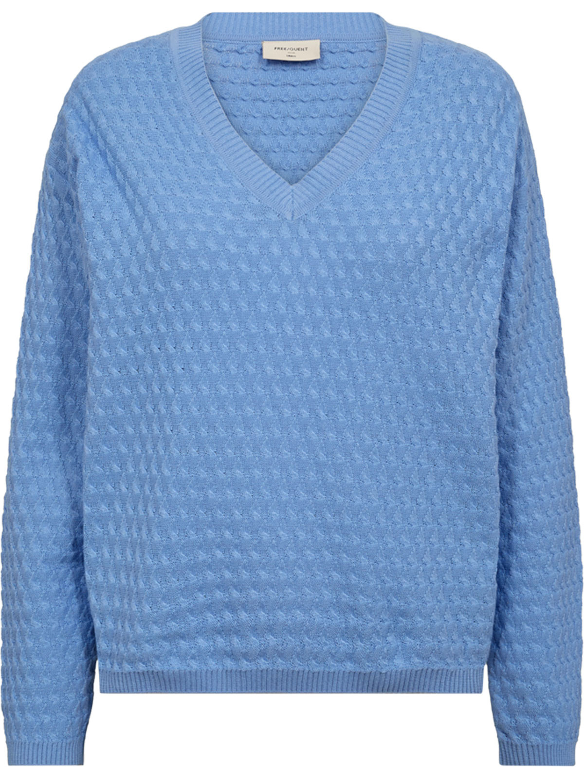 Mönsterstickad tröja från FreeQuent i 100% ekologisk bomull. Modellen har V-ringad hals, hellång ärm och smala muddar vid avslut.