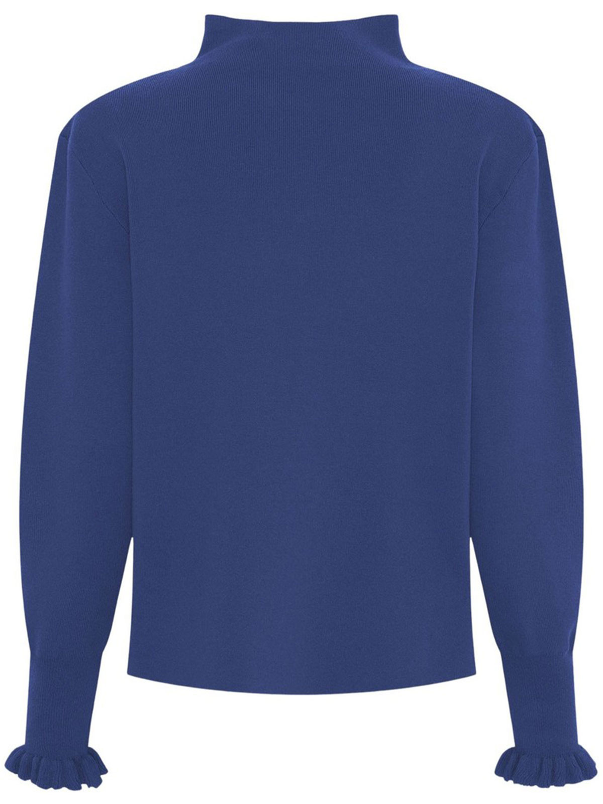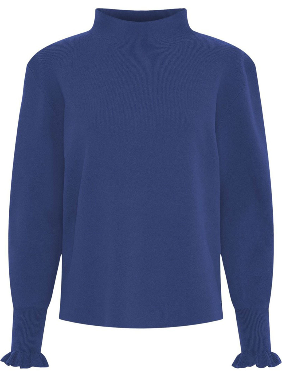 Modellen Frigga är en elegant tröja med högre krage och bred resårkant på ärmen som ger en fin volangkant. Tröjan är tillverkad av en bekväm bomullskvalitet med lite stretch, vilket ger en skön passform. En lite kortare modell som är fin både till kjol eller byxor.