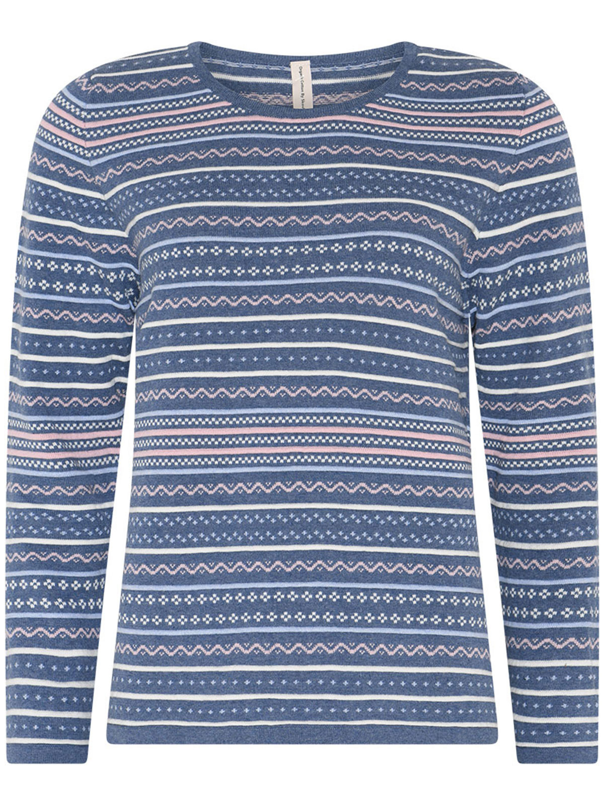 Den här finstickade tröjan har ett mjukt uttryck med ett diskret mönster i denimblått och rosa. Tröjan har en rak, bekväm passform med rund halsringning och lång ärm . 100% ekologisk bomull!