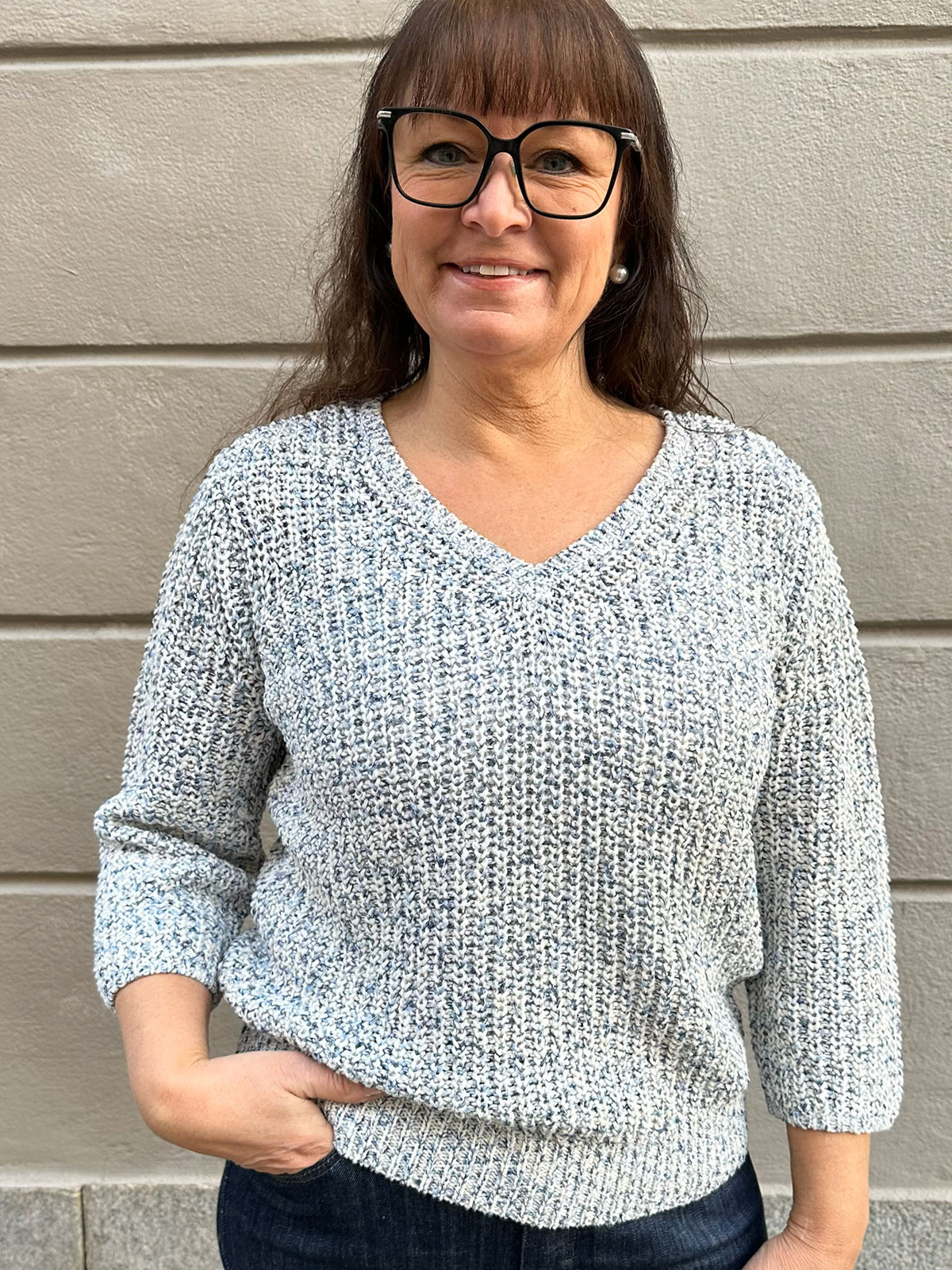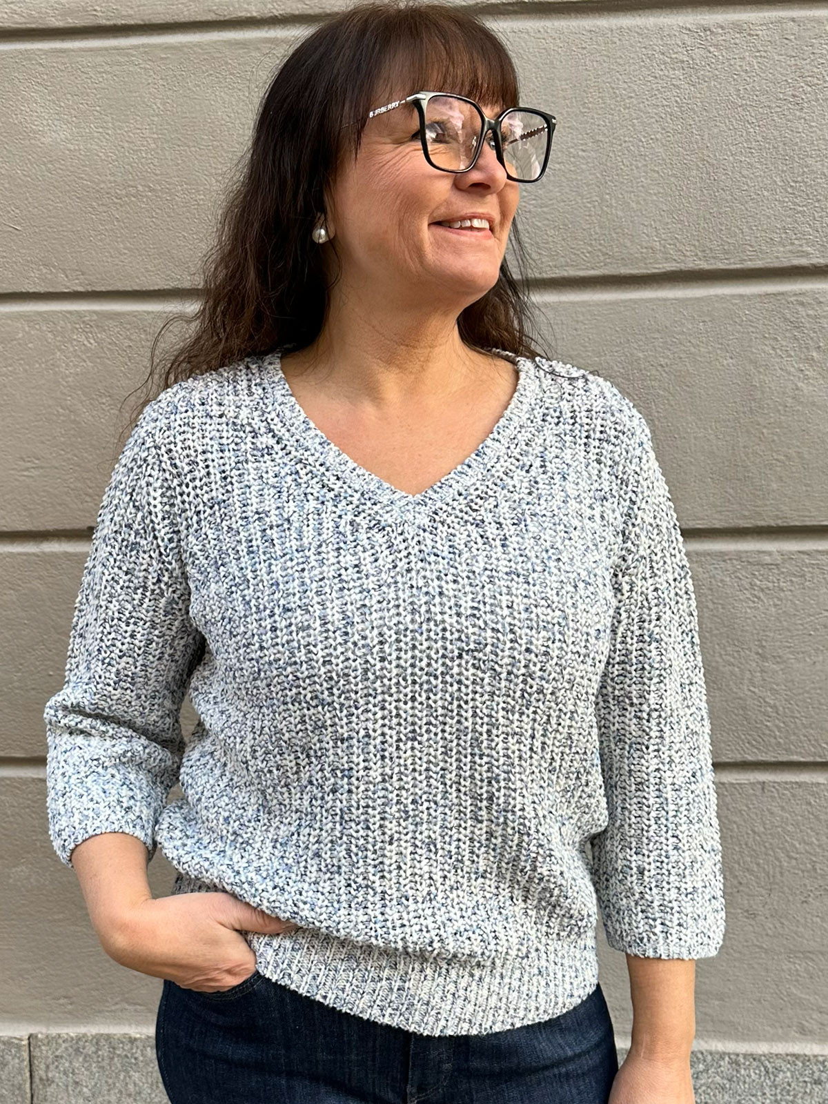 Stickad tröja i melerat garn blå/vit från Bloomings