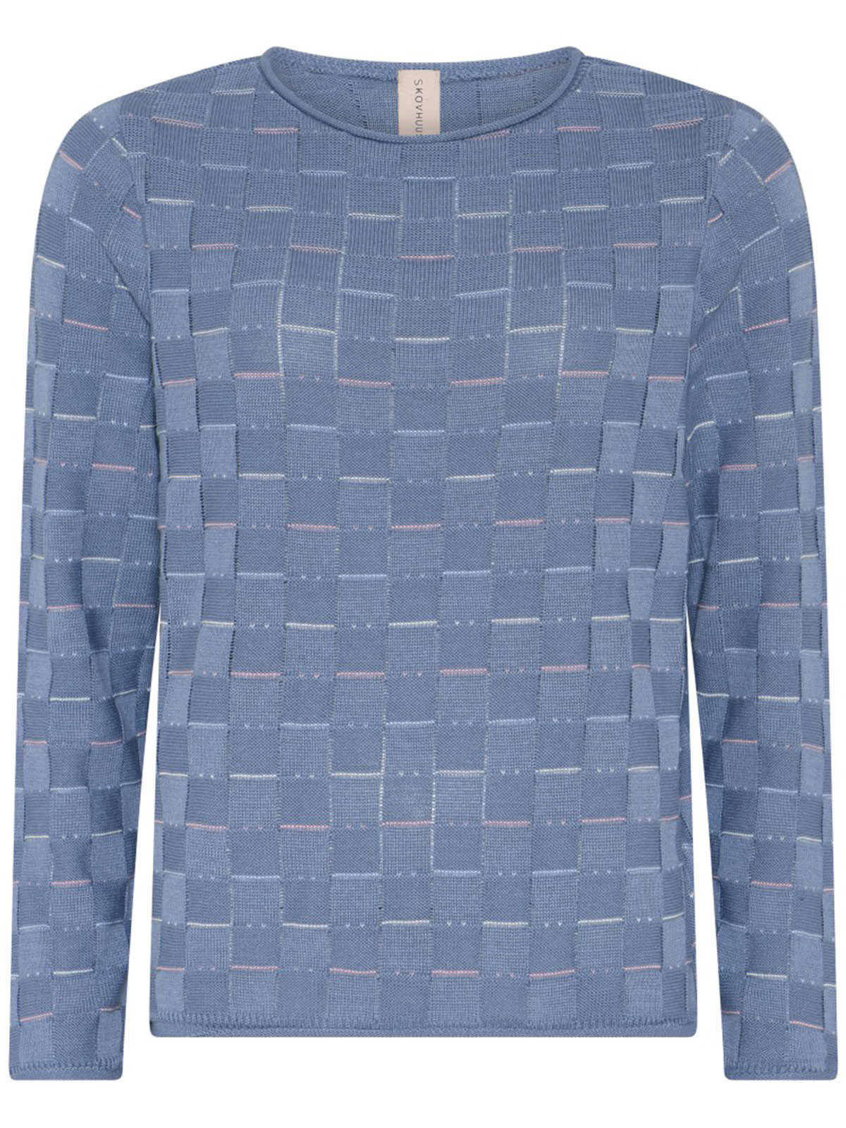 Den här stickade tröjan har ett mjukt och sobert uttryck med ett diskret mönster i dämpade denimblå toner mot ljus botten. Den finstickade strukturen ger plagget liv och karaktär, samtidigt som helheten känns stilren och lätt att bära.