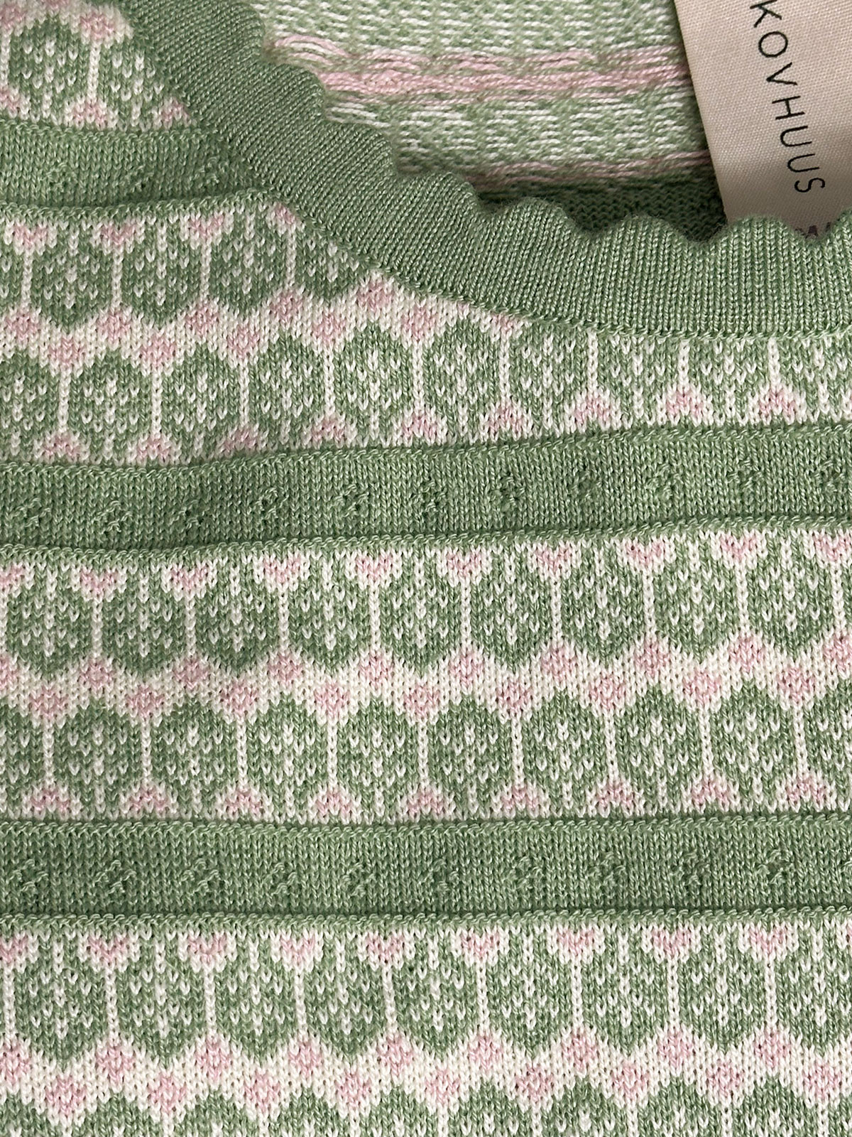 En fint stickad tröja från Skovhuus i gröna och ljust rosa ränder och mönster. Modellen är rak och har en rundad hals med vågstickad mudd. Ärmen är hellång och nederkanten är rak.