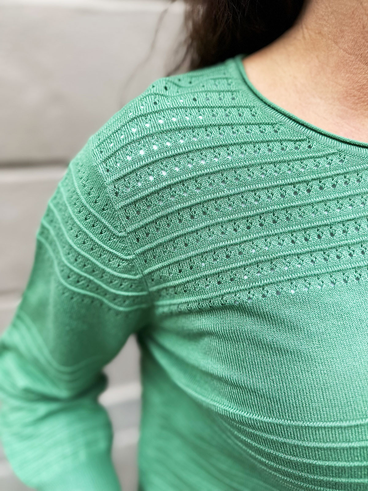 Fin- och mönsterstickad tröja från Gabriella K i viskosmix. Modellen har rundad hals, trekvartslång ärm och är rak med mudd i alla avslut.