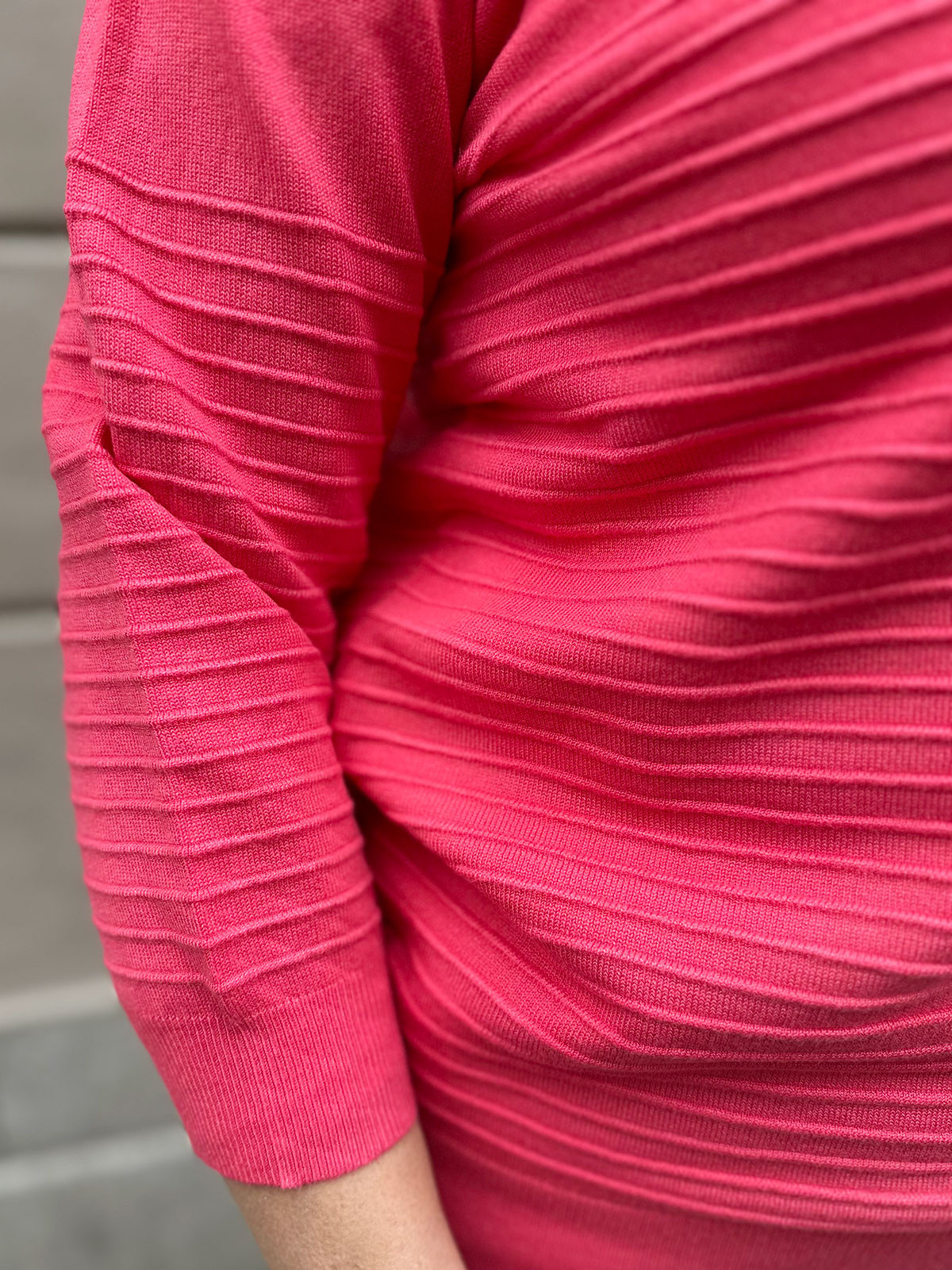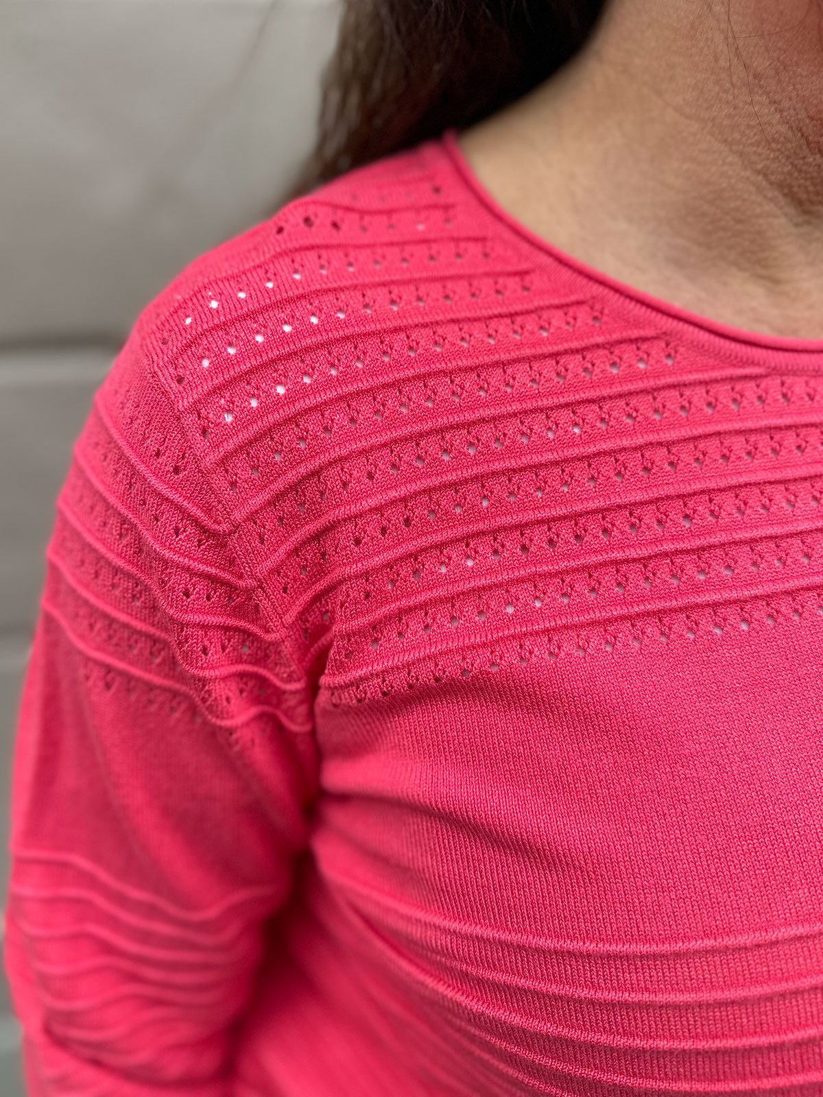 Fin- och mönsterstickad tröja från Gabriella K i viskosmix. Modellen har rundad hals, trekvartslång ärm och är rak med mudd i alla avslut.