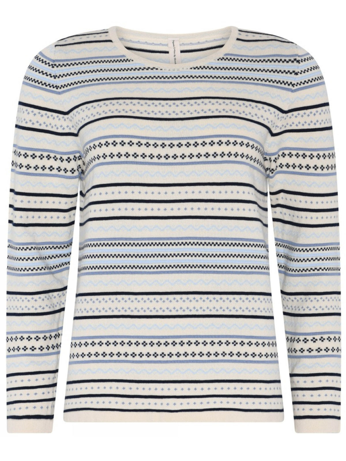 Den här finstickade tröjan har ett mjukt uttryck med ett diskret mönster i blå toner mot cremevit botten. Tröjan har en rak, bekväm passform med rund halsringning och lång ärm. 100% ekologisk bomull!