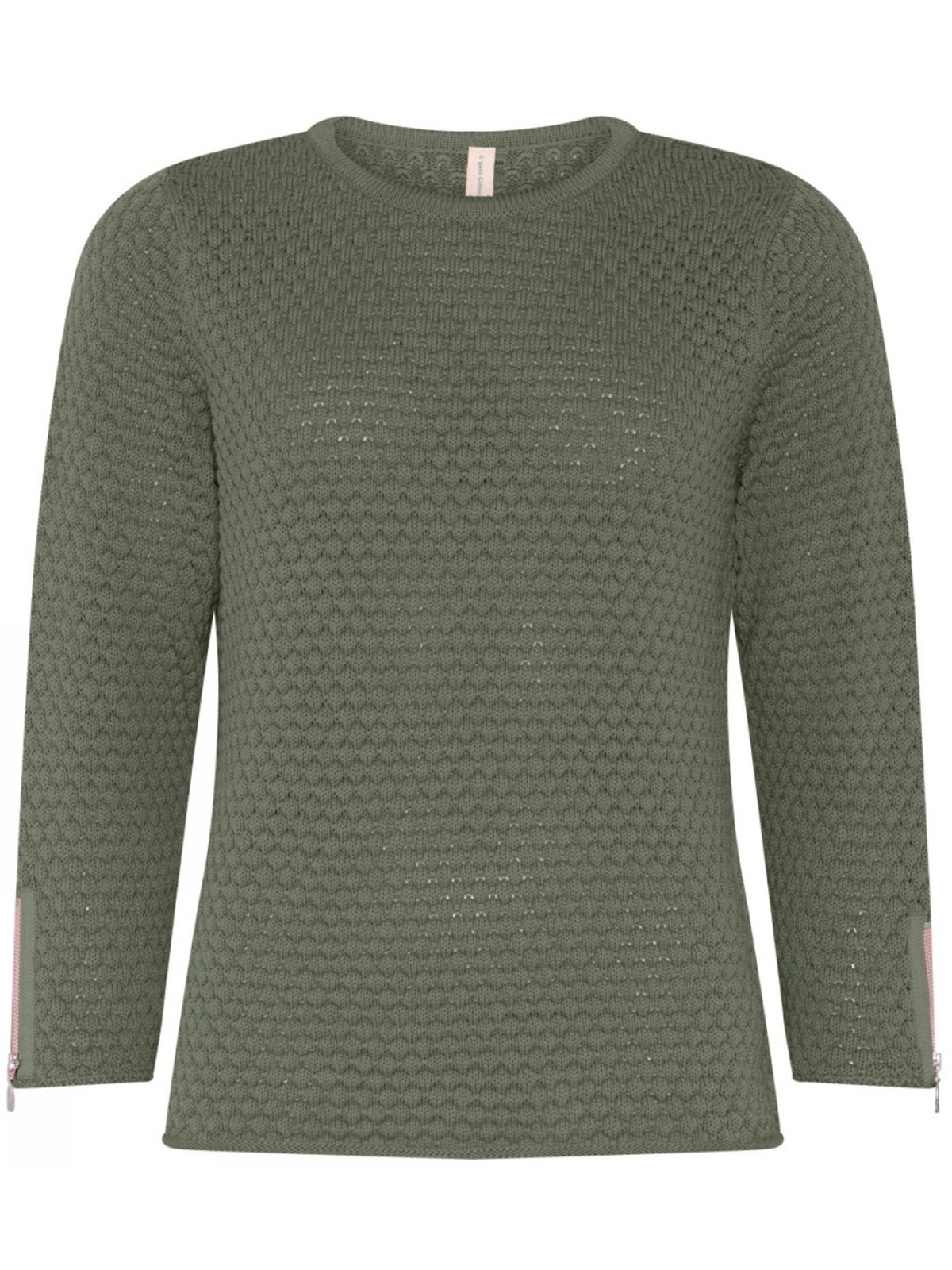 Stickad tröja i 100% bomull från danska Skovhuus. Rundad halsringning och 3/4 dels ärm lång ärm med silverfärgad dragkedja som snygg detalj.