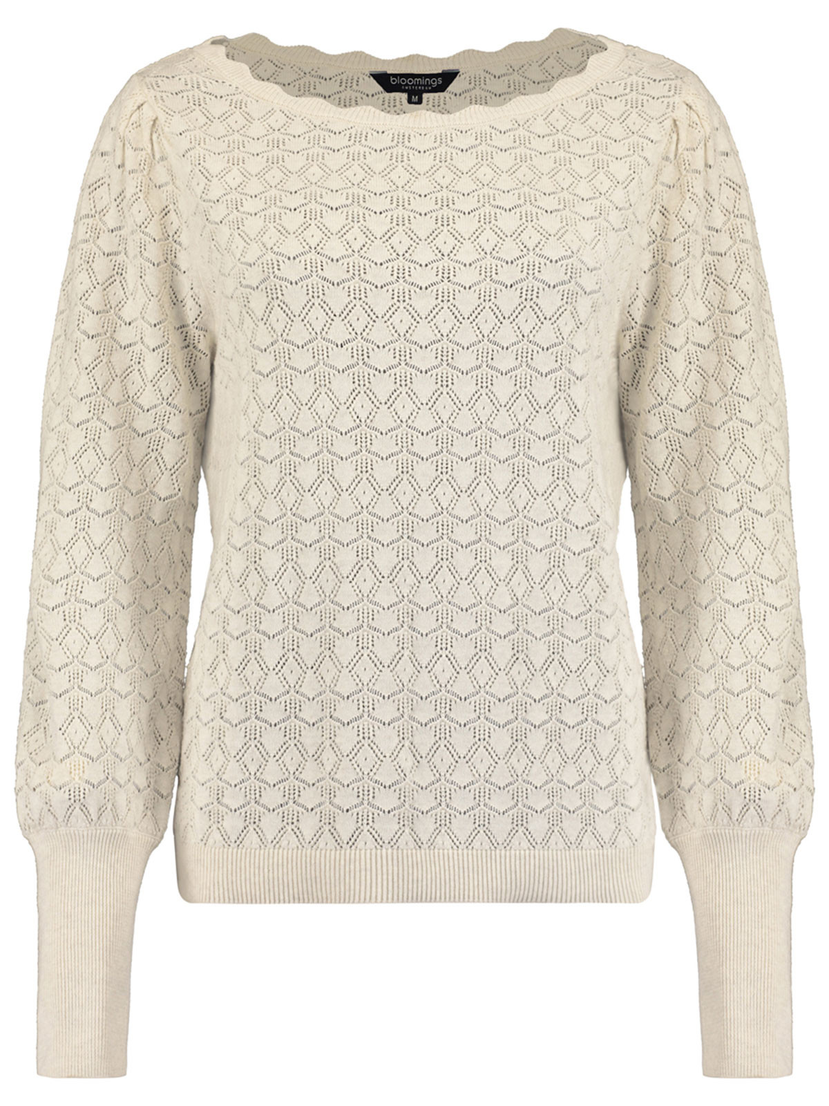 Vackert mönsterstickad tröja från Bloomings i 100% bomull. Modellen är rak och har rundad hals med stickad vågkant. Ärmen är hellång med en bredare mudd i nederkant.
