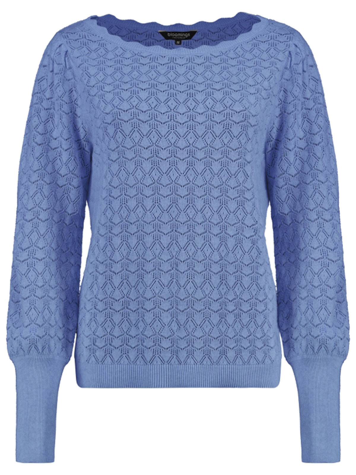 Vackert mönsterstickad tröja från Bloomings i 100% bomull. Modellen är rak och har rundad hals med stickad vågkant. Ärmen är hellång med en bredare mudd i nederkant.