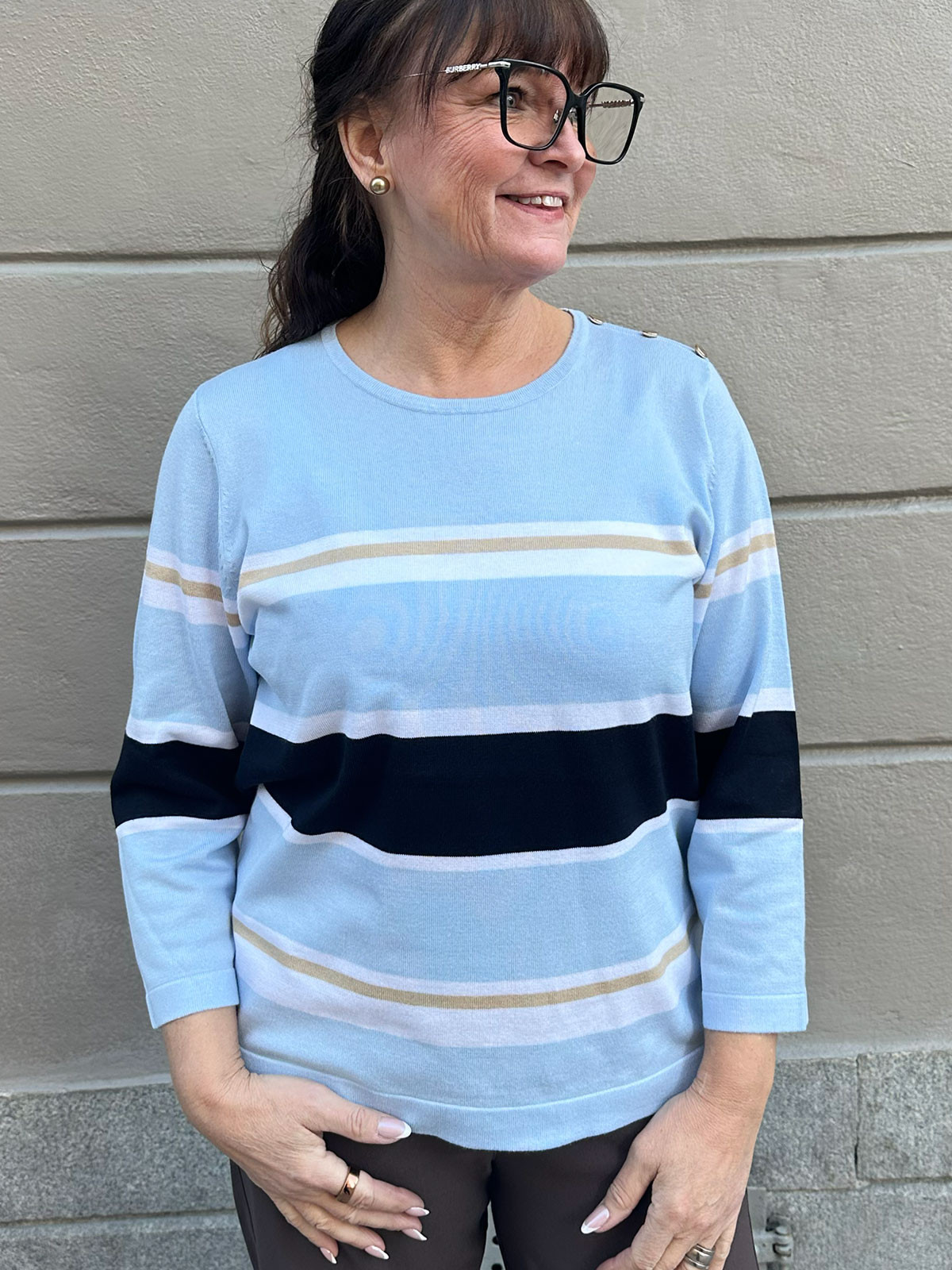 Klassisk tröja från Micha med rundad hals och lång ärm. På vänster axel finns det tre silverfärgade dekorknappar.
