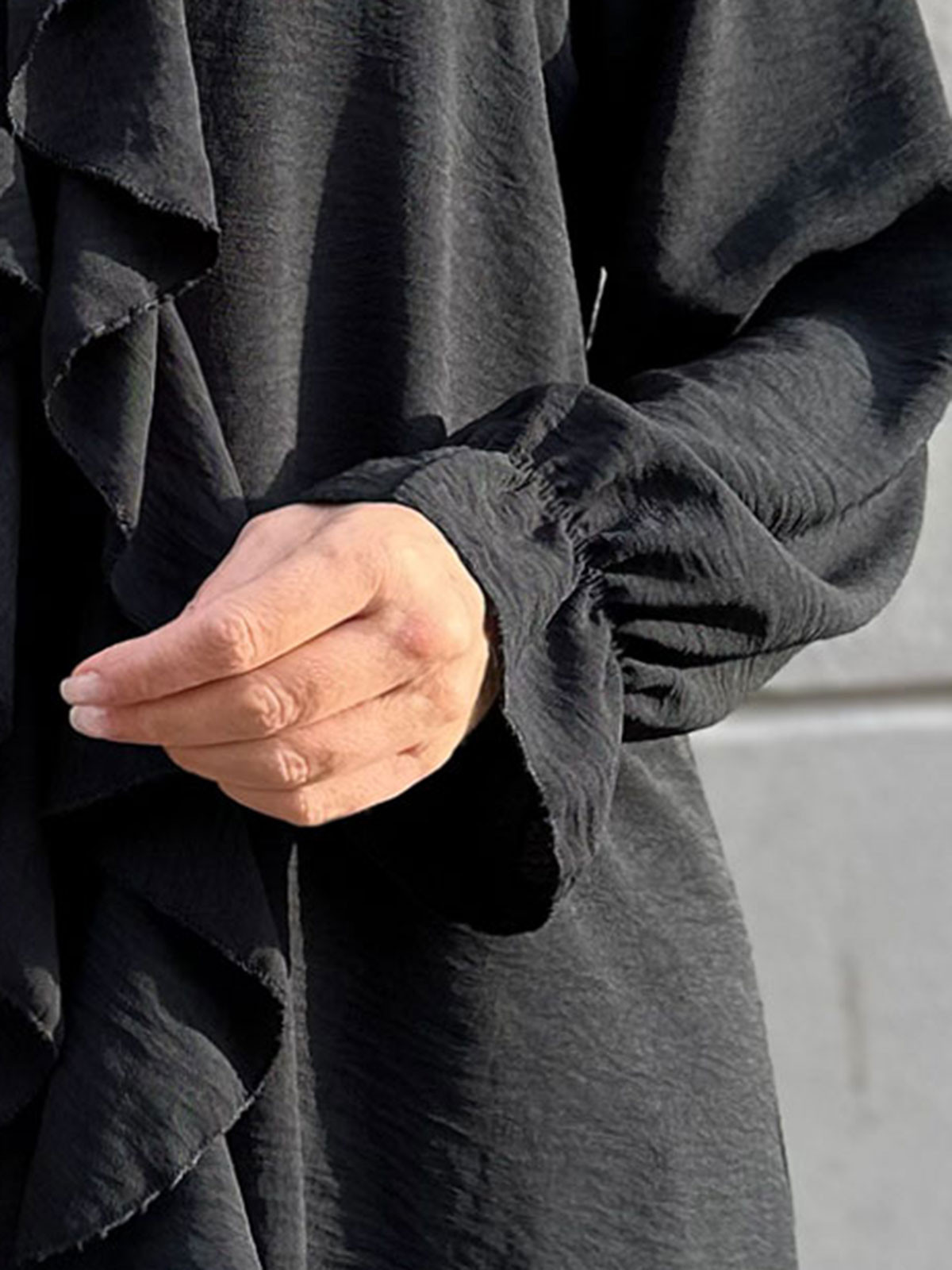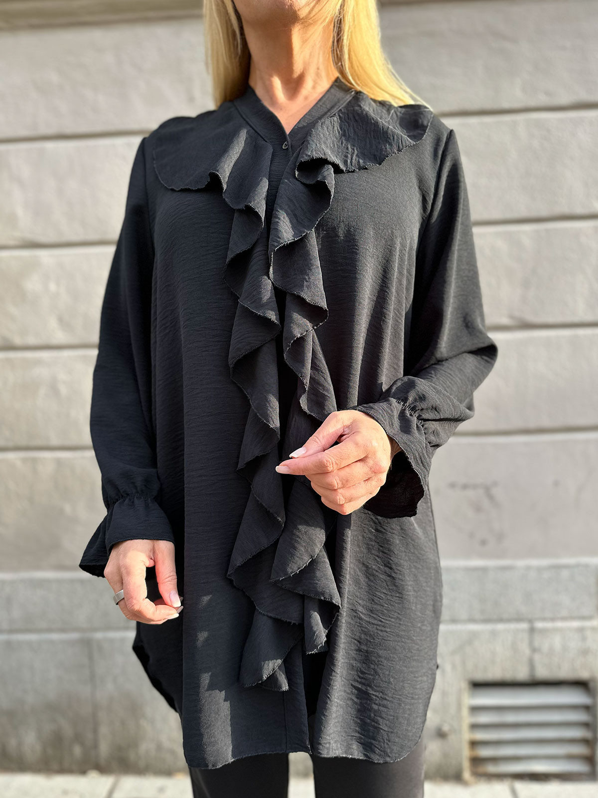 Lång blus, eller tunika med knäppning hela vägen fram. Längs med krage och knäppning finns en generös volangkant. Den hellånga ärmen avslutas med resår som ger en volangkant även där. Superfin över ett par leggings eller smalare byxa. Råa kanter med kantsöm.