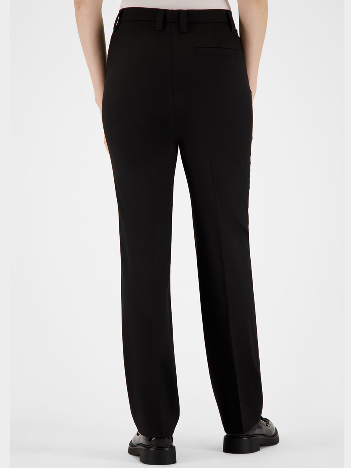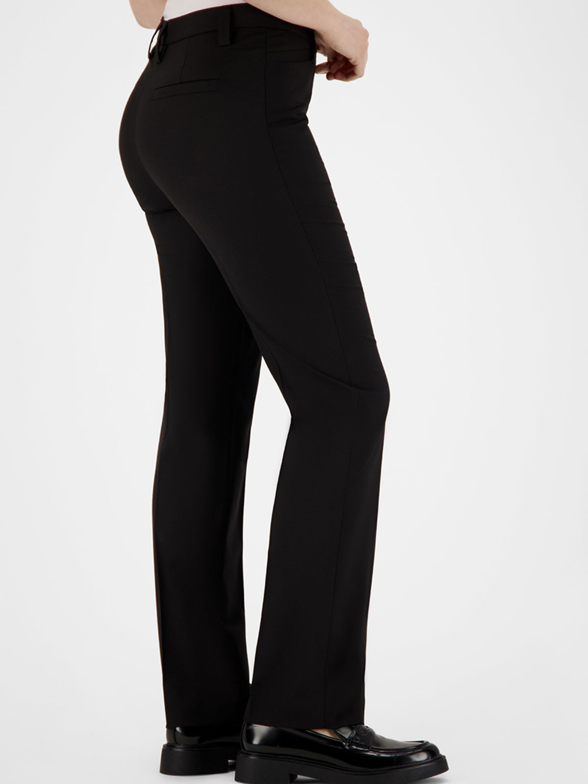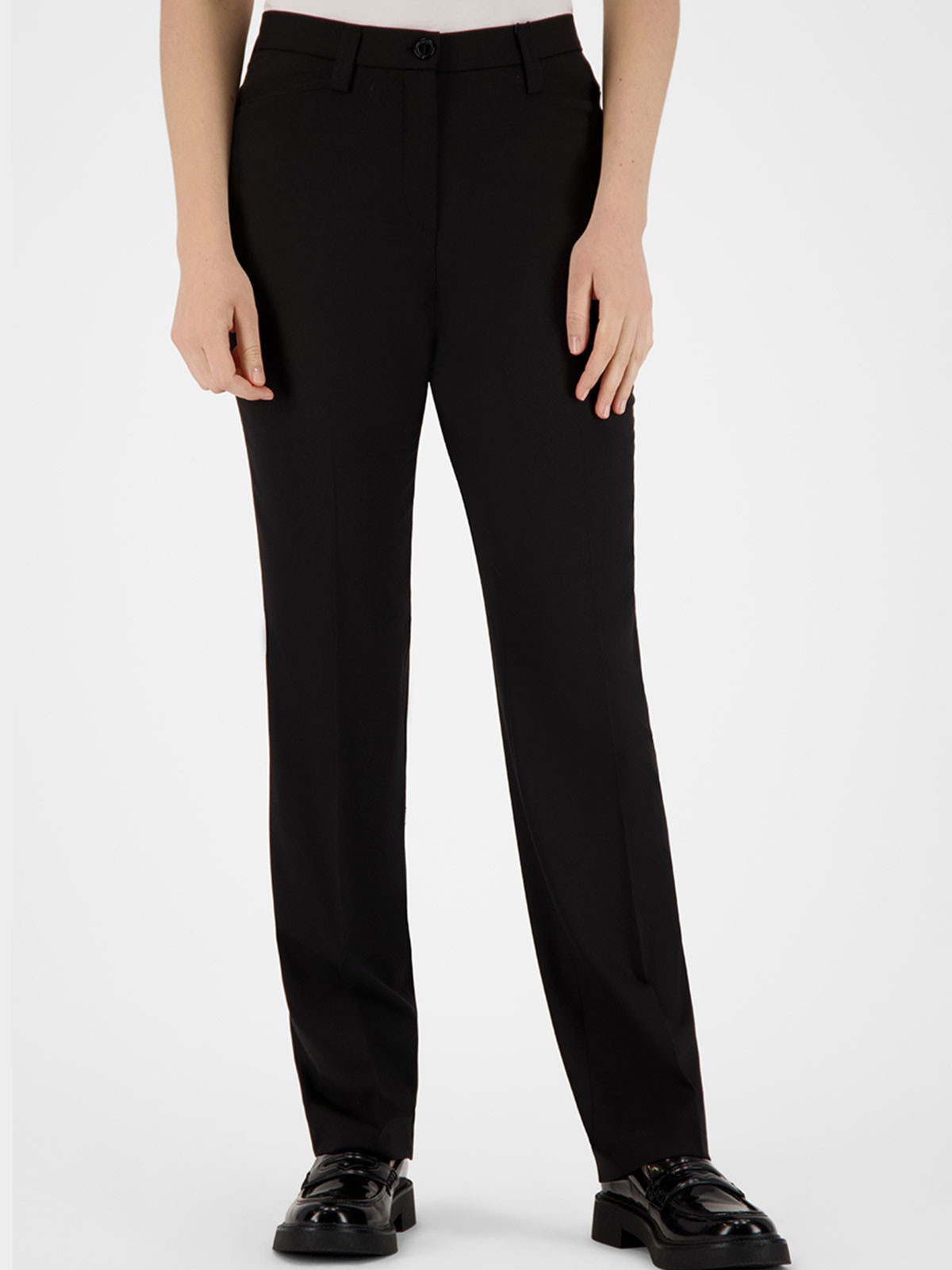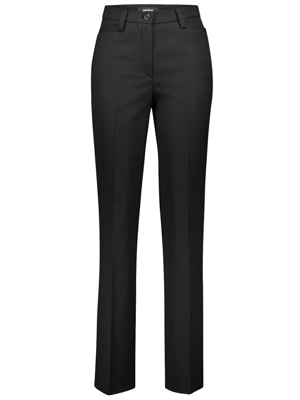 Elegant byxa från Gardeur i en ullmix. Modell Kayla, regular fit. Två snedställda fickor fram och en passpoalficka höger bak. Linning med hällor och byxorna stängs med knapp och gylf. Normalhög midja och rakt benavslut.