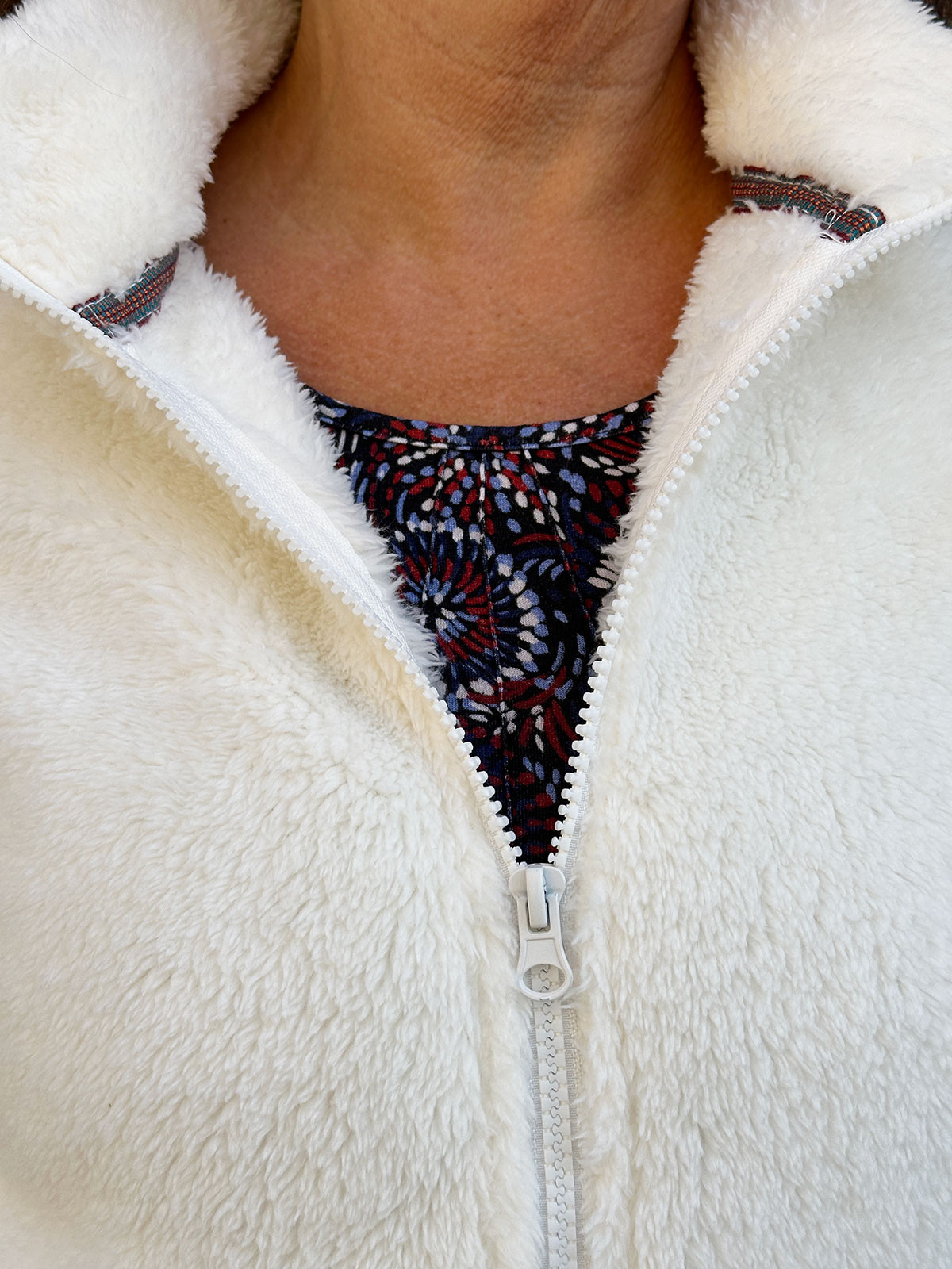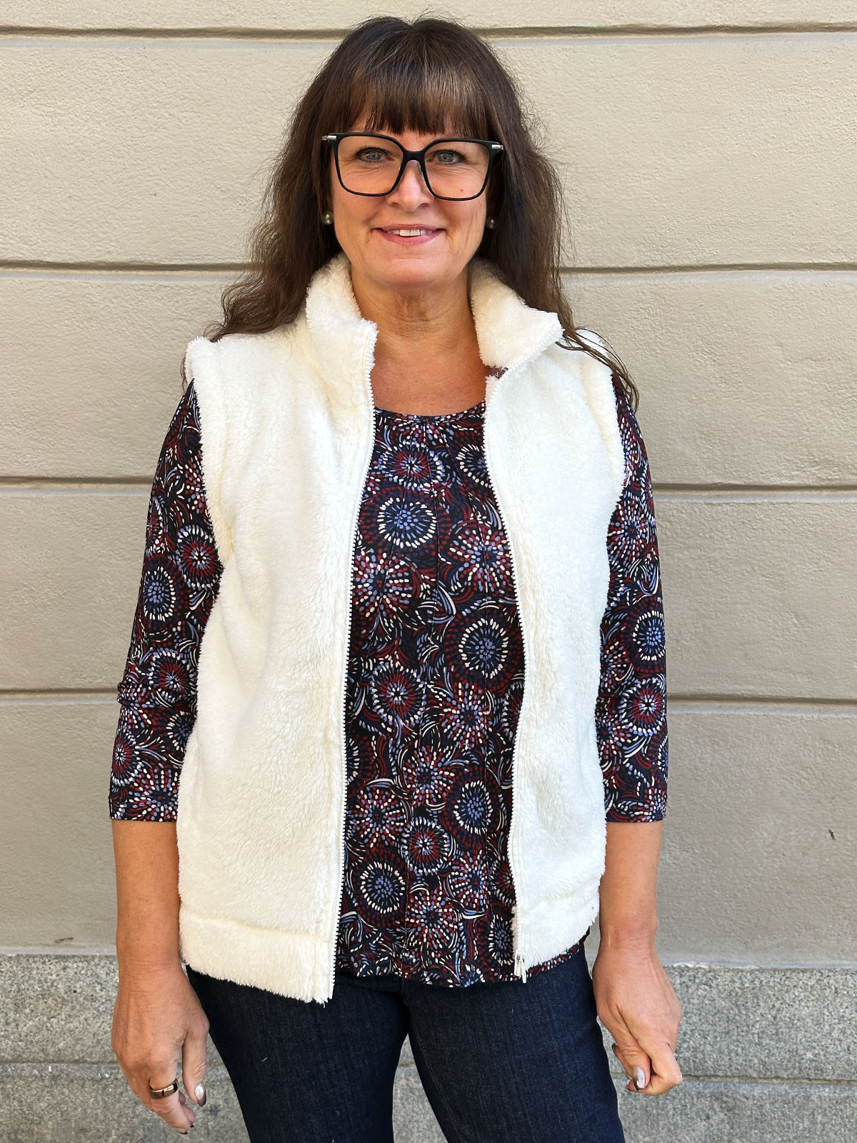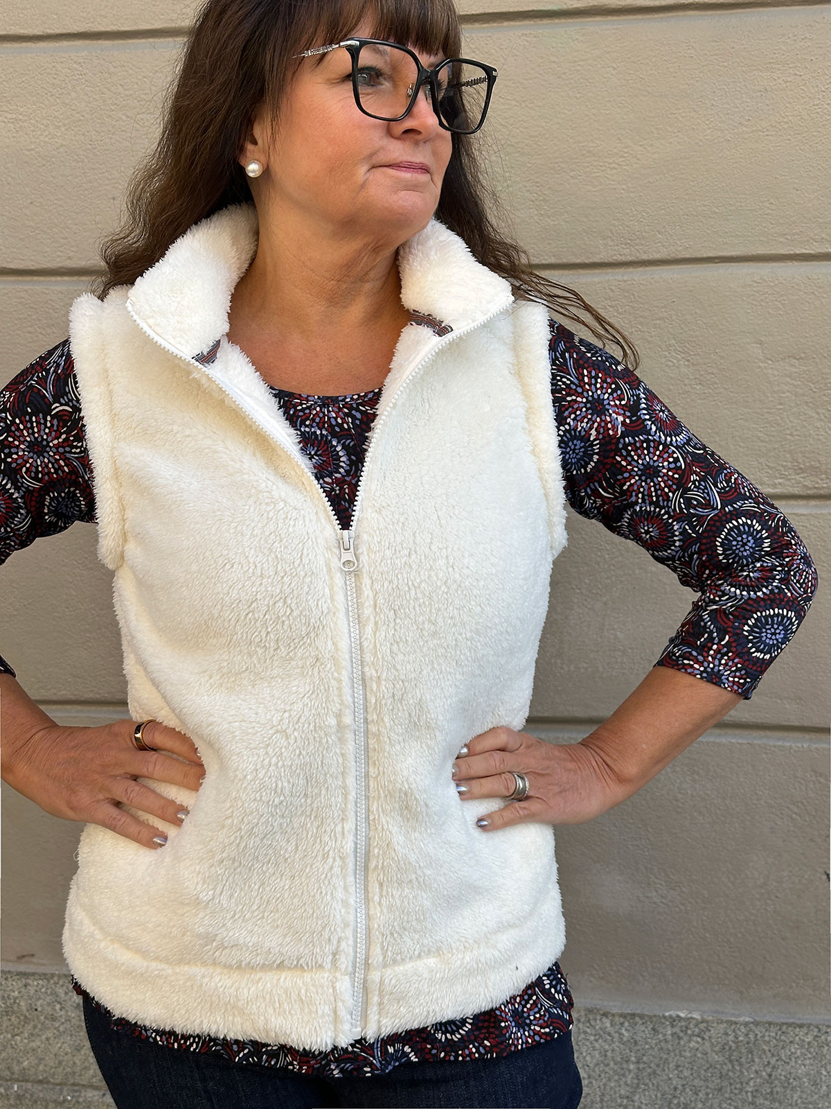 Supergosig teddyväst från M.X.O. Helt underbart mjuk på både in- och utsida. Modellen är rak och har en dragkedja fram som när den stängs ger en värmande ståkrage. Sidofickor, ofodrad.