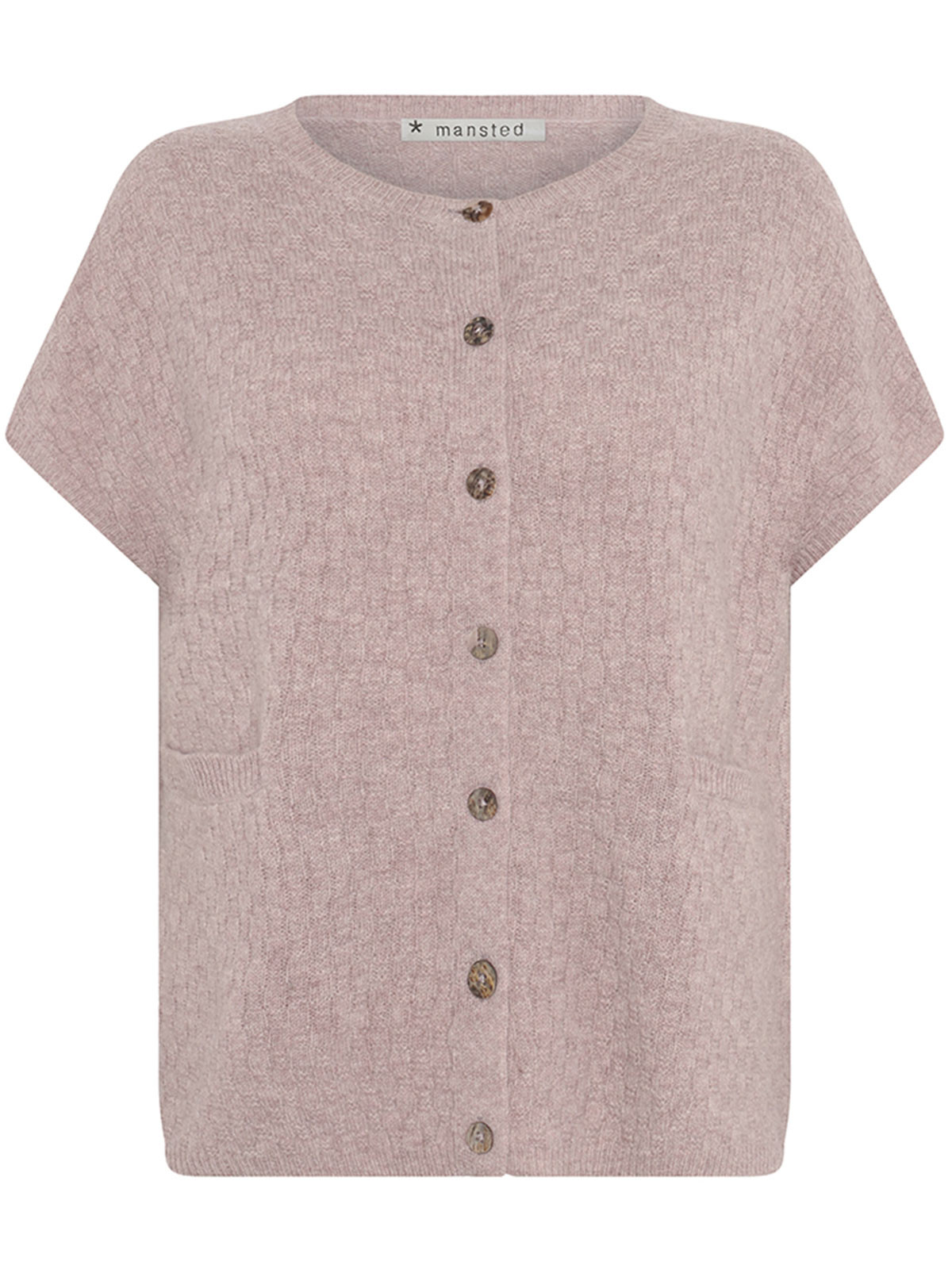 Mönsterstickad väst i 100% lammull från danska Mansted i en ljus rosa färg. Modellen är lite bredare för en avslappnad stil. Västen är avig- och rätstickade i ett rutmönster vilket ger hela plagget karaktär. På framsidan finns två fickor.