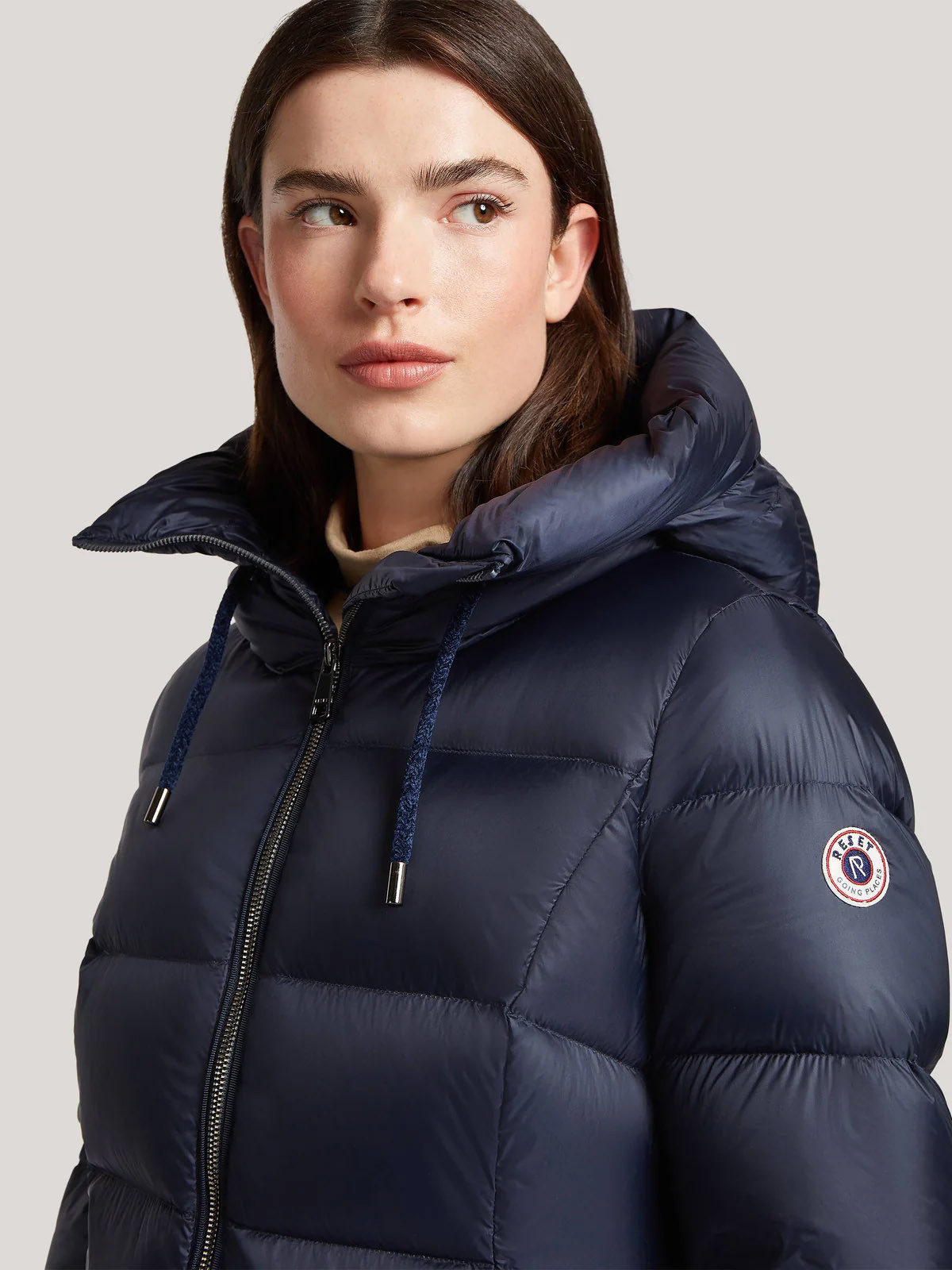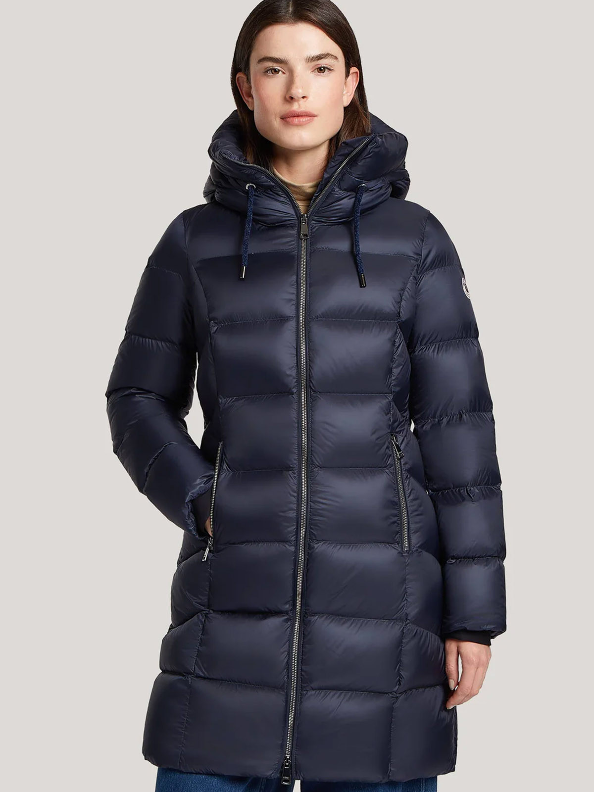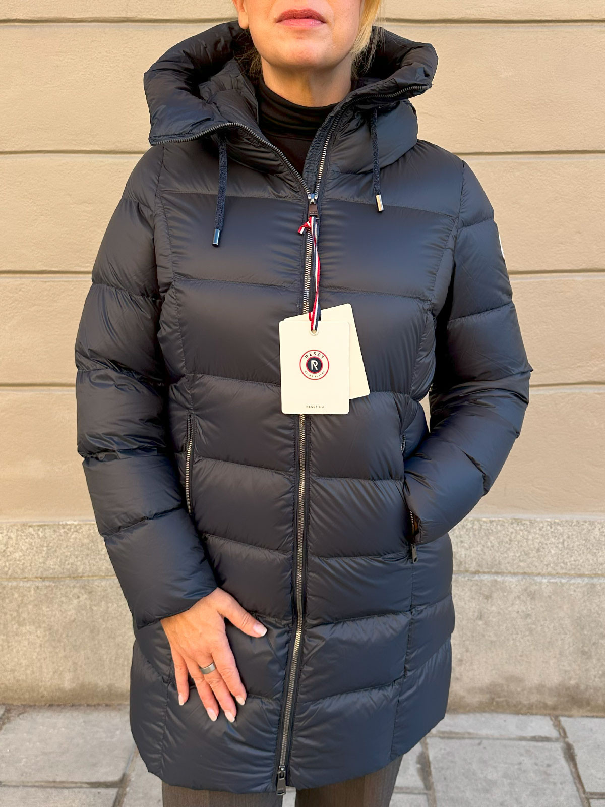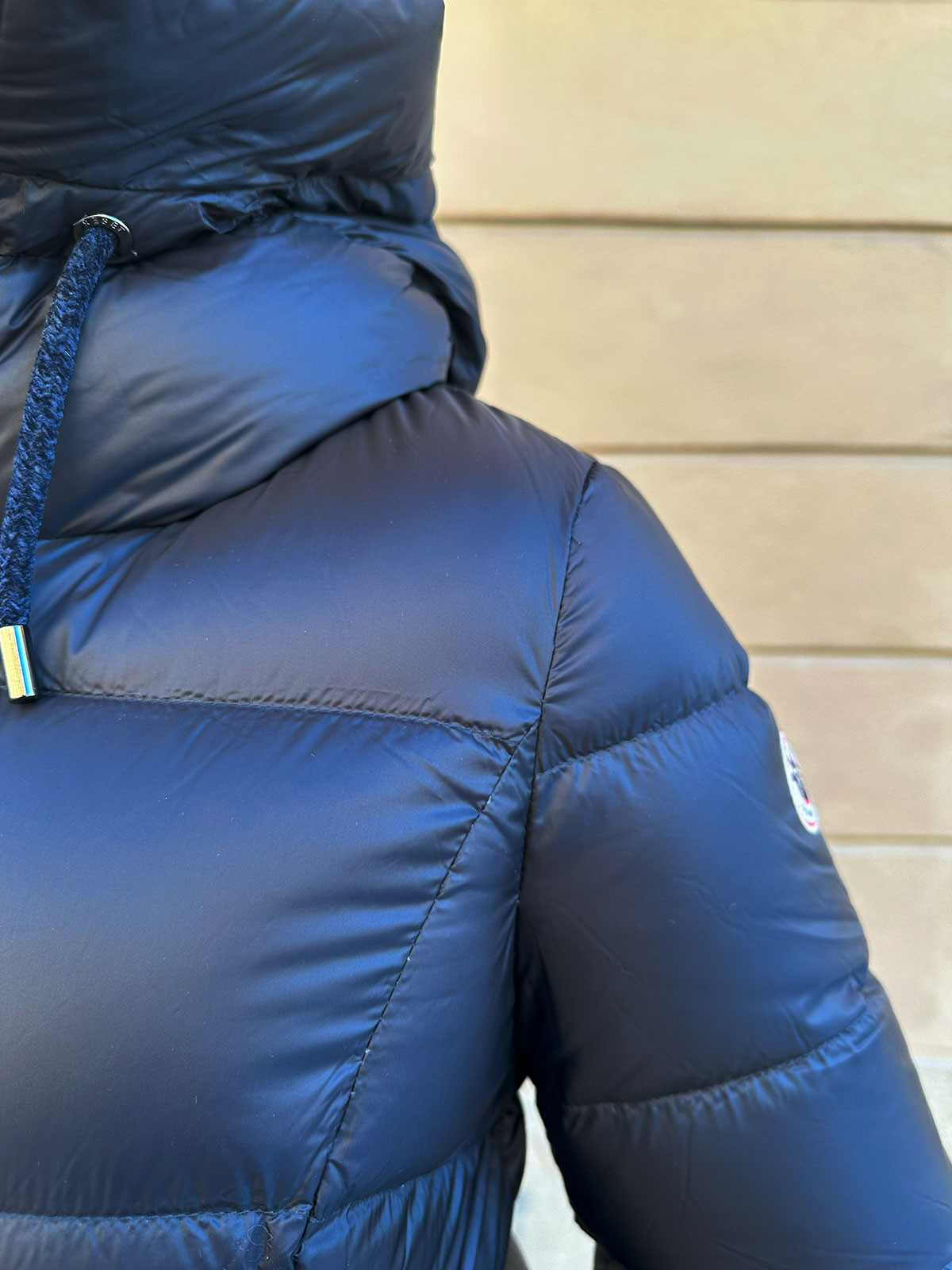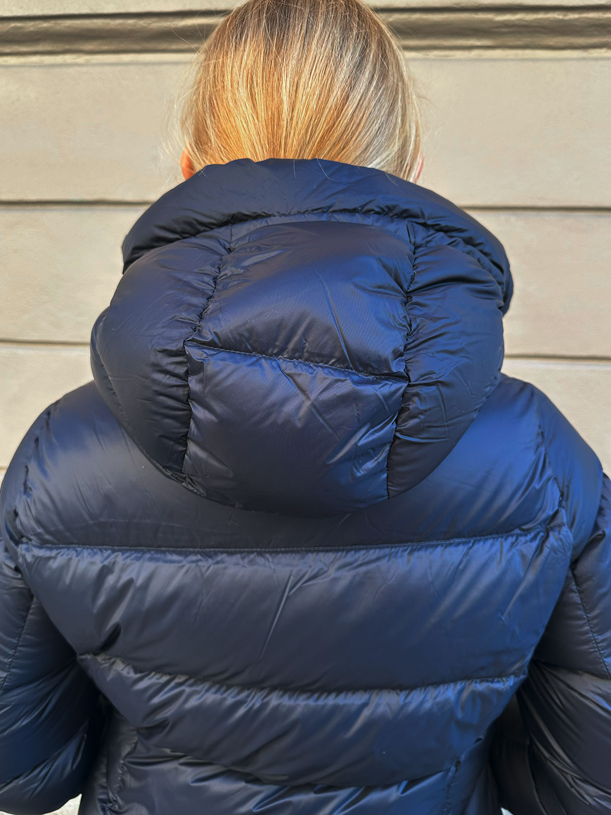 Härlig dunkappa att svepa in sig i när kylan kommer. Dragkedjan är av kraftig tvävägsmodell och på framsidan finns två snedställda fickor med dragkedja. Ärmarna har en smalare mudd för att håla snålblåsten ute. Den stora huvan har en bred dragsko för att hållas på plats.